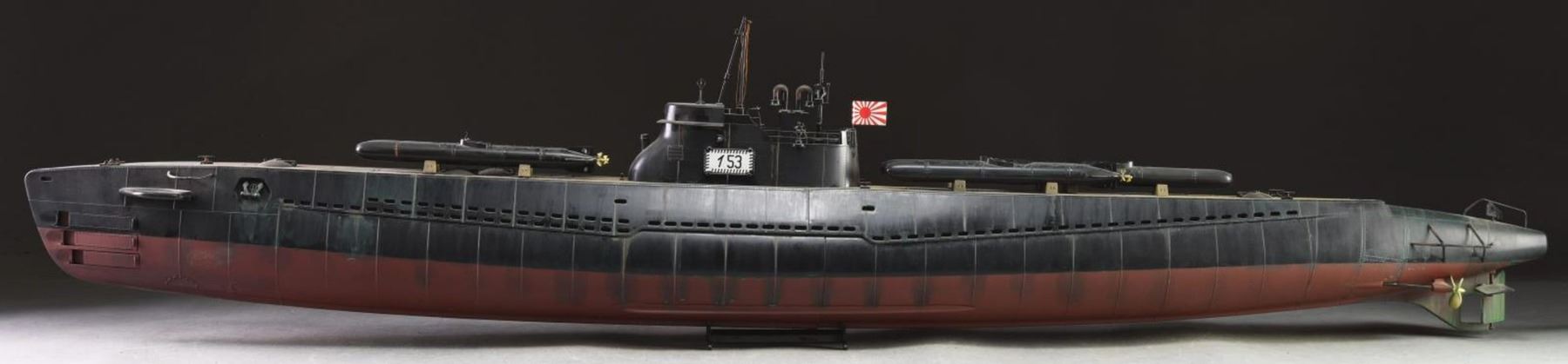 Large model of an Imperial Japanese Navy I-53 Kaidai Type KD3A class submarine. The KD3A class consisted of just 4 submarines, I-53, I-54, I-55, and I-58, with I-53 having gone on 3 wartime patrols during World War II before being hulked to serve as a IJN training vessel until the end of the war. This example is marked I 153" on either side of of the sail, with a Imperial Japanese flag mounted at the rear. The deck is mounted with 5 Kaiten torpedo suicide crafts. Hull has been painted, giving an appropriate water aged appearance. CONDITION: model retains bountiful amounts of its painted exterior and appears to retain all small parts and components, but should be handled with care. PROVENANCE: From the Lifelong Collection of Glen E. Mattox. (02-18700/MLW). $200-500.