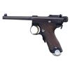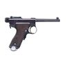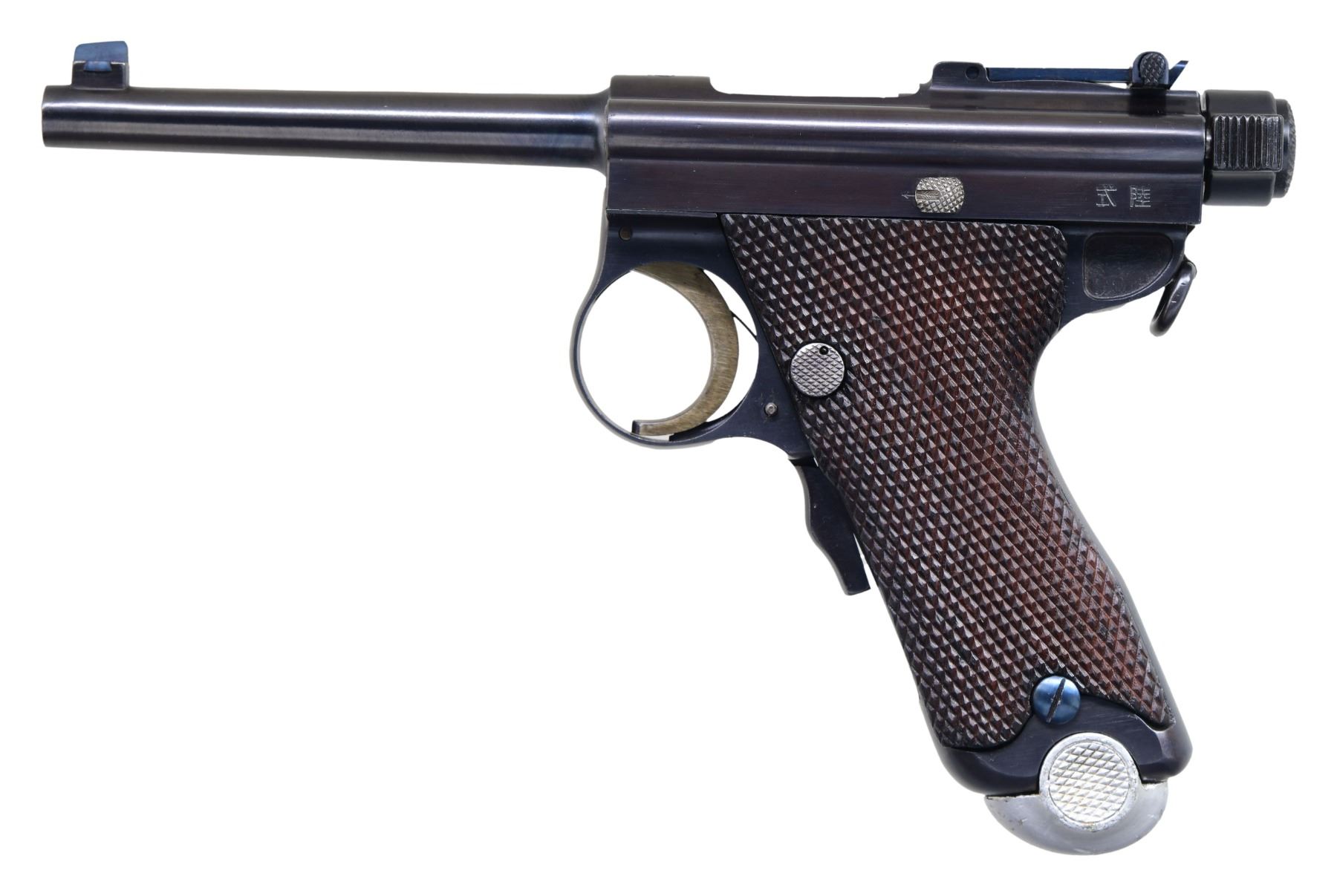 1902 "PAPA" NAMBU SEMI-AUTOMATIC PISTOL. Cal. 8mm Nambu. S# 5078. Bbl.4 3/4". Model 1902 Modified "Papa" Nambu semi-automatic pistol mfg. at Tokyo Artillery Arsenal. Top of the frame is marked with the Tokyo Artillery Arsenal insignia over the chamber. Left side of the frame is marked with Kanji characters denoting "Army Type" (although the Imperial Japanese army never adopted the Model 1902), with Kanji characters denoting "Nambu Type" above the S# on the right. Major metal components exhibit a professionally reapplied blue finish, with blade front sight, extractor, rear sight slide, and grip screws exhibiting a reapplied nitre blue finish. Trigger and sear bar exhibit a reheated straw finish. Bolt, firing pin, and locking block are polished in-the-white. Frame is mounted with 2-piece checkered wood grips, which appear to have been refinished at one time. Standard blade front sight, with tangent V-notch rear sight, graduated 1-5. All serialized parts are matching and include the frame, recoil spring guide, mag. release button, trigger guard assembly, bbl. / bbl. extension, ejector, locking block, bolt, firing pin, cocking knob, as well as the striker pin guide. MAGS: 1 replated non-matching 8-rd. S# on spine is mostly illegible. CONDITION: CONDITION: excellent, as professionally restored, with metal components retaining bountiful amounts of their reapplied finishes, exhibiting scattered spots of light to mild pitting beneath the finishes overall. Frame exhibits areas of moderate pitting beneath the grip panels. Bright bore, as refinished, exhibiting mild to moderate degrees of pitting, while retaining fair rifling throughout. Grips are slightly loose, exhibiting mild smoothing, with some scattered superficial marks from handling and storage, but otherwise remain sturdy and serviceable. Right grip panel exhibits a large indentation, some losses to the checkering around the mag. release button slot, as well as some chipping at the bottom of the panel. An attractive, professionally restored, Tokyo Artillery Arsenal Model 1902 "Papa" Nambu pistol. (24-6787/MLW). CURIO. $1,000-1,500.