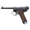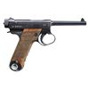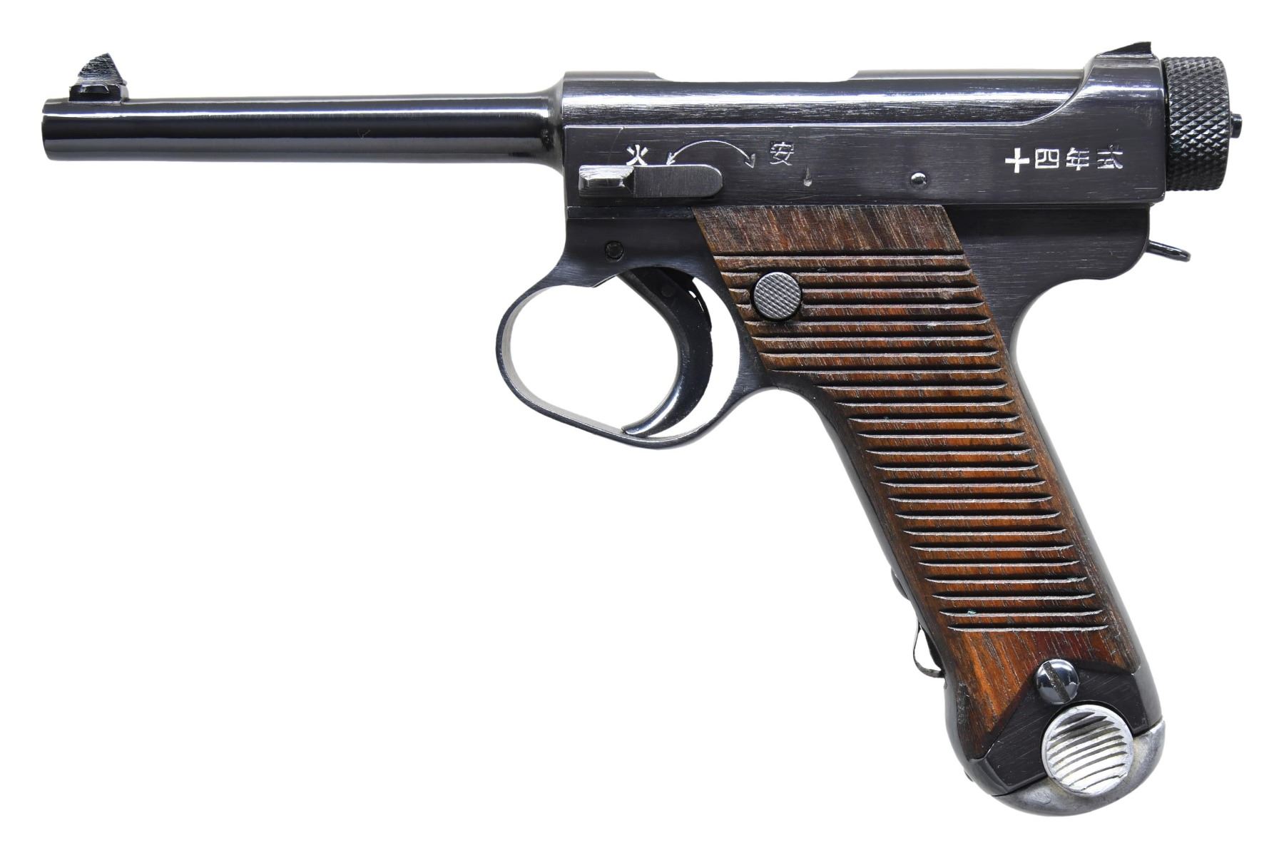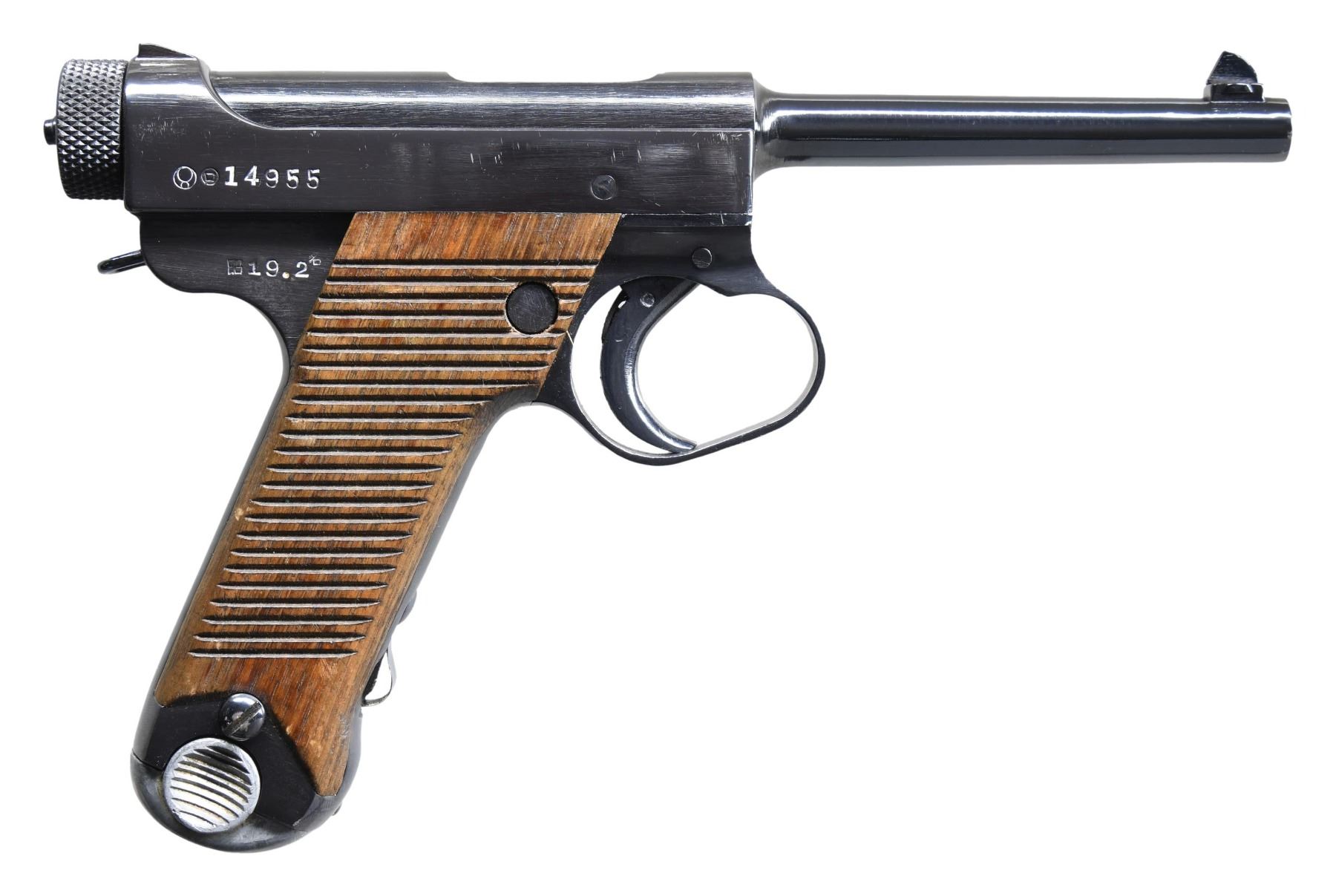 NAMBU SEMI-AUTOMATIC PISTOL. Cal. 8mm Nambu. S# 14955. Bbl. 4 5/8". Series II Type 14 Nambu semi-automatic pistol mfg. at the Toriimatsu arsenal under Nagoya supervision in February of 1944. The left side of the frame exhibits Kanji characters denoting the model designation, with the Nagoya arsenal insignia, Series II marking, and S# marked on the right, above the Showa date code "19.2". Metal components a reapplied high polish blue finish overall, save for on the bolt, which is polished in-the-white. Firing pin has been strawed at one time. Frame is mounted with 2-piece grooved wood grips. Standard dovetailed blade front sight, with fixed square notch rear sight. Large pattern trigger guard, with checkered cocking piece. All serialized parts are matching and include the frame, trigger, trigger guard, mag. release button, bbl. / bbl. extension, locking block, bolt, firing pin, firing pin extension, cocking knob, as well as the grips. MAGS: 1 non-matching (S# 820) plated 8-rd. CONDITION: metal components retain bountiful amounts of their reapplied blue finish, exhibiting a few superficial handling marks, as well as some light wear on the rear of the bbl. extension from cycling of the action. Mirror bore, retaining well defined rifling throughout. Grips show a few superficial marks from handling and storage, but otherwise remain very good to excellent overall. (25-2378/MLW). CURIO. $200-400.