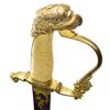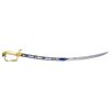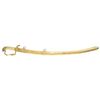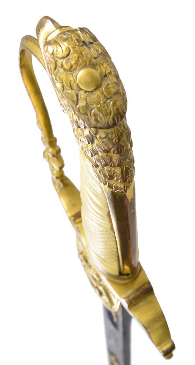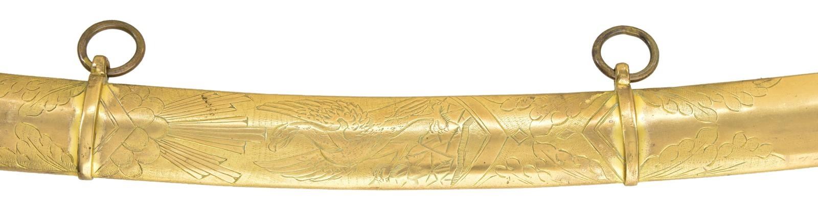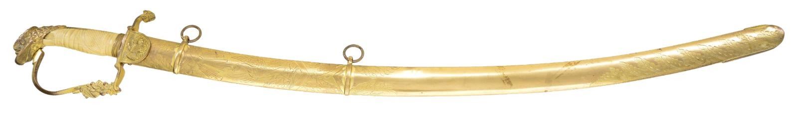 SWORD. This exceptionally attractive saber dates from about 1820 to about 1840 and has an overall length of 38" with a blade length of 31 3/8". The blade has a single wide fuller and boasts intense 3 color decoration. There are 2 etched foliate panels in white on each side, along with gold highlighted patriotic & foliate etching in 3 areas on each side. The field over the first 17" of the blade retains its vivid bluing. Gilded brass hilt has a fully articulated spread wing eagle on a large languet along with 23 stars. The quillon terminates acanthus leaves and the base of the knuckle bow is similarly decorated along with flags, a cannon barrel, and cannon balls. Large well executed eagle head pommel and faceted backstrap. Carved certifiably antique grip with cross hatching and horizontal ribbing. Heavily gilded solid brass scabbard with engraved rampant eagle. Several areas of the scabbard show engraved oak leaves particularly at the tip. CONDITION: blade is superb with just a few scattered minor stains. Hilt retains most of its original gilded finish. Grip has expected tight age cracks with a minor chip near the pommel. Scabbard has areas of original gilded finish and shows a few minor surface imperfections, but no notable dents. PROVENANCE: From the Lifelong Collection of Glen E. Mattox. (02-18390/BF). $2,500-4,000.