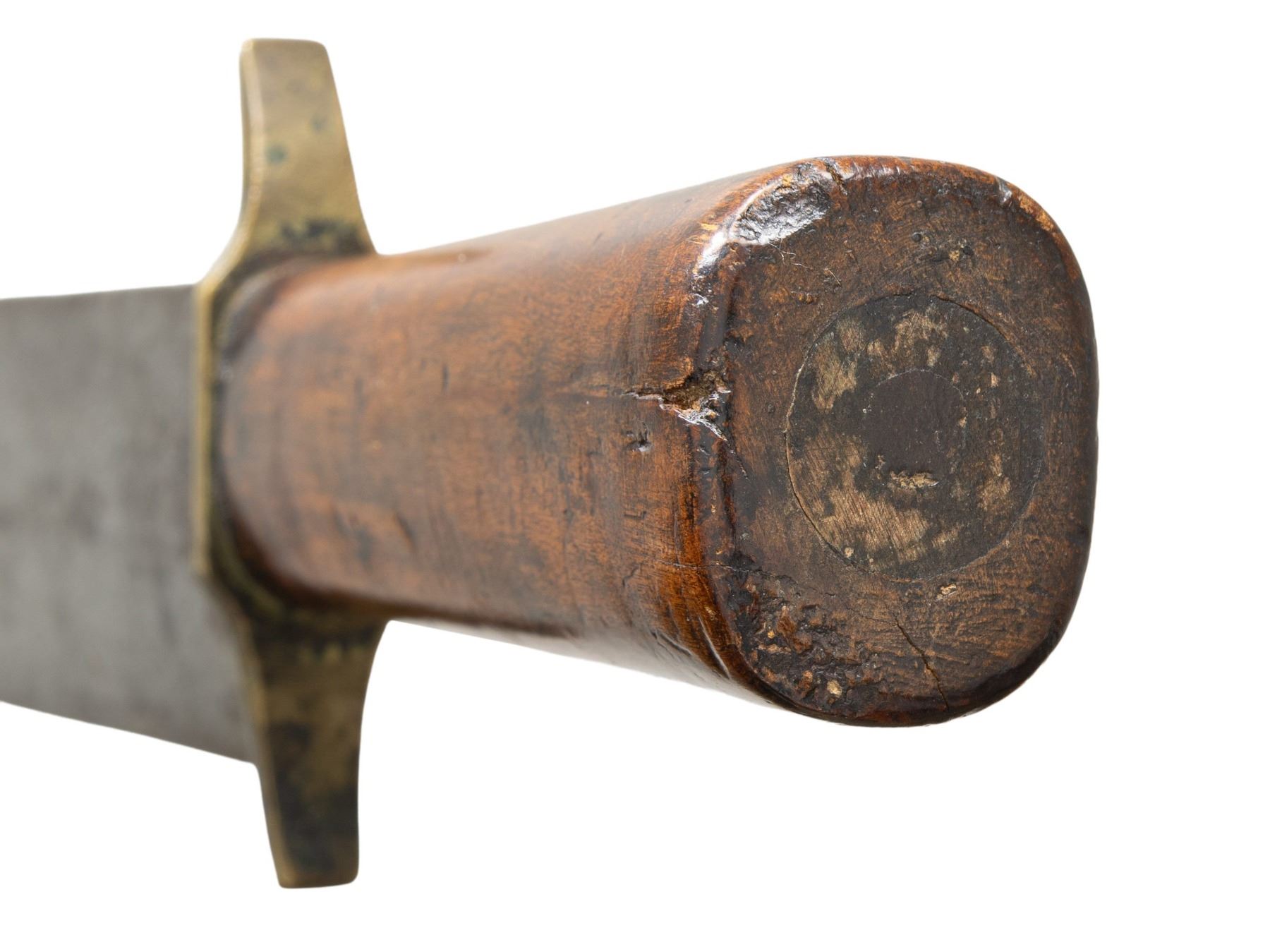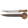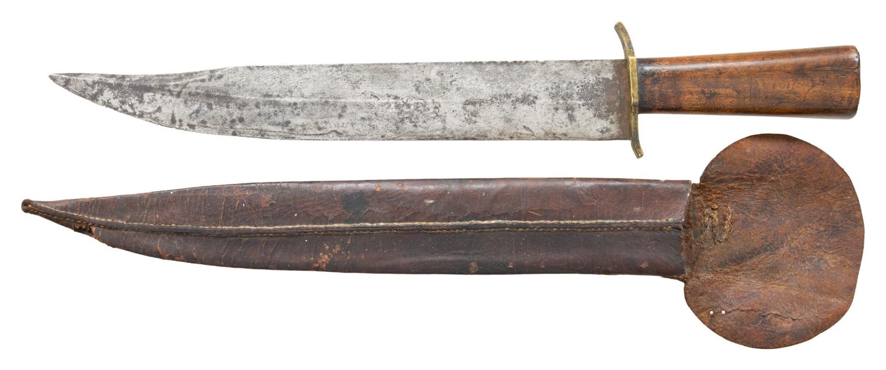 KNIFE. 17.5" overall, 12.75" heavy clip point blade, 1.8" wide, .28" thick, 4" partially sharpened clip, 3.5" filed slight "S" shaped brass cross guard, tapered maple handle, penny sized brass inset pommel cap, brown leather sheath with integral . More refined clip point than most Confederate knives but has the heft and size often seen. CONDITION: very good overall, blade stained and light pitting, accompanying sheath is about 2" too long. PROVENANCE: James R. Johnston collection. (02-26004/JS). NON-GUN. $4,000-6,000.