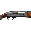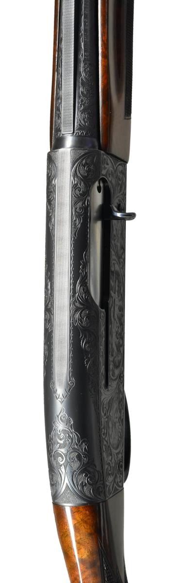 AUTO LOADING SHOTGUN. Cal. 20 Ga. S# 3800001. Custom shop engraved recoil operated shotgun. Bbl. 26" vent rib w/ white target front sight & fixed Mod choke. Action has full coverage F grade factory hand engraving. Right side viginettes feature a flushing pheasant, 2 pointers & a flushing partridge. Left side viginettes feature a woodcock, 2 setters & a draped mallard. Balance of receiver sides & top have vine type foliate scroll w/ stippled backgrounds. Complimenting scroll engraving extends to trigger guard bow & breech end of bbls. Forearm & plastic cap pistol grip stock of gloss finished fancy walnut have fancy segmented point pattern hand checkering. Oval nameplate in toe line is marked w/ initials “M.H.D.”. LOP: 13 7/8" over original buttplate. WEIGHT: 6 lbs, 15 ozs. The Sportsman 48 was mfg. 1931-1949. CONDITION: near excellent retaining over 98% blue. Trigger guard bow has a series of small nicks of left side. Very good original wood finish showing small spots of wear w/ scattered light marks. Bright near excellent bore. (23-465/DS). CURIO. $7,000-10,000.