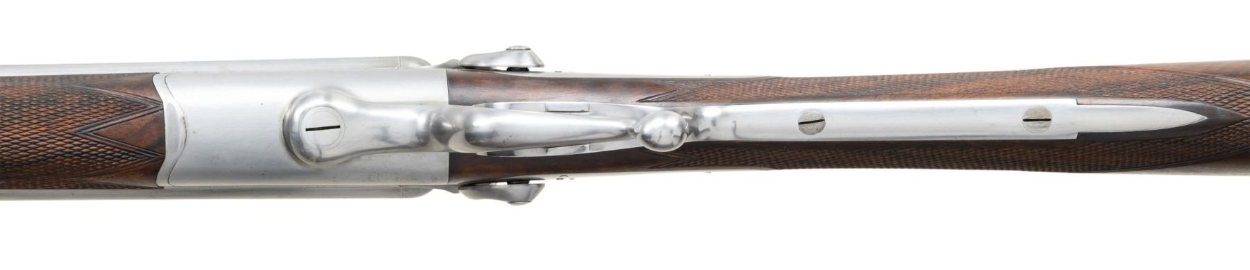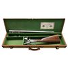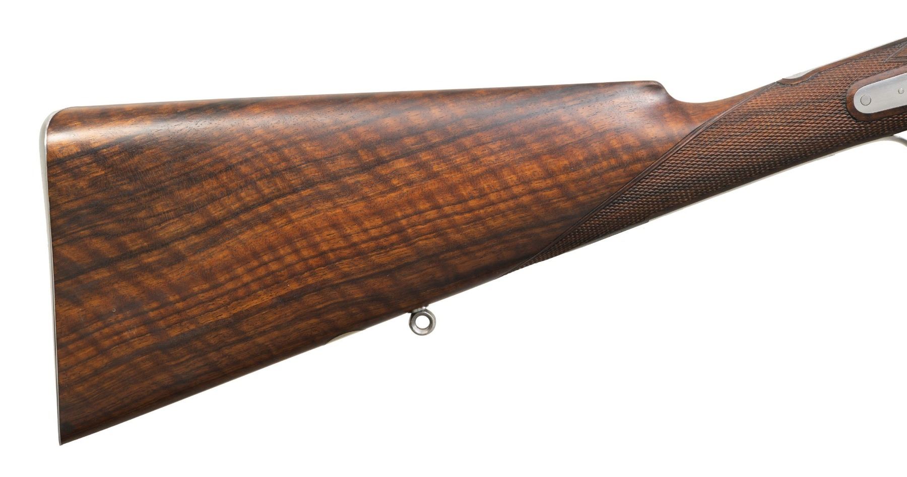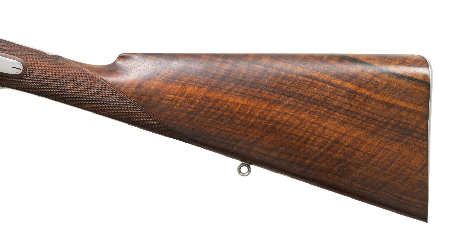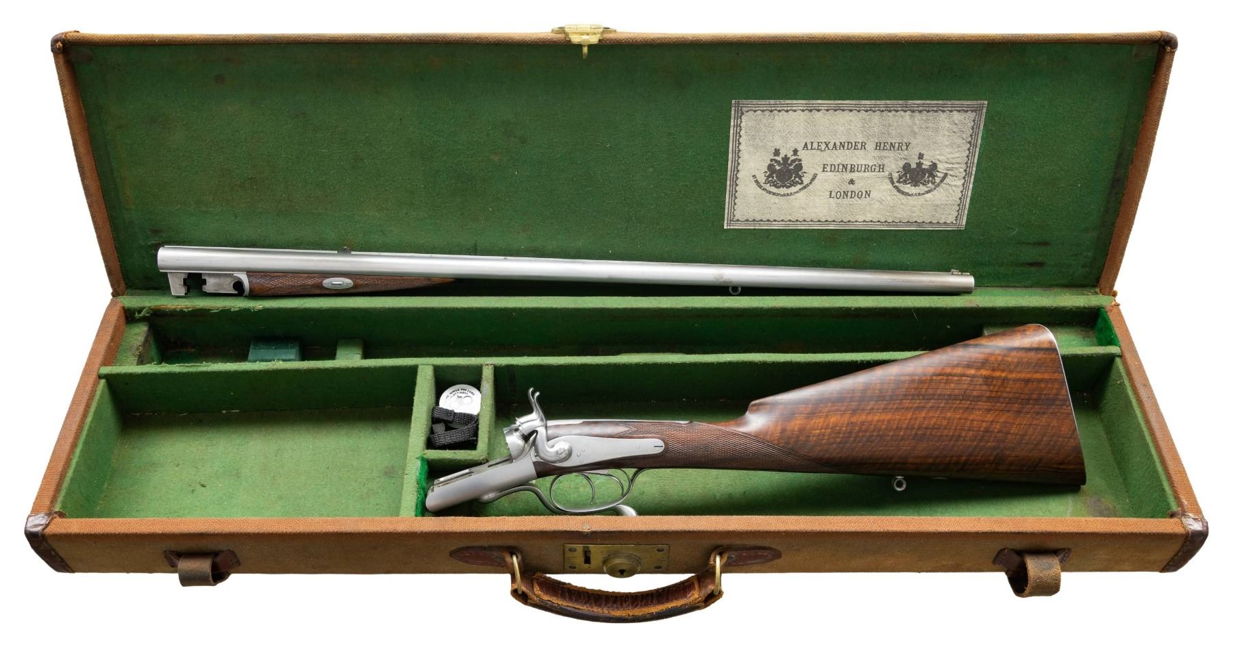 UNDERLEVER WITH CASE. Cal. 360 2-1/4" BPE. S# 5135 (Alexander Henry records indicate that this serial number was a "best" double centerfire gun in 10 bore) . The 25-7/8" barrels with raised rib are fitted with newer "U" notch rear and original silver bead sights. Barrel flats are stamped with London black powder proofs. Bottoms of barrels are stamped "HENRY'S PATENT" and with barrel use numbers "116A" and "117A". S# is on splinter. Round bodied Jones underlever action has peninsula back spring locks with serpentine non-rebounding uncheckered hammers. Action has never been hardened or engraved and is completely unmarked except for London view proofs on watertable. Straight grip buttstock of very finely fiddle figured European walnut measures 14-1/2" over steel buttplate. Usual high quality checkering is at grip. A sling eye and vacant silver oval are on toeline. Matching splinter forend with horn tip has captive side bolt release through oval steel escutcheons. UNATTACHED ACCESSORIES: rifle is housed in tan canvas and leather case marked "A.H." on top. Case is lined in green cloth and reproduction Alexander Henry label is in lid. Case contains: a small jar of hinge pin lube and original key. CONDITION: very fine essentially "as new" unfinished; never engraved, blued or hardened. Stocks sanded and checkered with final oil finish yet to be done. Bores are bright, sharp and shiny. Action is tight; locks are crisp. Case shows considerable soiling and rubs. Straps and handle are fair to good. Interior cloth is good considerably soiled and rubbed. PROVENANCE: From the Buckstix Collection. (01-28617/MGM). ANTIQUE. $3,000-5,000.