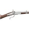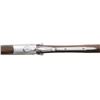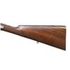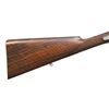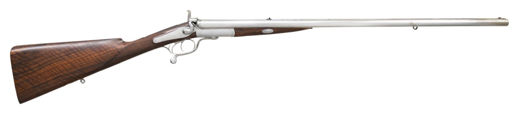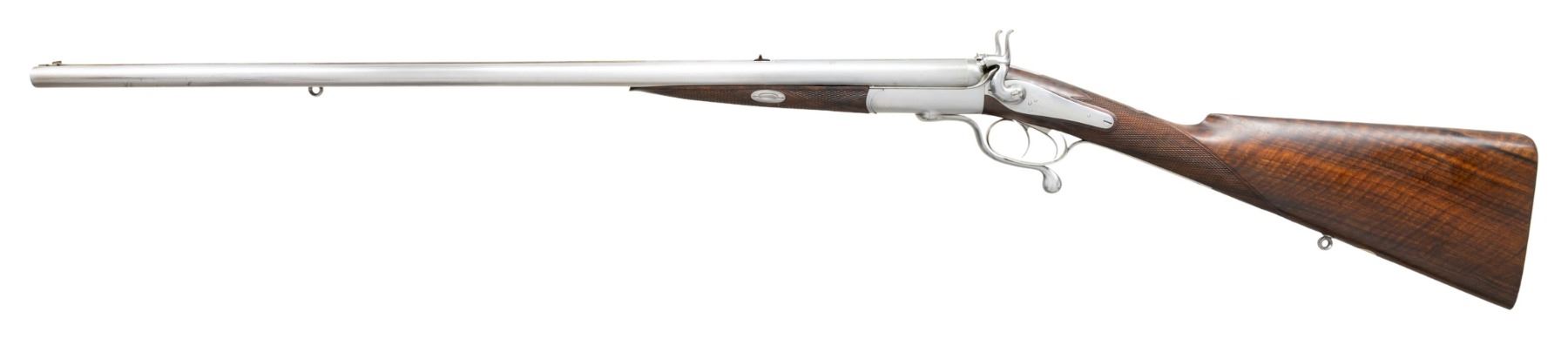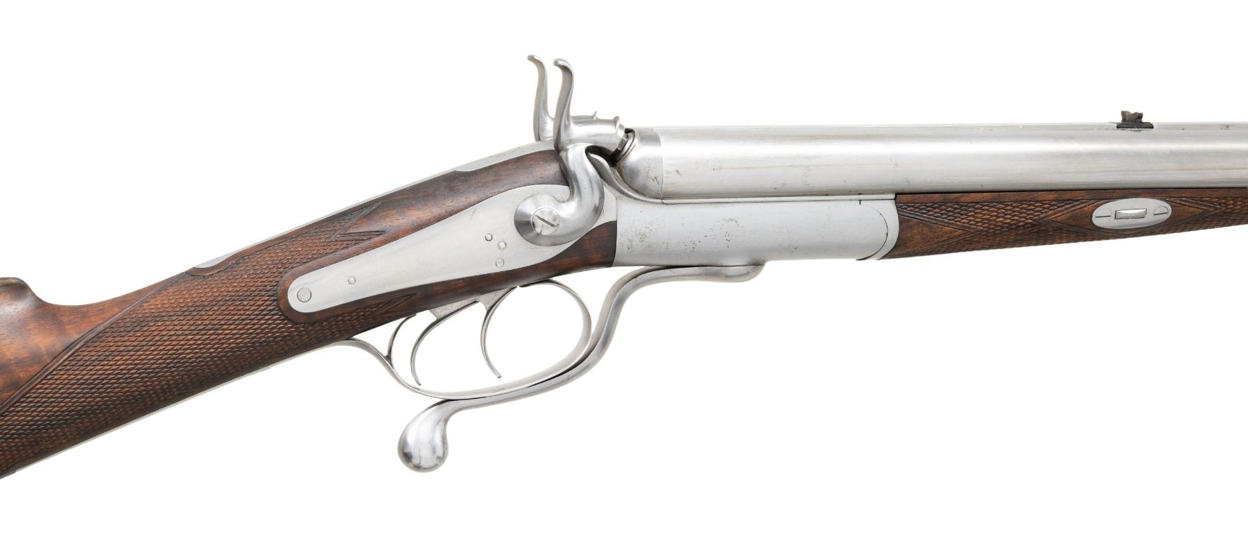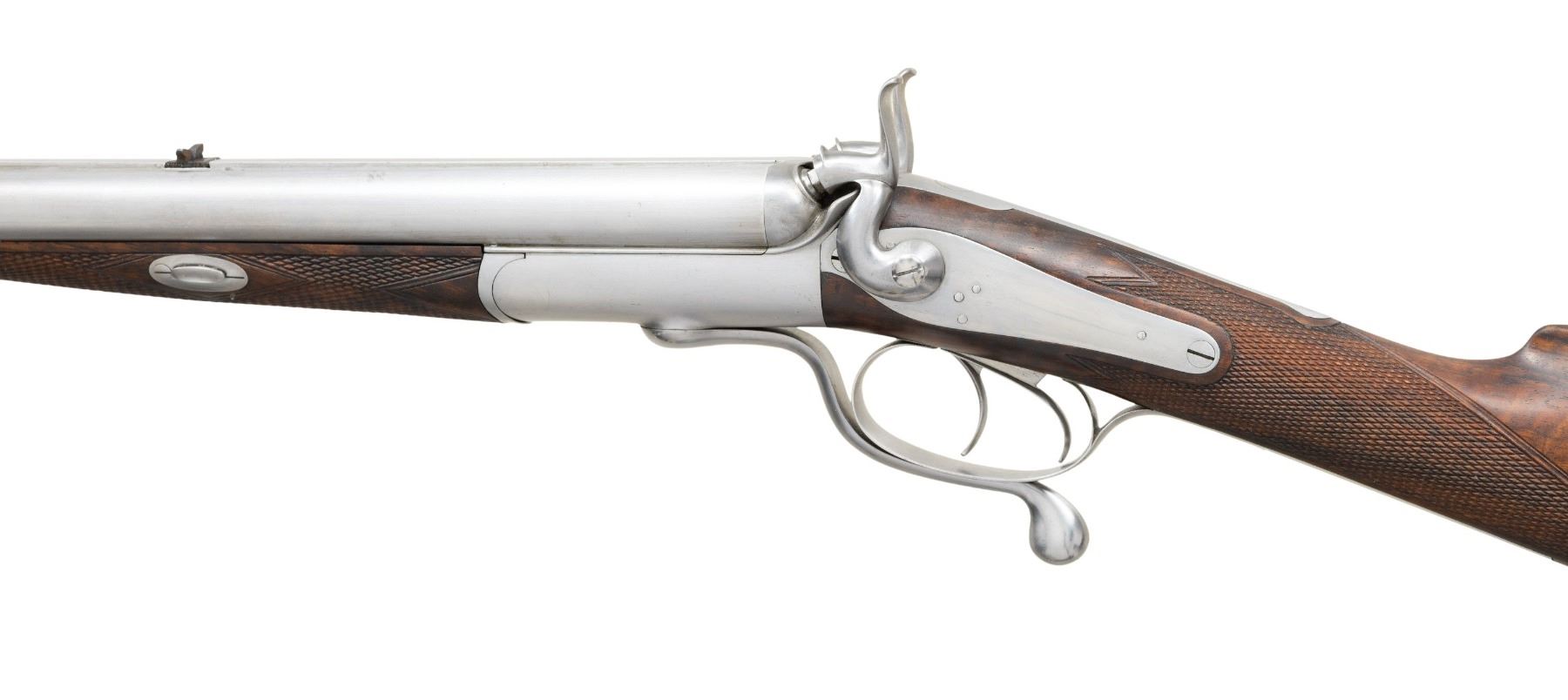 UNDERLEVER WITH CASE. Cal. 360 2-1/4" BPE. S# 5135 (Alexander Henry records indicate that this serial number was a "best" double centerfire gun in 10 bore) . The 25-7/8" barrels with raised rib are fitted with newer "U" notch rear and original silver bead sights. Barrel flats are stamped with London black powder proofs. Bottoms of barrels are stamped "HENRY'S PATENT" and with barrel use numbers "116A" and "117A". S# is on splinter. Round bodied Jones underlever action has peninsula back spring locks with serpentine non-rebounding uncheckered hammers. Action has never been hardened or engraved and is completely unmarked except for London view proofs on watertable. Straight grip buttstock of very finely fiddle figured European walnut measures 14-1/2" over steel buttplate. Usual high quality checkering is at grip. A sling eye and vacant silver oval are on toeline. Matching splinter forend with horn tip has captive side bolt release through oval steel escutcheons. UNATTACHED ACCESSORIES: rifle is housed in tan canvas and leather case marked "A.H." on top. Case is lined in green cloth and reproduction Alexander Henry label is in lid. Case contains: a small jar of hinge pin lube and original key. CONDITION: very fine essentially "as new" unfinished; never engraved, blued or hardened. Stocks sanded and checkered with final oil finish yet to be done. Bores are bright, sharp and shiny. Action is tight; locks are crisp. Case shows considerable soiling and rubs. Straps and handle are fair to good. Interior cloth is good considerably soiled and rubbed. PROVENANCE: From the Buckstix Collection. (01-28617/MGM). ANTIQUE. $3,000-5,000.