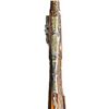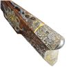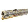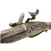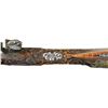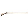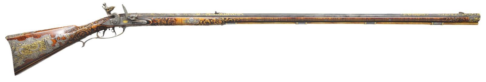 FLINTLOCK RIFLE. Cal. Approx. 50. S# 143. Judson Brennan is an Alaskan based contemporary custom gun maker known for his ornate American Long Rifles & Kentucky style pistols. He is considered by many to be among the world's best. This rifle may be the finest example of his outstanding abilities. Bbl. 47" double taper octagon measuring 15/16" across flats at the muzzle. The top flat has a silver inlaid nameplate marked “Judson J. Brennan Fecit #143”. The first 15 1/2" from the breech end of the bbl. & 11 1/2" from the muzzle have deep relief vine type foliate scroll hand engraving on the top 3 flats. Punch dot backgrounds through the primary portions of the engraving are gold finished. Forward section of breech engraving & rear section of muzzle engraving consists of gold inlaid leaf scroll. Breech end of bbl. has gold rectangle marked “INR” forward of a wide gold band. Top tang has complimentary scroll engraving. The sculpted lock plate has full coverage foliate scroll engraving surrounding a gold oval marked “J/Brennan/Sons”. The scroll engraving continues to the hammer, clamp & frizzen. The gold bordered flash hole leads to a gold lined pan. The curled double set triggers have pierced & curled rear facing ornamentation. The external adj. screw has a grooved ball style head. The extremely ornate full length stock of extraordinary fiddle figured maple is fastened w/ 5 wedges. Left side of stock rear of & below the mouldered cheek piece is covered w/ deep relief carved foliate scroll that extends around wrist & head sections sweeping forward of the lock plate. Matching sections of scroll are found around the thimble & near the forearm tip. The ramrod channel has ornate relief cut mouldered borders as does the toe line. The stock is topped off by extensive ornate fittings & inlays. Pierced rectangular lid patch box has ornate sculpted edges & scroll finial w/ full coverage foliate scroll engraving. The patch box lid has sections of gold & silver inlaid floral engraving. The crescent steel buttplate has an extended pierced foliate scroll finial w/ complimenting engraving having a wide gold band between peak & finial. Rear of buttplate has extensive gold & silver inlaid floral engraving surrounding a banner marked “DETH TO TYRANTS”. Finial tipped toe plate, trigger plate, curled trigger guard, sideplate & nose cap have complimentary gold & silver filled scroll. The ornate wrist plate is fashioned of relief carved German silver. The cheek piece plate features a medallion w/ a gold inlaid American eagle surrounded by 13 gold stars. The plate is bordered w/ pierced scroll having silver leaf & gold washed punch dot backgrounds. The rear stock wedge has ornate foliate scroll escutchens w/ gold & silver highlights. All 5 wedges have clamshell engraving on their heads. The ornate thimble has an octagon shaped forward portion w/ gold band transition to scroll engraved rear section. The hickory ramrod is held by 3 octagon pipes w/ gold banded transitions at both ends. Dovetail mounted front sight is complimented by a fixed square notch rear sight w/ engraved base & ornate finial. Overall length is 63 1/8". Weight is 11 pounds & 4 ounces. UNATTACHED ACCESSORIES: this rifle is accompanied by outstanding handmade accoutrements. The hand stitched leather possibles bag has a hand decorated front cover featuring cross hatch & floral designs. The strap has a wide shoulder pad w/ matching floral & cross hatch ornamentation having scalloped leather trim. The forward strap has attached leather scabbards for a stiletto w/ 9" rectangular blade & drop point knife w/ 4" blade. The stiletto has an ornate octagon shaped wood handle w/ carved wooden fence. The ricasso is marked w/ the number “118” & hand engraved decoration that extends onto the 4 sides of the blade. The knife has a circular pommel w/ floral engraving that matches the rifle featuring 13 gold inlaid stars around the butt end. The curly maple handle has multiple relief carved grasping grooves around its circumference. The spine of the blade is engraved “J.BRENNAN”. Underside of the ricasso is marked “# 118”. The ricasso & rear portions of the blade have foliate scroll engraving w/ gold punch dot backgrounds leading to a gold line transition at the handle. Suspended from the shoulder strap is a German silver adj. powder measure & spectacularly ornate powder horn. The horn measures 16" around the outside from the spout to rear cap. The octagon faceted spout, front swivel, escutchens, transitional front band & rear band are fashioned from German silver w/ scroll engraving matching that of the rifle. The steel butt cap has complimentary engraving w/ gold punch dot backgrounds. The 9 1/2" primary section of the horn has exquisite full coverage scrimshaw featuring an American eagle w/ a shield having 13 stars. The eagle’s claws are grasping a banner marked “LIBERTY AND PROSPERITY”. The large primary banner quotes the Book of Mark Verse 8:36 “For What Shall It Profit A Man If He Shall Gain The Whole World And Lose His Own Soul?”. The possibles bag contains a German silver priming flask w/ matching engraving, gold punch dot backgrounds & an American eagle. A leather pouch contains 8 spare flints & an engraved silver handled turn screw. Additional accessories include a leather pouch containing .485" round balls w/ engraved German silver mouth & ornate maple plug, patch jag & patch screw as well as pillow ticking & cloth patches. Copy of an undated letter from Judson Brennan to the purchaser is included. The letter starts out “Well here it is at long last! I hope you like it.”. The 2 page letter discusses loading instructions & accessories. It ends w/ “Well anyway, hope you enjoy this stuff! Thanks Jud.”. CONDITION: near excellent as built & finished. The bbl., lock & iron fittings are finished w/ an appropriate antiqued gun metal gray appearance. The breech end of the bbl. near the flash hole shows light corrosion f