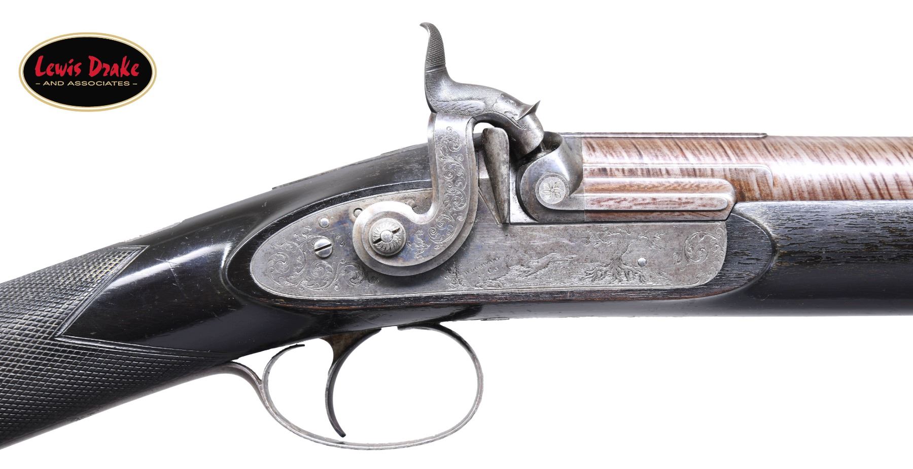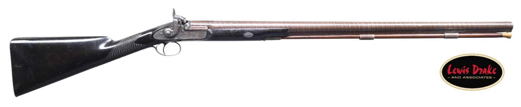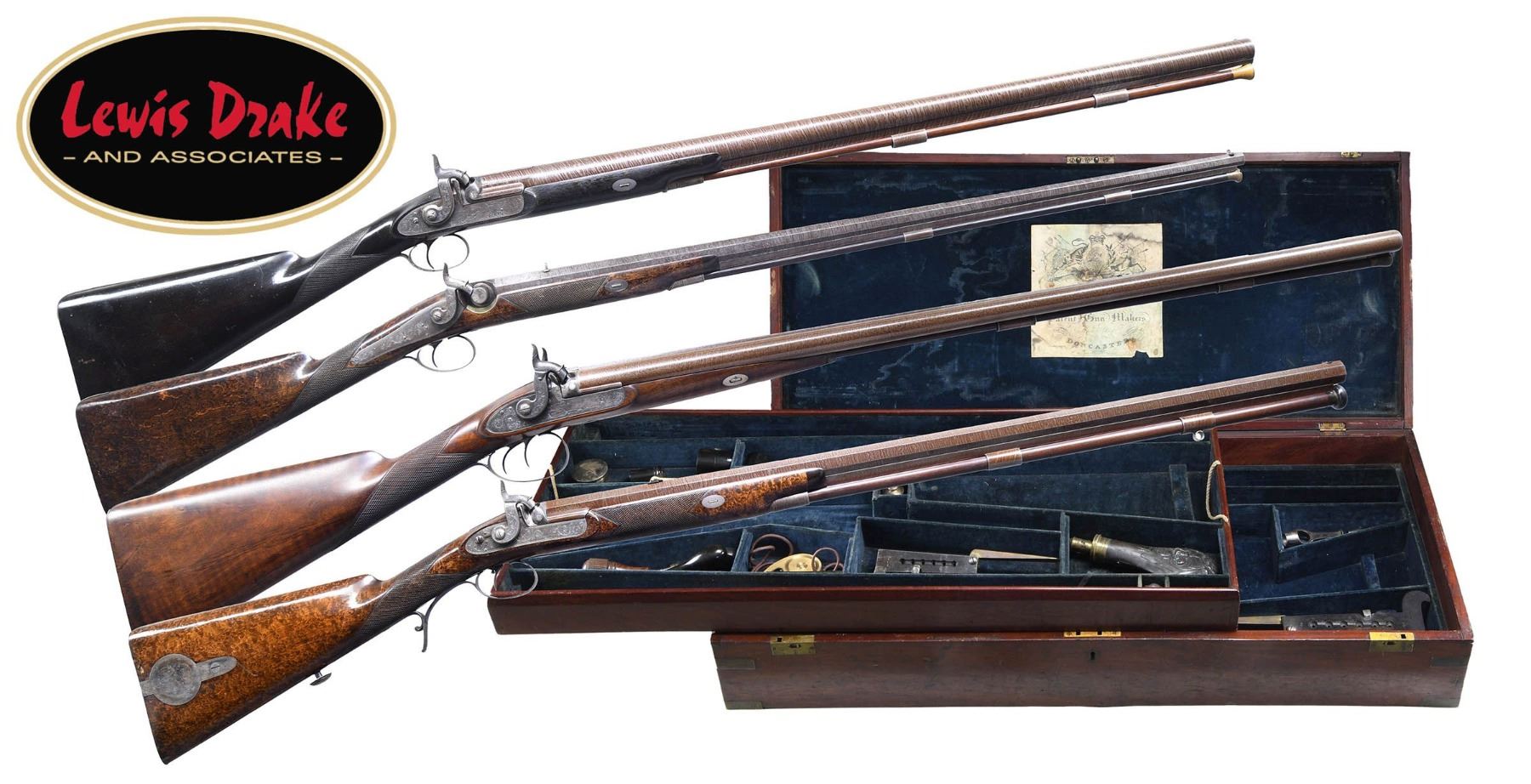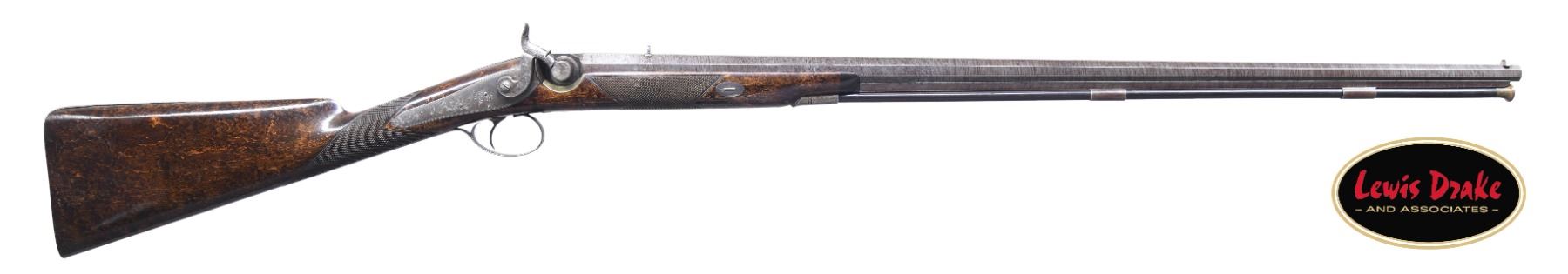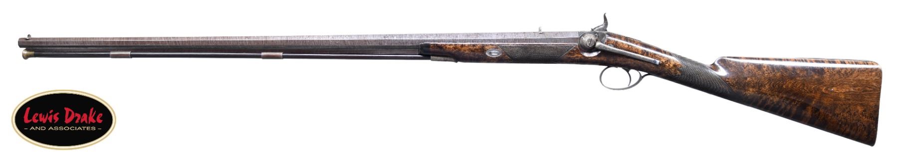 (3) Cal. .40 (with deep multi-groove rifling). S# NSN. Rare and pretty damn neat small bore percussion breech loading rifle with spare breech plug to convert back to muzzle loading. The 31" twist steel sharply tapered octagon barrel fitted with single standing rear and tall blade front sights, is engraved "Gun Makers Doncaster" on top flat. It appears rifle was converted to a tap-action breech loading system at a later date. Breech loading mechanism consists of large breech plug holding transverse rotating cylinder with right side fitted with percussion nipple. Cylinder is rotated by hinged handle that snaps into spring loading retaining catch on left side of grip. Top of breech plug is engraved "Patent" and with some well cut scroll. Interchangeable breech plug with non-vented platinum blow out has platinum lines at front and back and is engraved with scroll matching breech iron. Birmingham black powder proofs are on bottom flat of barrel. Breech iron is nicely scroll engraved. Back spring percussion lock with flat faced hammer having dolphin head is also scroll engraved. "Woodward & Co" is at top rear. Trigger plate has small pineapple type finial which has foliate engraving. Trigger guard is also scroll engraved matching lock. Spectacular birdseye maple (a popular wood for guns and rifles ca. 1830) straight grip half stock with horn tip measures 14" over steel buttplate with long top tang engraved with dog scene. Flat top point pattern checkering is at grip. A silver oval engraved with goat and "HB" is at top of grip. Stock attaches to barrel with captive sidebolt through oval silver escutcheons. Ebony ramrod with brass tip and tail mounts through two plain pipes and matching thimble. MEASUREMENTS: STOCK: DAH: approx. 1-5/8". DAC: approx. 1-3/8". CAST: neutral. LOP: 14". WEIGHT: 5 lb. 13 oz. CONDITION: fine. Barrel retaining most of its original twist finish considerably faded and speckled. Breech plugs retain over 60% of their original case hardening color. Lock, breech iron and trigger plate are a French gray. Buttplate has some blue on top tang. Trigger and trigger guard retain most of their original bright blue. Stock retains over 90% original French polish finish with case chatter and a few fairly heavy marks. Bore is mostly shiny with strong rifling throughout, some pitting in grooves. Mechanically fine & deadly accurate!. An incredible little rifle and perfect for introducing some young person to black powder shooting! (4) Cal. 14 bore (multi-groove rifling). S# 1142. Superb original condition single shot sporting rifle of the type used for deer stalking during the 1820's-40's. The 33" twist steel tapered octagon barrel with under rib is engraved "Woodward & Co Patent Gun Makers Doncaster" on top flat. Rifle is equipped with standing 100 and 3 nested leaf rear sight and steel bead front. Bottom of barrel is stamped with Birmingham black powder proofs and S#. Case hardened breech plug with vented platinum blow out has platinum band at rear, gold at front, with scroll engraving between. Breech iron is nicely engraved with shaded scroll. Front spring percussion lock with flat faced hammer having dolphin head is fitted with back sliding stalking safety. Lock and hammer are engraved with exceptional large open scroll within geometric borders. "Woodward & Co" is at bottom front of lockplate. Trigger is set. Trigger plate has stylized pineapple finial engraved in shell motif. Blued trigger guard with open scroll on bow has spur which extend to form pistol grip. Superb birdseye maple half stock with horn tip measures 14-1/4" over blued steel buttplate with scroll engraved long top tang. A spring loaded patchbox engraved with scroll matching lock is on right side of butt. Flat top point pattern checkering is around grip and forend. Rifle is made with small right hand double beaded cheekpiece similar to Purdey rifles of the era. A large steel button is on toeline along with silver oval engraved with goat and "HB" which matches other three guns. Stock attaches to barrels with captive sidebolt through oval silver escutcheons. Heavy greenheart ramrod with mushroom shaped horn tip has brass tail and mounts through two plain pipes and matching thimble. Front pipe is fitted with sling eye. MEASUREMENTS: STOCK: DAH: approx. 2". DAC: approx. 1-1/2". CAST: neutral. LOP: 14-1/4". WEIGHT: 9 lb. 3 oz. CONDITION: exceptionally fine appears essentially unfired and retaining nearly all original factory finishes on wood and metal. Bore is sharp and shiny throughout. Mechanically crisp. Trigger will not set, probably gummed. There are a few scratches in stock finish, one fairly heavy on right side of butt in front of patchbox and some wood is lifting with small piece missing,left side near breech end of barrel. UNATTACHED ACCESSORIES: all four weapons are housed in their very large 37"x16"x6-1/2" mahogany storage box with sliding bolt closure. Box has inset brass corners and some brass banding as reinforcement. Top of lid has inset circular "D" ring handle. Central medallion is engraved "TD". Interior is lined in blue velvet and a large paper Woodward & Foster label is in lid. Both guns are contained in top lift out tray and rifles are in bottom. Tray contains: 70 bore "WD" marked (William Davis) six cavity ball mould, "G. Roe" marked powder flask embossed with dogs heads, steel oil bottle, small rifle loading mallet, large rifle loading mallet, two nipple wrenches and a split blade turn screw with ebony handle. Newer accessories include a silver plated patchbox, a horn striker bottle, bone striker bottle, large brass oil bottle and a "G. Hawksley" marked capper. Compartments in bottom of case contain: two large patch cutters, one marked 1-1/2" the other 1-5/8", four smaller wad punches for .500, 15 bore, 14 bore & 13 bore, a large bronze six ball 14 gauge gang mould marked "W.D" (William Davis), a shot flask, two piece beech wood and brass cleaning rod with tips, two other greenheart and brass cleaning 