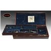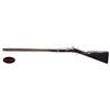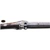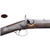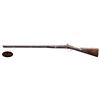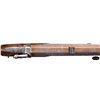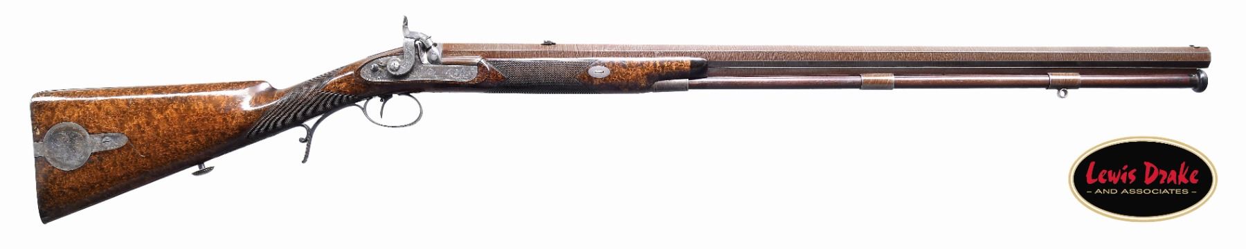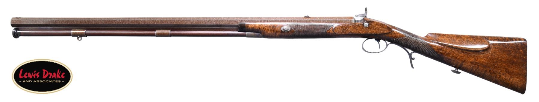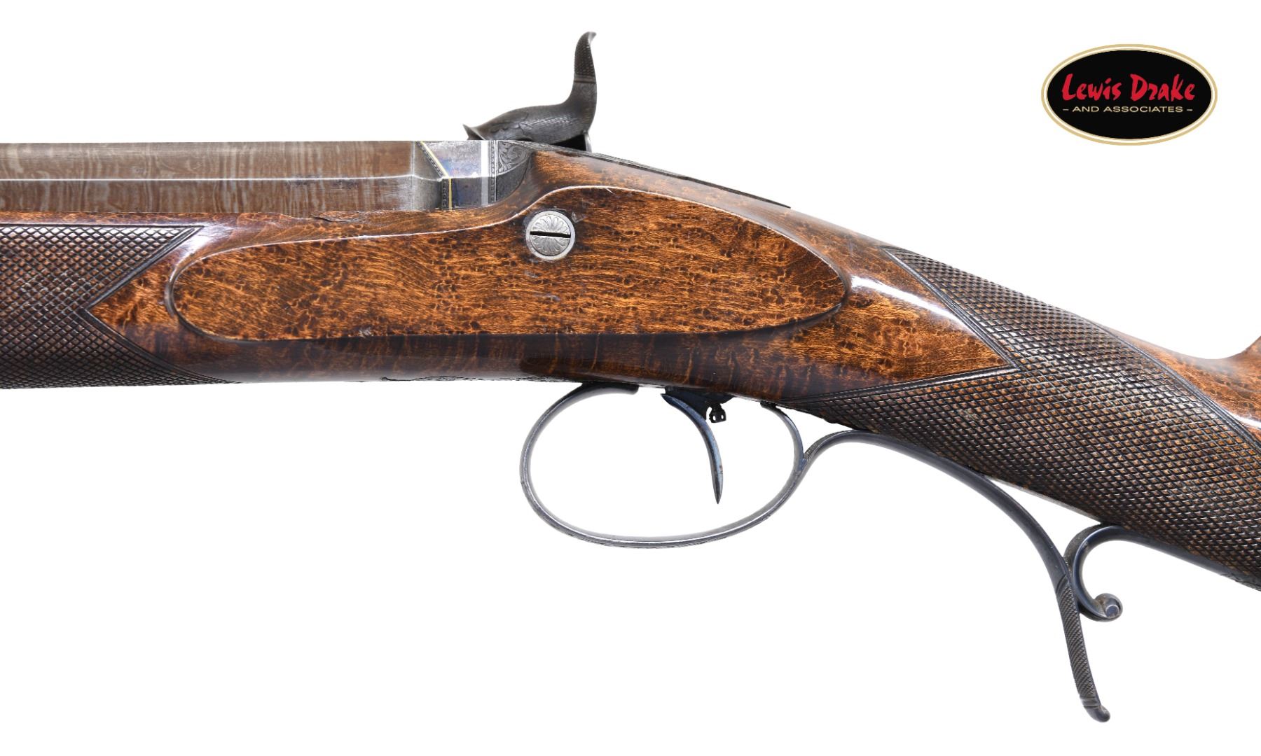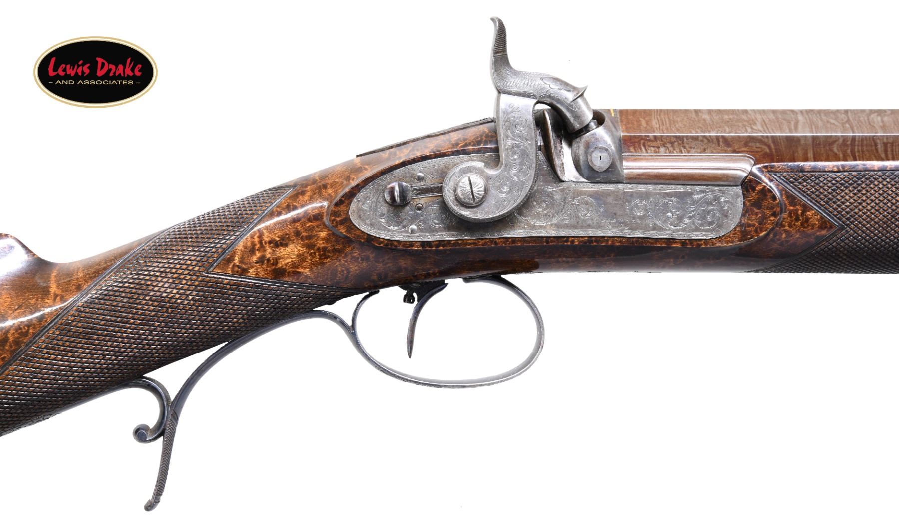 (3) Cal. .40 (with deep multi-groove rifling). S# NSN. Rare and pretty damn neat small bore percussion breech loading rifle with spare breech plug to convert back to muzzle loading. The 31" twist steel sharply tapered octagon barrel fitted with single standing rear and tall blade front sights, is engraved "Gun Makers Doncaster" on top flat. It appears rifle was converted to a tap-action breech loading system at a later date. Breech loading mechanism consists of large breech plug holding transverse rotating cylinder with right side fitted with percussion nipple. Cylinder is rotated by hinged handle that snaps into spring loading retaining catch on left side of grip. Top of breech plug is engraved "Patent" and with some well cut scroll. Interchangeable breech plug with non-vented platinum blow out has platinum lines at front and back and is engraved with scroll matching breech iron. Birmingham black powder proofs are on bottom flat of barrel. Breech iron is nicely scroll engraved. Back spring percussion lock with flat faced hammer having dolphin head is also scroll engraved. "Woodward & Co" is at top rear. Trigger plate has small pineapple type finial which has foliate engraving. Trigger guard is also scroll engraved matching lock. Spectacular birdseye maple (a popular wood for guns and rifles ca. 1830) straight grip half stock with horn tip measures 14" over steel buttplate with long top tang engraved with dog scene. Flat top point pattern checkering is at grip. A silver oval engraved with goat and "HB" is at top of grip. Stock attaches to barrel with captive sidebolt through oval silver escutcheons. Ebony ramrod with brass tip and tail mounts through two plain pipes and matching thimble. MEASUREMENTS: STOCK: DAH: approx. 1-5/8". DAC: approx. 1-3/8". CAST: neutral. LOP: 14". WEIGHT: 5 lb. 13 oz. CONDITION: fine. Barrel retaining most of its original twist finish considerably faded and speckled. Breech plugs retain over 60% of their original case hardening color. Lock, breech iron and trigger plate are a French gray. Buttplate has some blue on top tang. Trigger and trigger guard retain most of their original bright blue. Stock retains over 90% original French polish finish with case chatter and a few fairly heavy marks. Bore is mostly shiny with strong rifling throughout, some pitting in grooves. Mechanically fine & deadly accurate!. An incredible little rifle and perfect for introducing some young person to black powder shooting! (4) Cal. 14 bore (multi-groove rifling). S# 1142. Superb original condition single shot sporting rifle of the type used for deer stalking during the 1820's-40's. The 33" twist steel tapered octagon barrel with under rib is engraved "Woodward & Co Patent Gun Makers Doncaster" on top flat. Rifle is equipped with standing 100 and 3 nested leaf rear sight and steel bead front. Bottom of barrel is stamped with Birmingham black powder proofs and S#. Case hardened breech plug with vented platinum blow out has platinum band at rear, gold at front, with scroll engraving between. Breech iron is nicely engraved with shaded scroll. Front spring percussion lock with flat faced hammer having dolphin head is fitted with back sliding stalking safety. Lock and hammer are engraved with exceptional large open scroll within geometric borders. "Woodward & Co" is at bottom front of lockplate. Trigger is set. Trigger plate has stylized pineapple finial engraved in shell motif. Blued trigger guard with open scroll on bow has spur which extend to form pistol grip. Superb birdseye maple half stock with horn tip measures 14-1/4" over blued steel buttplate with scroll engraved long top tang. A spring loaded patchbox engraved with scroll matching lock is on right side of butt. Flat top point pattern checkering is around grip and forend. Rifle is made with small right hand double beaded cheekpiece similar to Purdey rifles of the era. A large steel button is on toeline along with silver oval engraved with goat and "HB" which matches other three guns. Stock attaches to barrels with captive sidebolt through oval silver escutcheons. Heavy greenheart ramrod with mushroom shaped horn tip has brass tail and mounts through two plain pipes and matching thimble. Front pipe is fitted with sling eye. MEASUREMENTS: STOCK: DAH: approx. 2". DAC: approx. 1-1/2". CAST: neutral. LOP: 14-1/4". WEIGHT: 9 lb. 3 oz. CONDITION: exceptionally fine appears essentially unfired and retaining nearly all original factory finishes on wood and metal. Bore is sharp and shiny throughout. Mechanically crisp. Trigger will not set, probably gummed. There are a few scratches in stock finish, one fairly heavy on right side of butt in front of patchbox and some wood is lifting with small piece missing,left side near breech end of barrel. UNATTACHED ACCESSORIES: all four weapons are housed in their very large 37"x16"x6-1/2" mahogany storage box with sliding bolt closure. Box has inset brass corners and some brass banding as reinforcement. Top of lid has inset circular "D" ring handle. Central medallion is engraved "TD". Interior is lined in blue velvet and a large paper Woodward & Foster label is in lid. Both guns are contained in top lift out tray and rifles are in bottom. Tray contains: 70 bore "WD" marked (William Davis) six cavity ball mould, "G. Roe" marked powder flask embossed with dogs heads, steel oil bottle, small rifle loading mallet, large rifle loading mallet, two nipple wrenches and a split blade turn screw with ebony handle. Newer accessories include a silver plated patchbox, a horn striker bottle, bone striker bottle, large brass oil bottle and a "G. Hawksley" marked capper. Compartments in bottom of case contain: two large patch cutters, one marked 1-1/2" the other 1-5/8", four smaller wad punches for .500, 15 bore, 14 bore & 13 bore, a large bronze six ball 14 gauge gang mould marked "W.D" (William Davis), a shot flask, two piece beech wood and brass cleaning rod with tips, two other greenheart and brass cleaning 