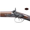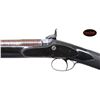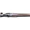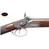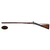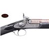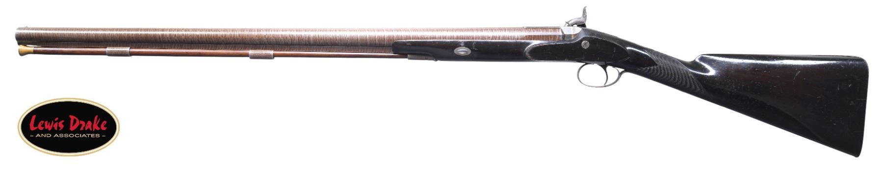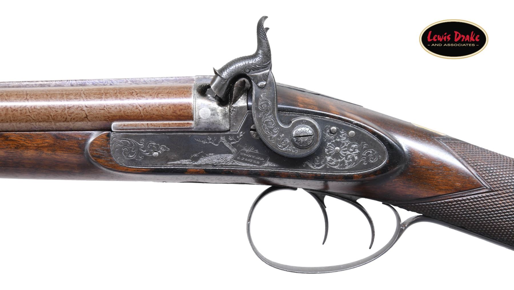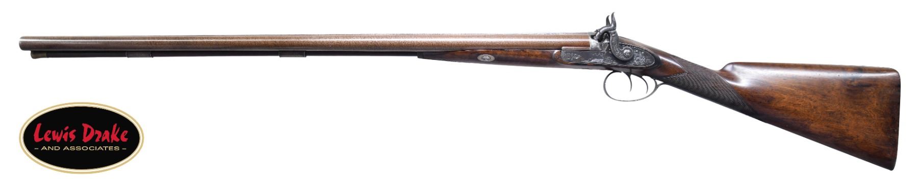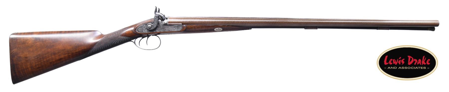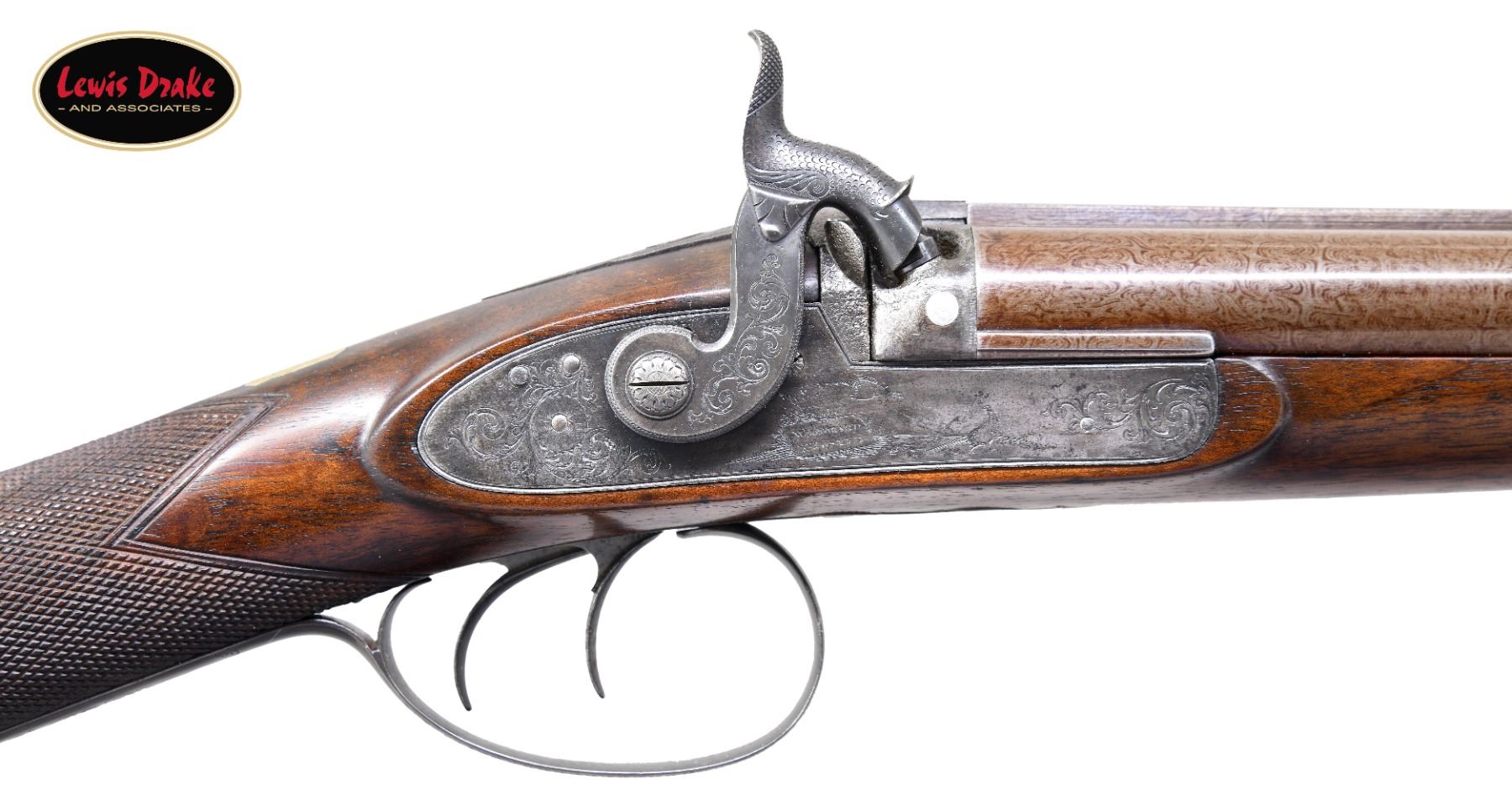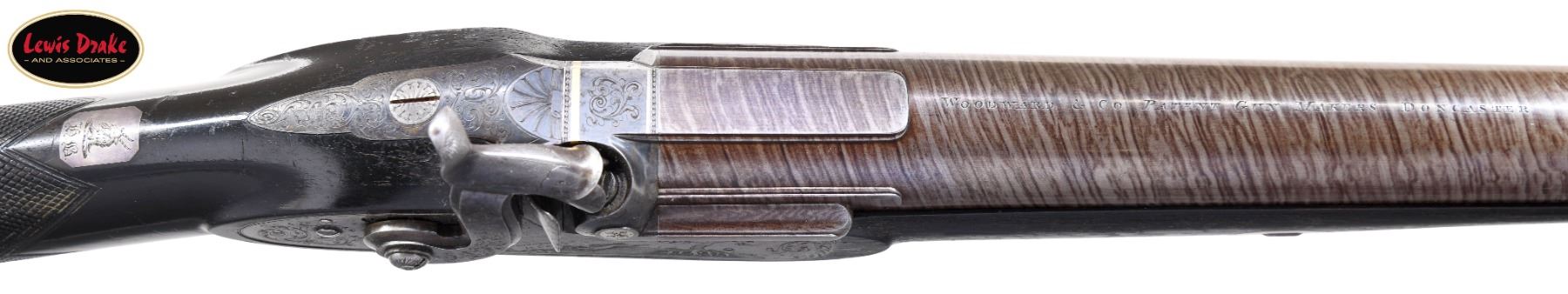 (2) Cal. 11 bore. S# 143. High condition single percussion gun with 30" twist barrel having under rib, is engraved "Woodward & Co Patent Gunmakers Doncaster" on top. Breech is filed with beaded Rigby type flats. Bottom of barrel is stamped with London black powder proofs and barrel maker's initials "CL" (the famous Charles Lancaster). Nicely filed breech plug with gold band at rear and platinum band at front has unvented engraved platinum blow out. Scroll engraving is on top. Breech iron is nicely scroll engraved. Front spring lock with nicely filed serpentine hammer with stylized dolphin head is also engraved with open scroll "Woodward & Co" is on stone at rear of running rabbit and gnarly old tree scene. Trigger plate has stylized pineapple finial with standing pheasant under a tree. Tree and running rabbit scene is also on trigger guard bow. Ebonized walnut half stock with horn tip measures 14-3/8" over case hardened steel buttplate with long top spur engraved with pheasant scene. Flat top point pattern checkering is at grip and a silver rectangle with goat and "HB" initials are at top of grip. Stock attaches to barrel with sidebolt through oval silver escutcheons. A greenheart ramrod with brass tip and tail (worm under cap) mounts through two plain pipes and matching thimble. MEASUREMENTS: STOCK: DAH: 1-5/8". DAC: 1-7/16". CAST: neutral. LOP: 14-3/8". WEIGHT: 6 lb. 11 oz. CONDITION: extra fine. Barrel retaining nearly all dramatic twist finish. Lock, breech iron and breech plug retain nearly 80% case color. A large amount of case color is present on buttplate and trigger plate. Trigger guard has traces of original blue. Stock retains over 90% original ebonized finish with areas showing case wear on left side which appears along with many chatter marks on butt. Bore is bright and shiny throughout. Lock is crisp.