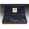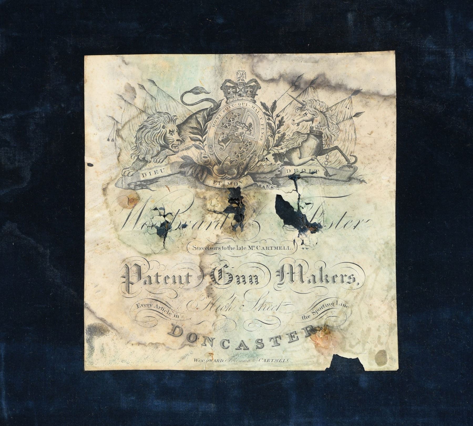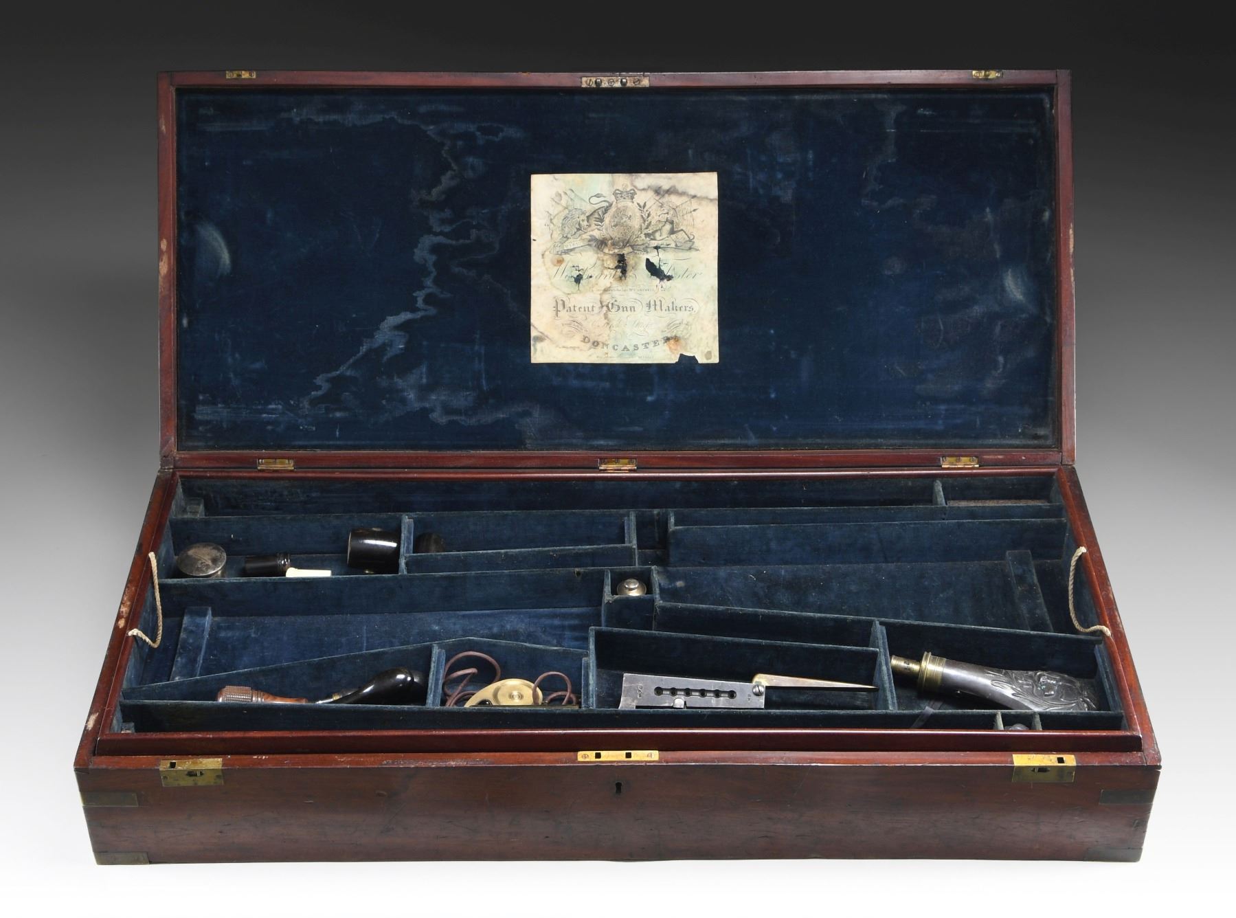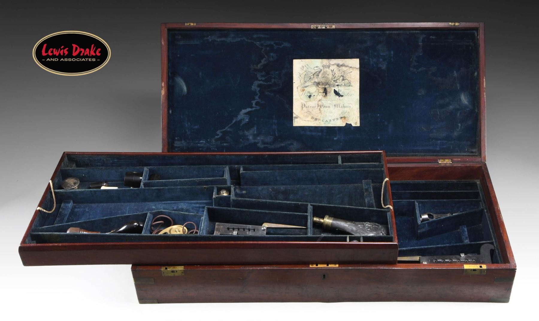 WOODWARD & FOSTER OF DONCASTER, ENGLAND IN MASSIVE TWO TIERED MAHOGANY CASE. This very well made four piece garniture contains a weapon for almost any conceivable shooting situation to be found in the UK at the time of its manufacture (Circa 1833-42). It consists of a double 13 bore shotgun for grouse, partridge, pigeons, etc. (which saw the most use); an 11 bore single shotgun for ducks & geese; a small bore rifle convertible to early breech loader for fallow deer and rooks (?) and a 14 bore rifle for stags. All are contained in large brass bound mahogany case complimented by many original accessories. Guns and rifles are marked either Woodward & Foster or Woodward & Co. Very little information is available regarding this maker except approximate dates. It appears that they sourced these fine guns from best makers in Birmingham and London.