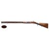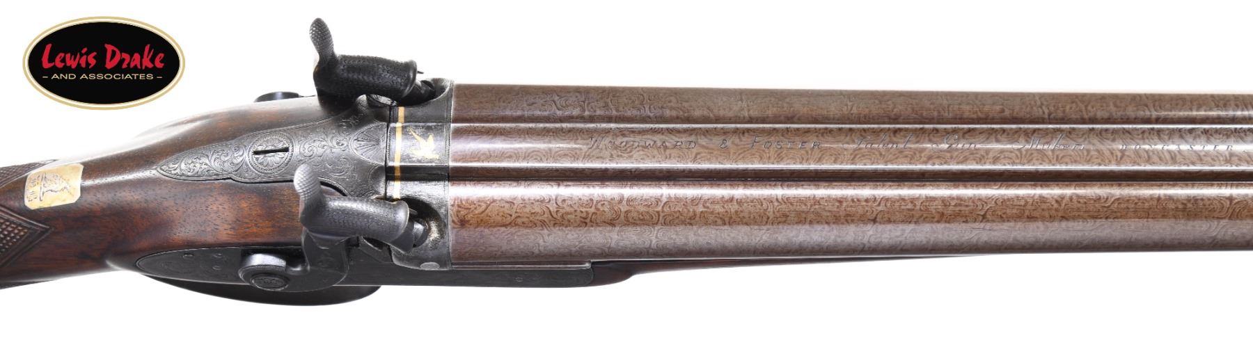(1) Cal. 13 bore. S# 132. Double percussion game gun. The 30" fine damascus barrels are engraved "Woodward & Foster Patent Gunmakers, DONCASTER" on raised concave rib. Bottoms of barrels are stamped with Birmingham black powder proofs and S#'s. Breech plugs with unvented platinum blow outs have gold band across rear and rib extension is gold inlaid with a flying pigeon. Breech iron is nicely engraved with semi-relief scroll, front spring locks with flat faced broad hammers having stylized dolphin heads are also scroll engraved. "WOODWARD & FOSTER" is on stone set under a tree with running rabbit on left lock. Right lock shows same stone in open field with pheasant. Trigger plate has stylized pineapple finial with engraving of rail. Trigger guard is also scroll engraved. Stock of dense, lightly fiddle figured European walnut measures 14-1/2" over steel buttplate with long scroll engraved top tang. Point pattern checkering is at grip. A silver rectangle with cut corners on top of grip is engraved with the head of a billy goat rampant over initials "HB" (Consignor states that this is possibly Howard Bowser born 1825, of Doune, Scotland.). Stock attaches to barrels with captive sidebolt through oval silver escutcheons. Greenheart ramrod with brass tip and tail (worm under cap) mounts through two beaded pipes and steel thimble with pineapple finial. MEASUREMENTS: STOCK: DAH: 1-7/8". DAC: 1-1/2". CAST: neutral. LOP: 14-1/2". WEIGHT: 6 lb. 9 oz. CONDITION: fine as restored. Barrels nicely re-browned. Locks with dark case color. Trigger guard and buttplate heat blued, stock oil refinished. Engraving re-cut on trigger guard and buttplate. Gun retains nearly all restored finishes with some minor marks. Bores are good with scattered pitting. Locks are good.