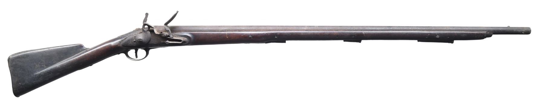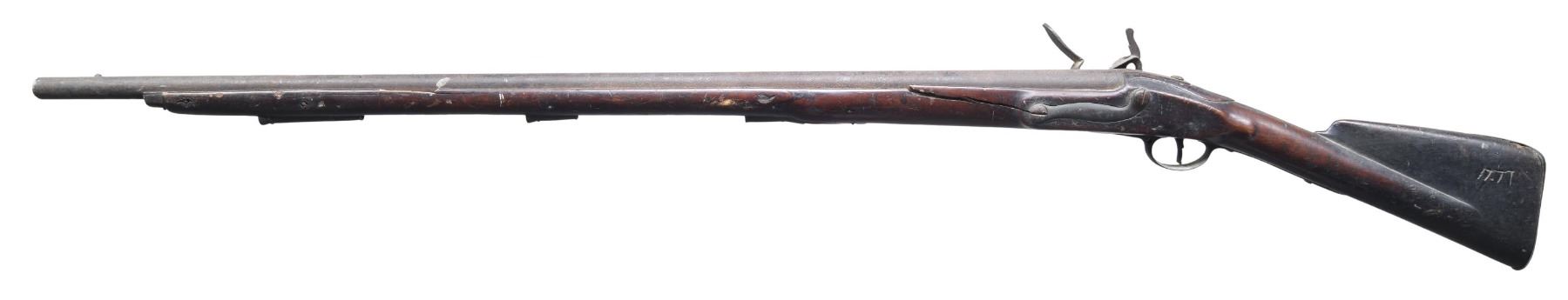 FLINTLOCK MUSKET. Cal. 71. NSN. Bbl. 39" round. Tower marked lock. Pin fastened walnut stock w/ a swell around the thimble. Iron fittings. Left side of stock has hand carved "1777" date. CONDITION. metal exhibits a generally rusty & pitted appearance. Rear lock screw appears to be broken leaving lock partially loose in the stock. The frizzen is missing from hammer. The ramrod is not present. Dark pitted bore. The stock has an age darkened appearance w/ cracks in the side plate area and chips along the forearm channel. Dark pitted bore. (01-26220/DS). ANTIQUE. $800-1200.