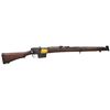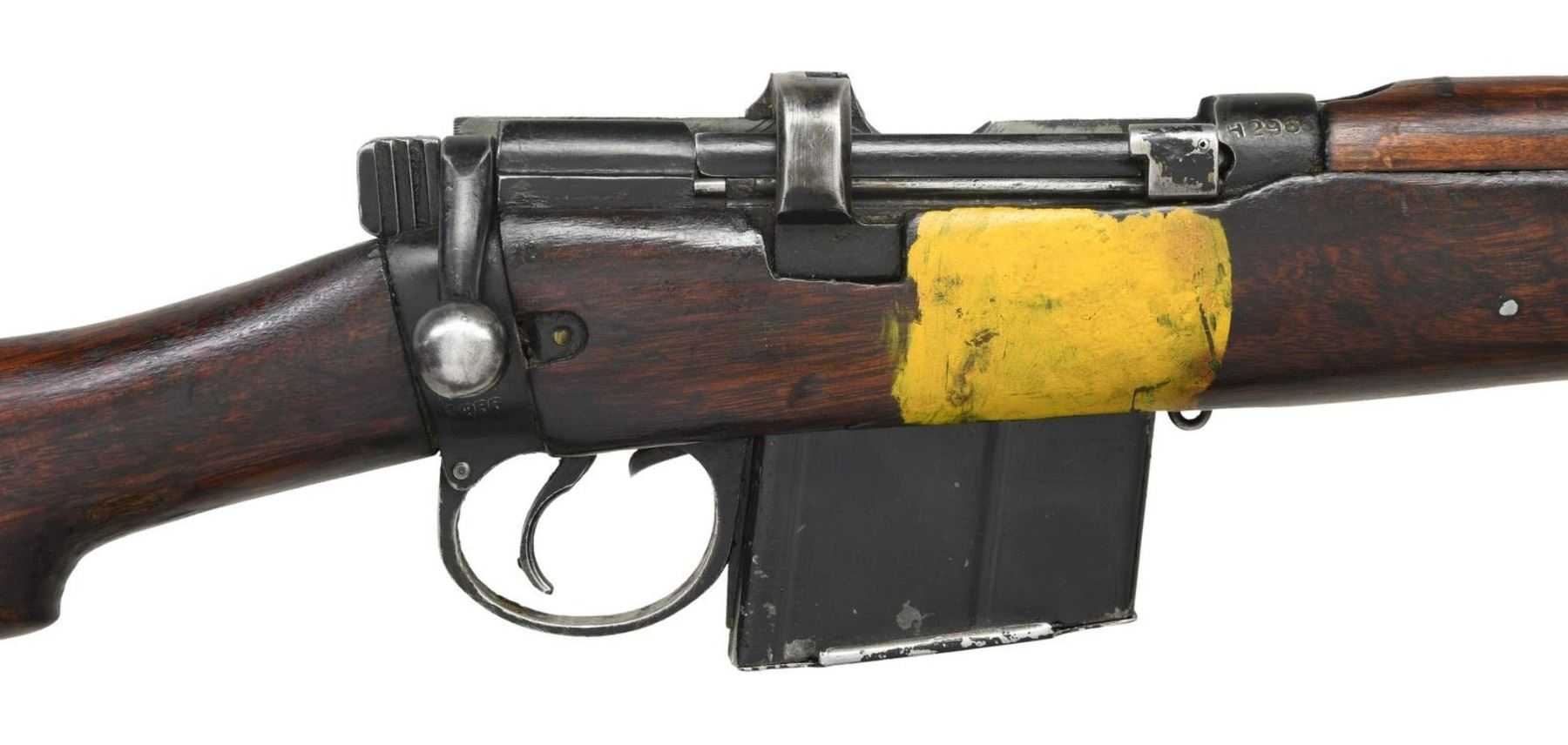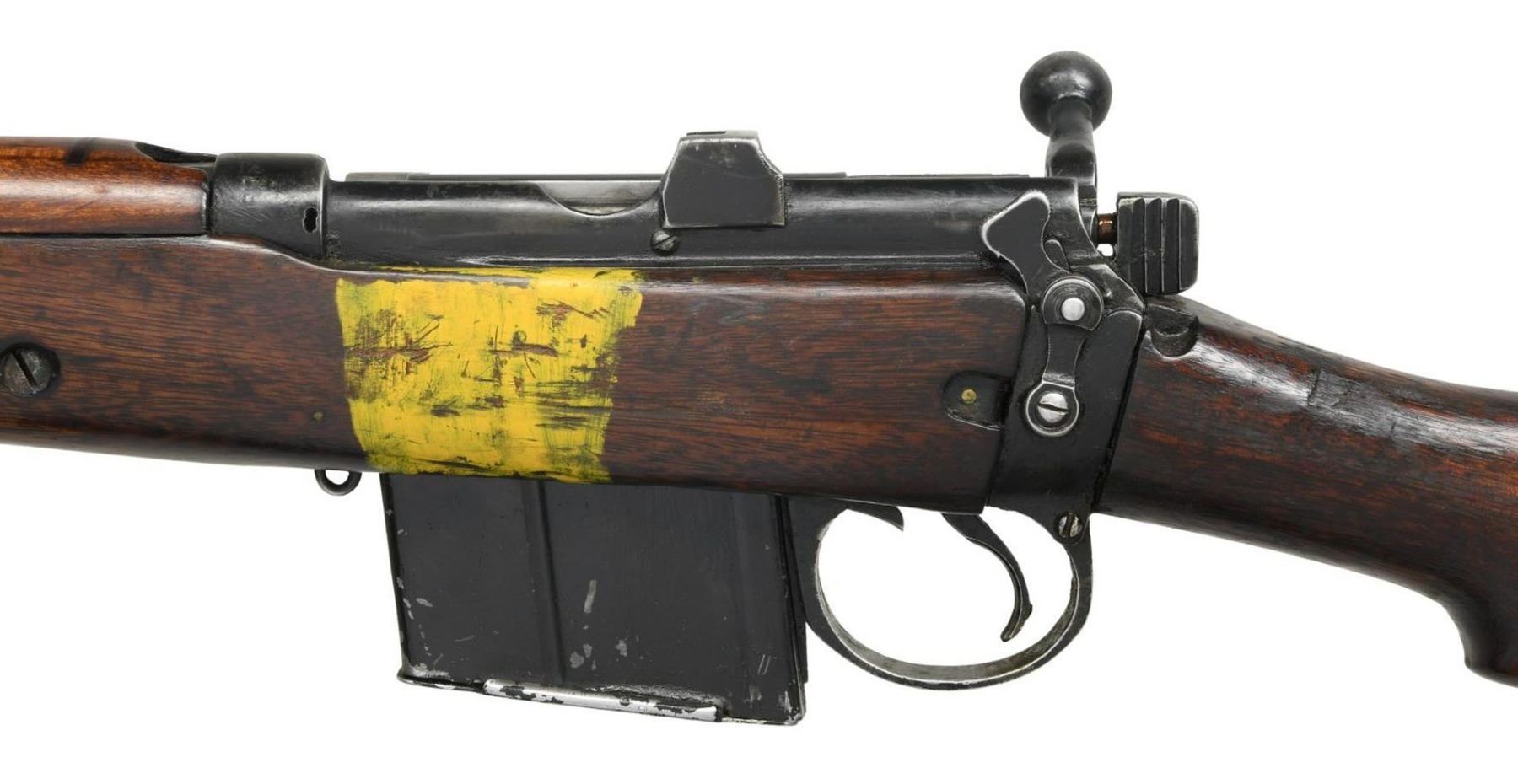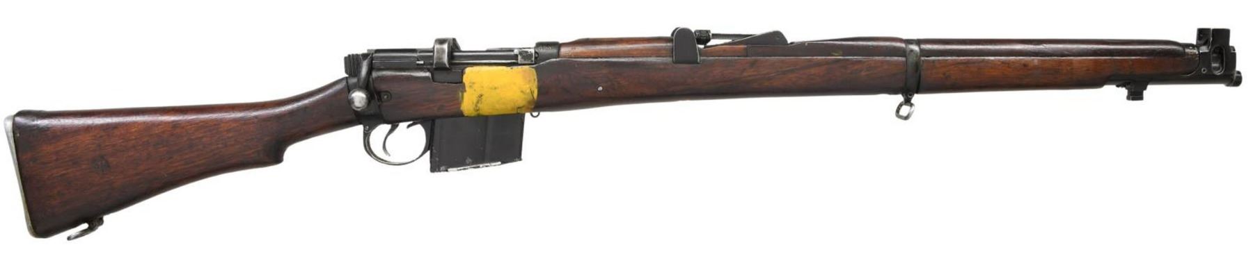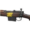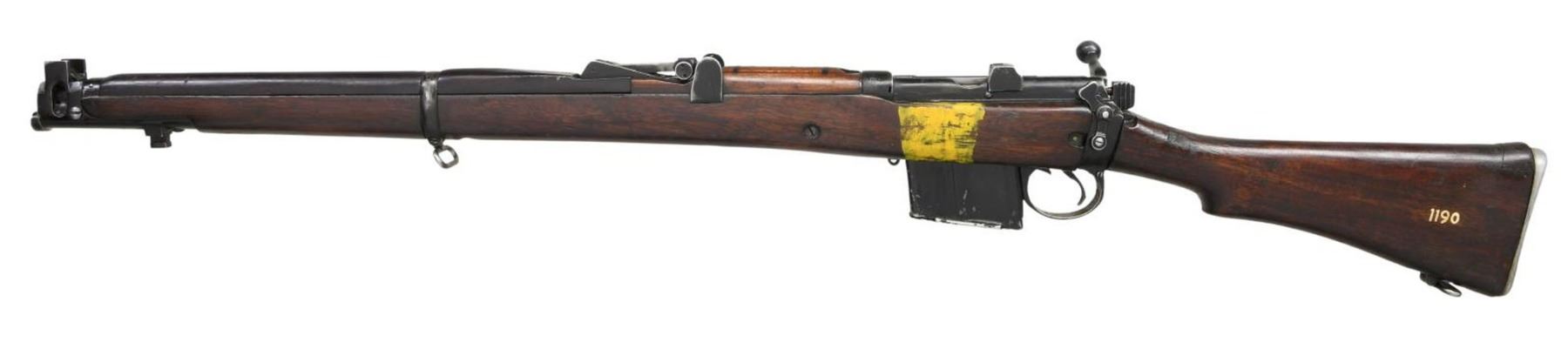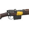 MILITARY RIFLE. Cal. 7.62x51. S# H2963. Bbl. 25 1/4". Tangent rear sight graduated to 800 meters. Sight has straight rather than curved rails. Blade front sight w/ square profile protective ears. Receiver is import marked on right rear. Butt socket marked on right side w/ Indian Lion, "RIFLE" / "7.62mm 2A1" / "RFI" / "1966". Hardwood stock set. Alloy trap buttplate. Buttstock is marked in white on left side "1190". Rear of forend has metal tie-strap similar to #4 rifle. Forend has transverse reinforcing screw (Indian Kiss). Forend also has yellow strip on both sides in mag. area which is thought to differentiate between 7.62 and .303 cal. rifles. MAGS: 1 non matching 12 rd. detachable. CONDITION: stock set has worn original finish w/ scattered handling marks & staining throughout. Buttstock has inletted repair at heel which stands proud of the buttplate. Metal has 50% worn black finish w/ scattered handling marks. Near excellent shiny bore. (23-4910/RW). CURIO. $300-500.