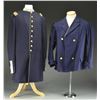 2) Cloth blue under coat w/ 4 buttons. CONDITION: cloth appears in good overall condition w/ fraying along cuff edges, small holes on interior cloth of overcoat & undercoat has tear at seam of left shoulder. Both appears appear mostly intact w/ stitching predominantly tight. (02-17967/MD). $250-350.