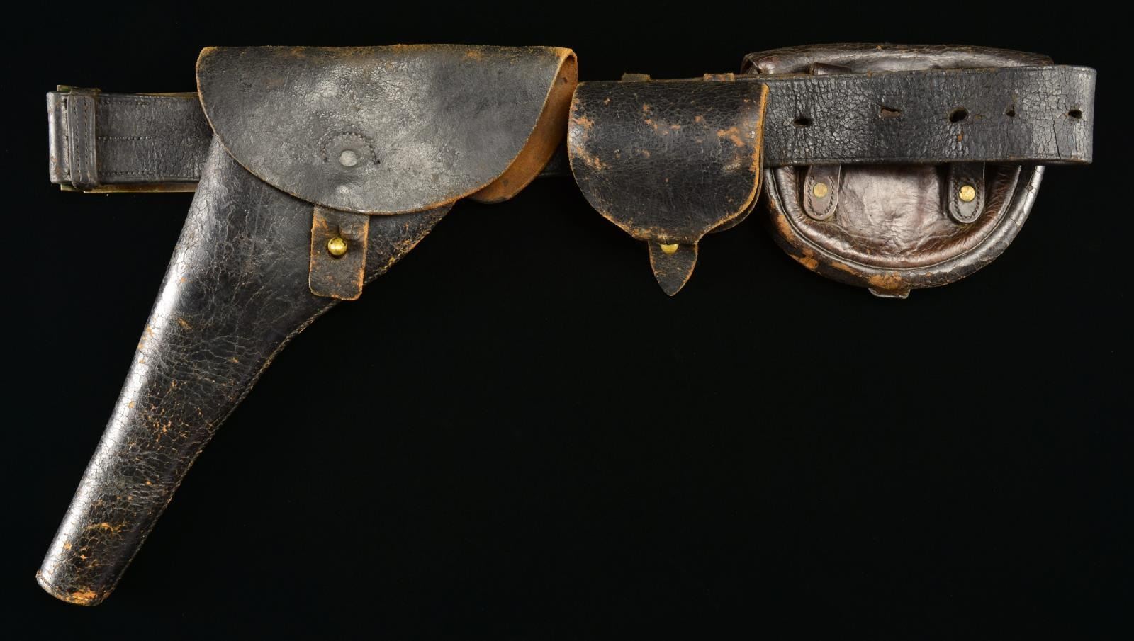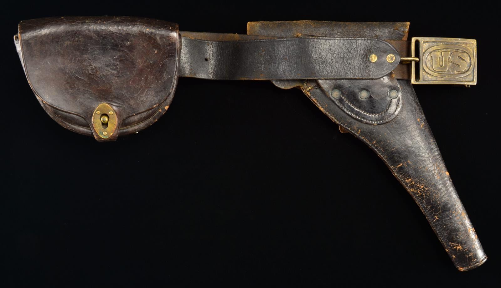 This rig has rectangular U.S. buckle, Civil War surplus cap box & Army holster w/ scarce dryer M1874 patent cartridge box. CONDITION: good overall. (02-16225-4/JS). $300-400.