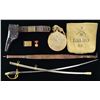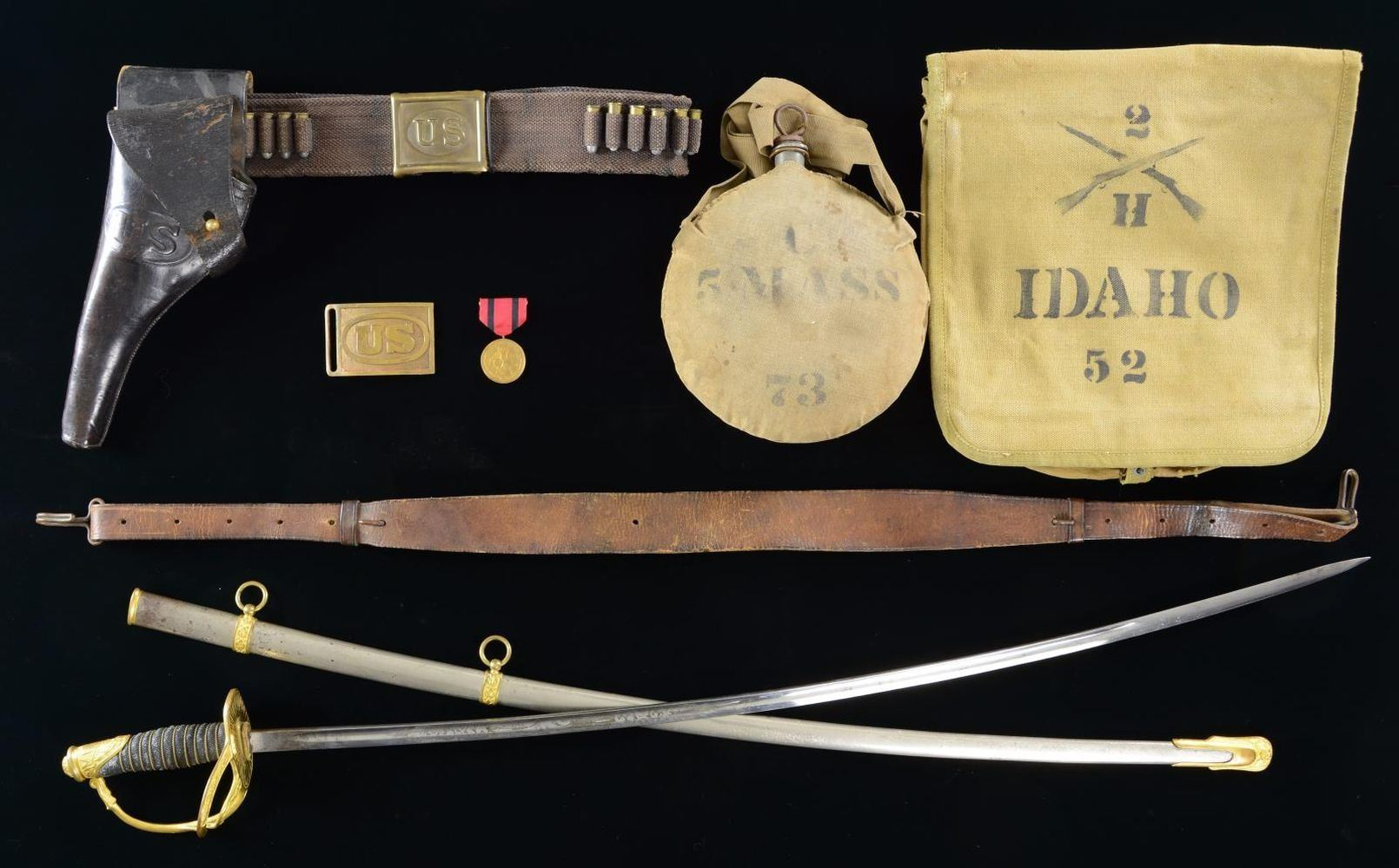 ACCOUTREMENTS & SWORD. This fine group includes 1 Civil War period canteen with a later Indian War cover & sling. The khaki cover is stenciled “C 5 MASS 73” on one side, and the other side has the large stenciled initials “D.I L”. The sling is khaki cotton webbing & is 1 3/16” wide. The stopper & chain are intact. / 1 Spanish American War haversack in khaki cotton canvas. The front is stenciled “2 (crossed rifles) H IDAHO 52”. / 1 Leather military rifle sling, likely for a 30-40 Krag. / 1 Circa 1890 pistol belt with rectangular buckle impressed with an oval “US” in the center. There are several cartridges in the belt, and a black leather military holster embossed “US” in oval on the body is attached. / 1 M1874 belt plate with “US” in oval on the face. / 1 Late unnumbered Indian War Service Medal. / 1 M1872 Cavalry Officer's sword measuring 41” overall with a 34 1/2" blade. Blade is etched over 10” on each side with foliate motifs, an American eagle, and “US”. Gilded brass hilt with 2-branch guard. Standard pommel. Wire wrapped sharkskin grip. Plated scabbard with gilded brass mounts. CONDITION: canteen & haversack show light to moderate wear. Pistol belt also shows light wear with flexing to the leather holster. Sling shows moderate wear. Sword blade has some staining particularly near the hilt. Hilt shows light wear. Scabbard has scattered staining concentrated near the throat. PROVENANCE: from the Lifelong Collection of Glen E. Mattox. (02-18757/BF). $400-700.