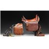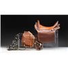 Indian War era russet leather hand tooled McClellan type saddle. Saddle appears to be private purchase with more adornments than standard military saddles. Rear of saddle has brass shield marked "VIRG" likely name of trooper it was issued to. One piece of brass hardware marked "US Army". Consignor states this saddle was issued to Fort Recovery in Ohio, which is unusual as that fort was abandoned in the 1790's. Saddle bag present also stamped "VIRG". Also included is a newer black bit and headstall. This item has silver plaques that read "APACHE" & "BLACK". Another plaque present that reads "FORT COVERY" but this item appears newer than the 1790's. UNATTACHED ACCESSORIES: a printout article on the history of Fort Recovery. CONDITION: items show scattered age & usage related wear such as scuffing, marks & crazing. (02-25260/MJC). $400-600.