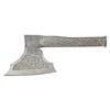 Overall length: 12 3/4". Blade length” 6 1/2". A very heavy silvered iron axe head & socket, likely of Indo-Persian origin & somewhat similar to a tabar. Blade is decorated in a foliate motif w/ a central crowned escutcheon featuring 3 crowned lions & 7 hearts resembling the Dutch Arms. Opposite the blade is a flush hammer like poll. 8” Haft is decorated w/ serpents & foliate designs. CONDITION: about 30% of the silver finish remains. Decoration is clear & striking in design. Overall, light wear but no damage. (02-13471/BF). $600-900.
