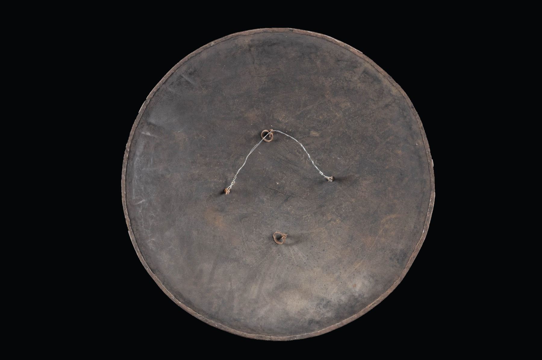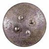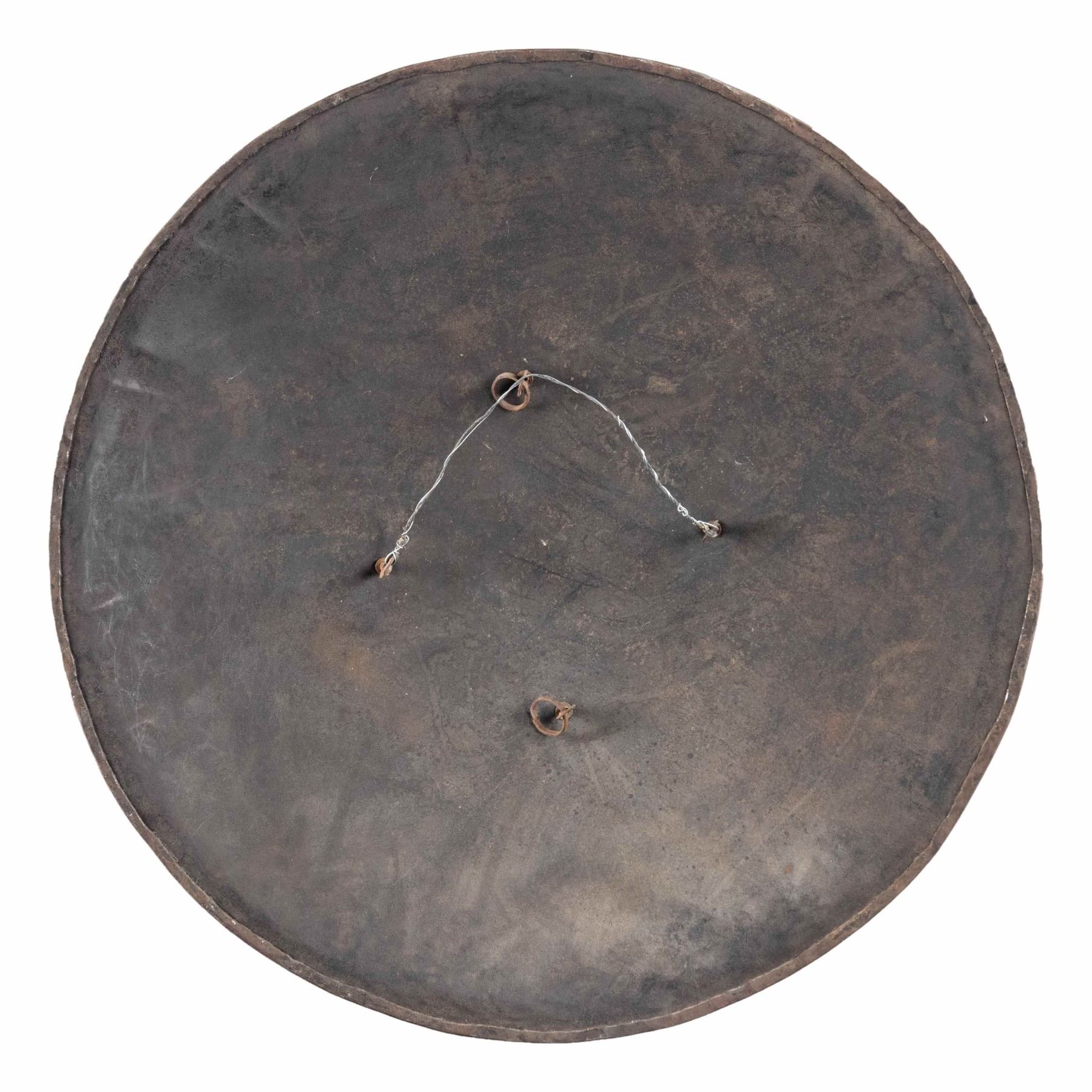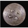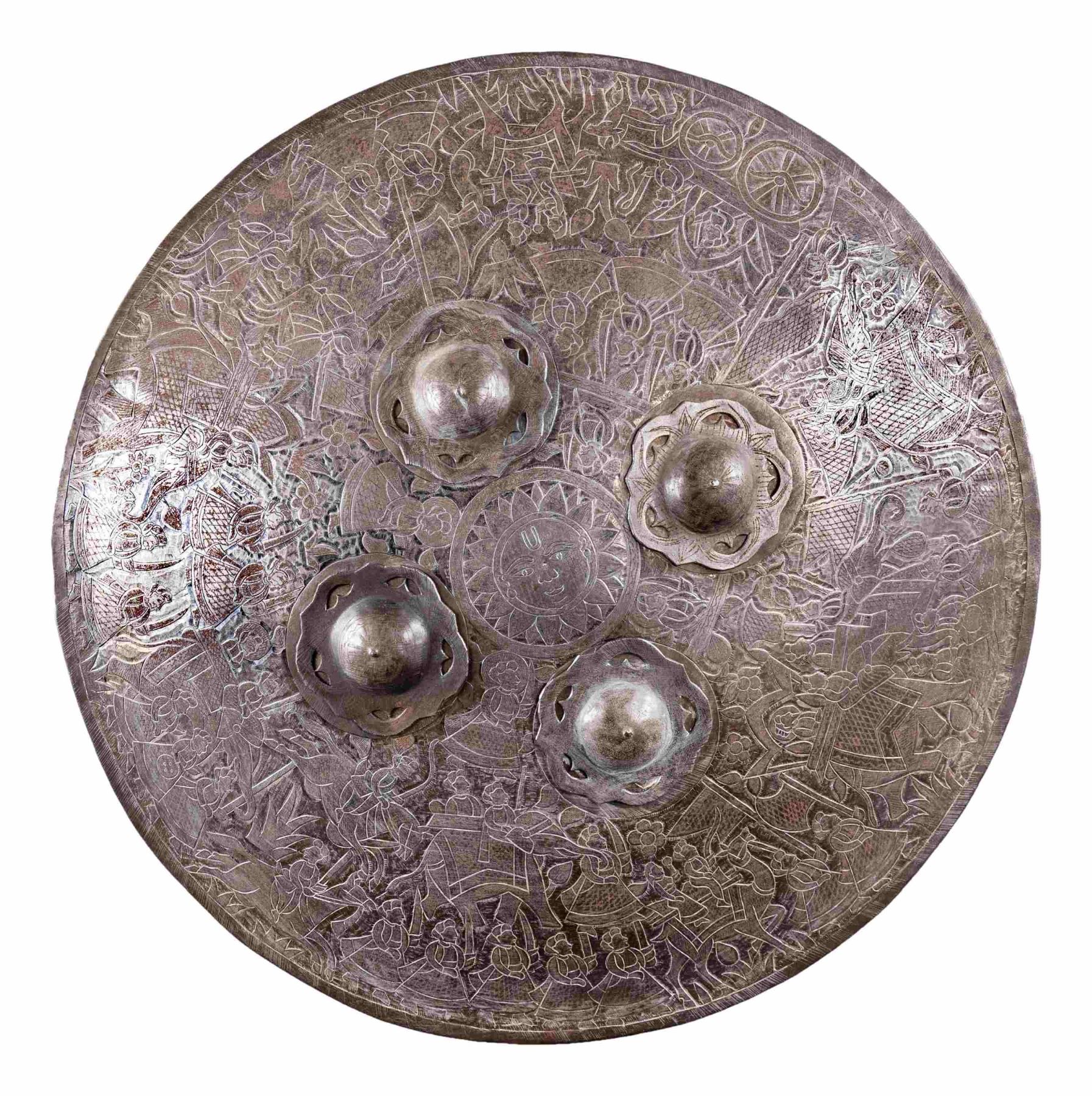 This shield has a diameter of 24 3/4" and is profusely decorated with Indo-Persian scenes including elephants, soldiers, and flowers including a central multi-rayed sun. There are four raised 4 1/4" bosses on the front that support loops in the back for suspending the shield from the arm. CONDITION: front of the shield retains its decoration quite well with vivid and active scenes. The domed bosses show more wear and the inside of the shield has an oxidized finish. (02-25836/BF). NON-GUN. $600-900.