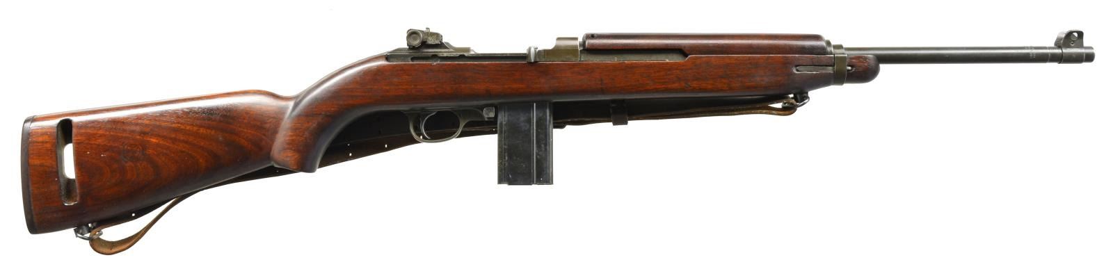 Cal. 30 Carb. S# 582483. Bbl. 18", marked behind front sight “INLAND MFG DIV GENERAL MOTORS 8-43”. Milled adj. rear sight marked “PI” & blade type front sight w/ protective ears. Narrow bbl. band is unmarked. Swivel is not present. Straight cut slide is marked “PI”. Flat bolt marked “IO”. Trigger housing is marked “INLAND”. Push button safety. Unmarked mag. catch. Dog leg hammer marked “H”. Low wood “I” cut walnut stock marked only w/ faint crossed cannons. 2 Rivet handguard. MAGS: 1-15 rd. marked "RUGG". CONDITION: stock has been refinished w/ reshaping of pistol grip, which has added commercial type 1.25" sling swivels & has 7/8" military style sling. Sling has wear & cracking. Metal has 70% original parkerized finish w/ thinning & wear. Rear sight is dented on both sides due to improper installation. Very good, shiny bore. (20-1622/RW). CURIO. $500-700.