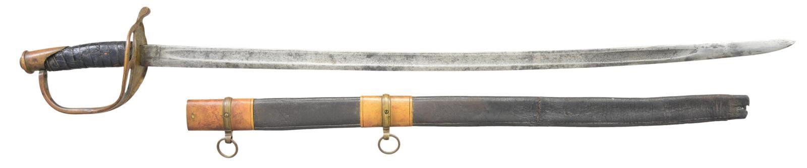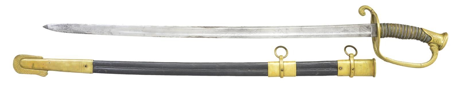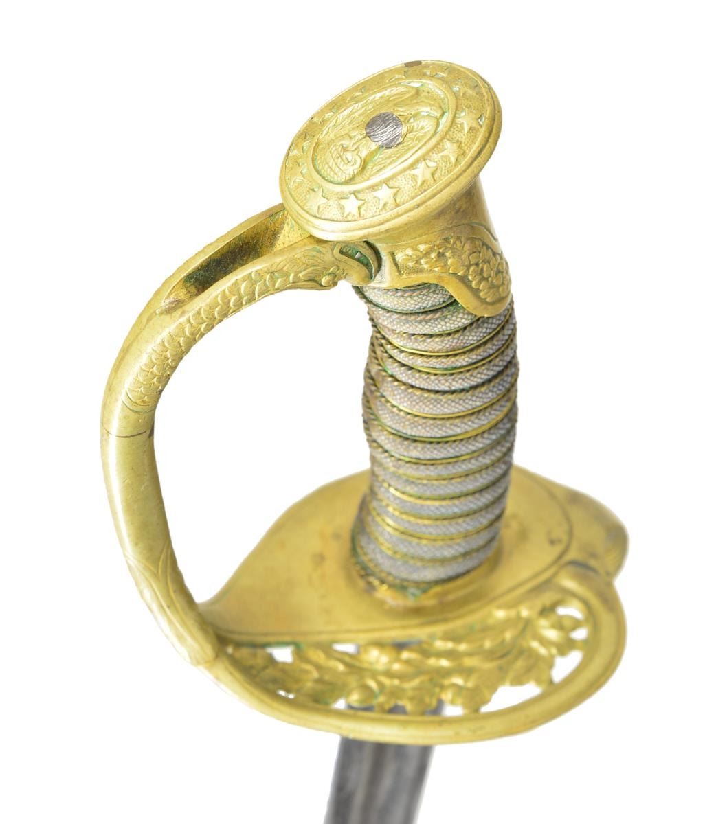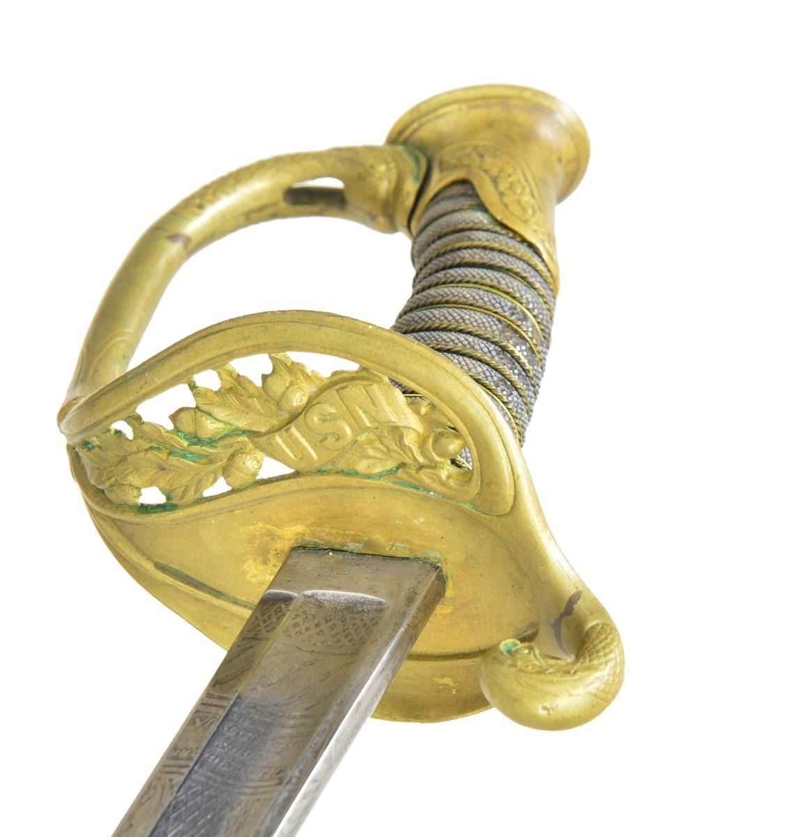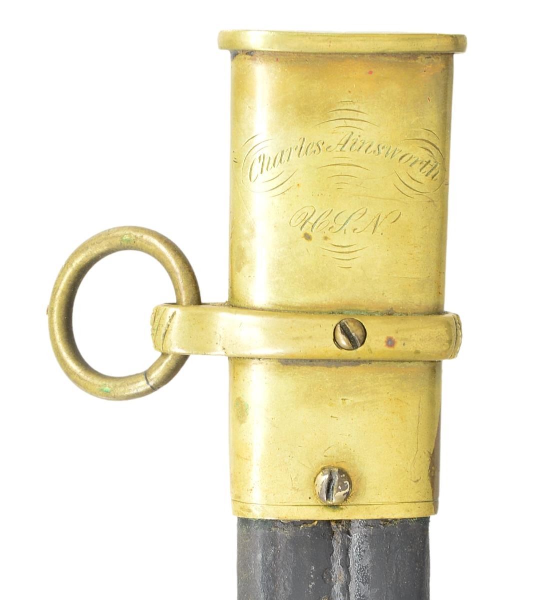 AINSWORTH USN”. Regulation model 1852 US naval officer sword, sea serpent quillon & drag, 27” blade with etched patriotic naval motifs. Top scabbard mount inscribed in script “Charles Ainsworth / USN”. Charles Ainsworth (1836-1907) entered US Navy in 1860 was made ensign 1863 on USS Richmond which saw service under Admiral Farragut, especially at bombardment of Port Hudson where she is listed multiple times in official records. Ainsworth stayed with Richmond till discharge July 14, 1866. Charles would spend his last 14 years in National Home for disabled veterans in Kennebec Maine where he died in 1907. UNATTACHED ACCESSORIES: lg. file of research. CONDITION: very good overall, blade cleaned with all discernible etched panels, brass hilt & mounts cleaned toned to light mustard. Sharkskin grip intact with triple wire wrap. (02-19273/JS). $1,500-2,000.