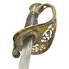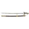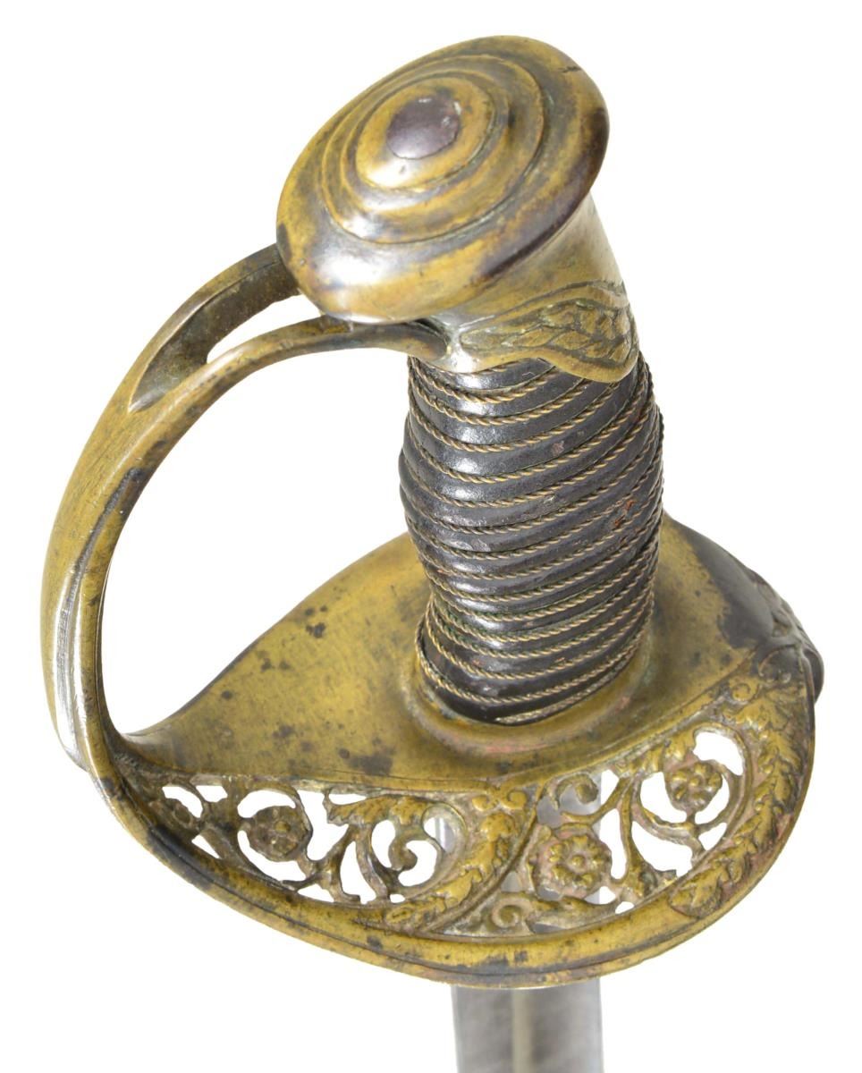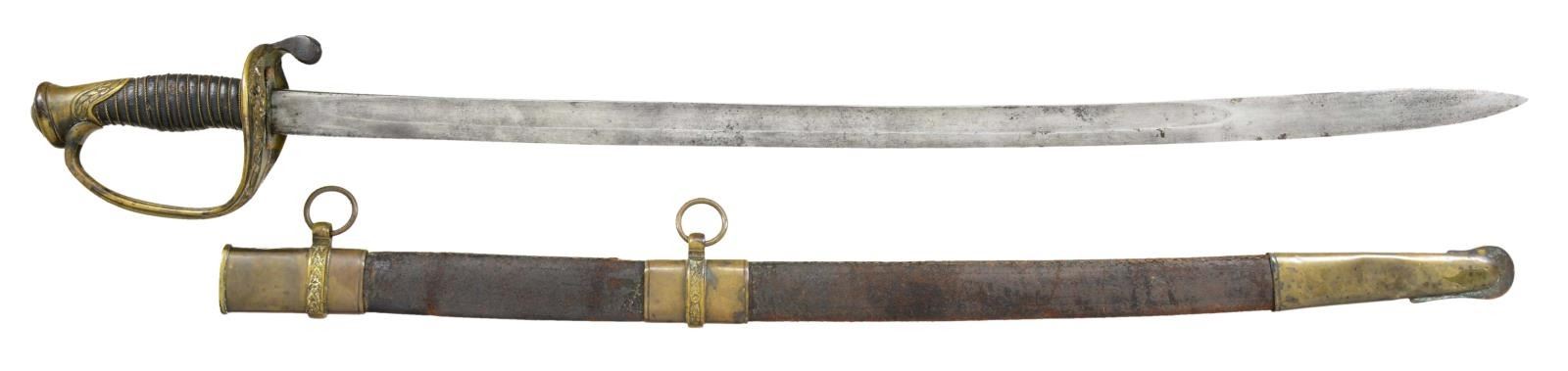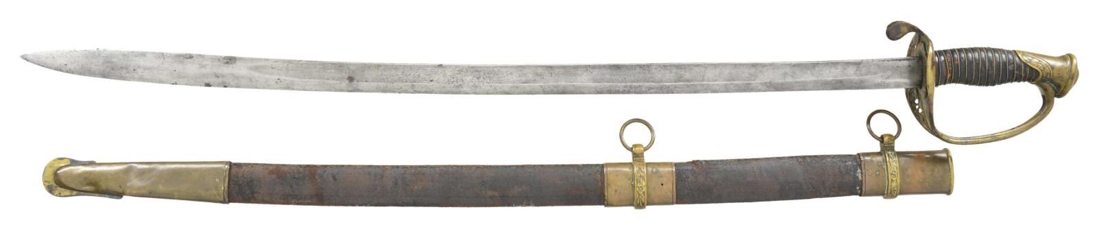 CONDITION: very good overall, all original and complete, gray blade, mottled dark brass patina matching on hilt, pommel, and scabbard mounts, leather grip 95% complete with chipping and scuffs. Hilt is slightly loose, leather scabbard body scuffed and dry, middle mount loose and slides, drag has several dents. PROVENANCE: Cullen Smith estate collection. (02-17237/JS). $12,000-$15,000.