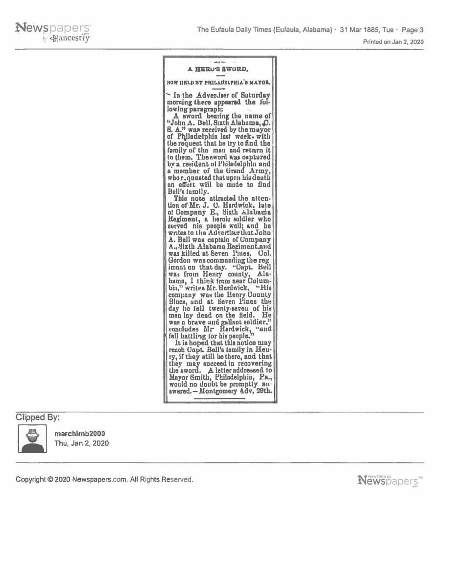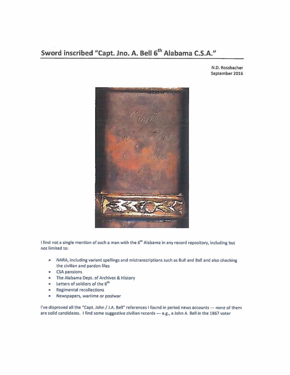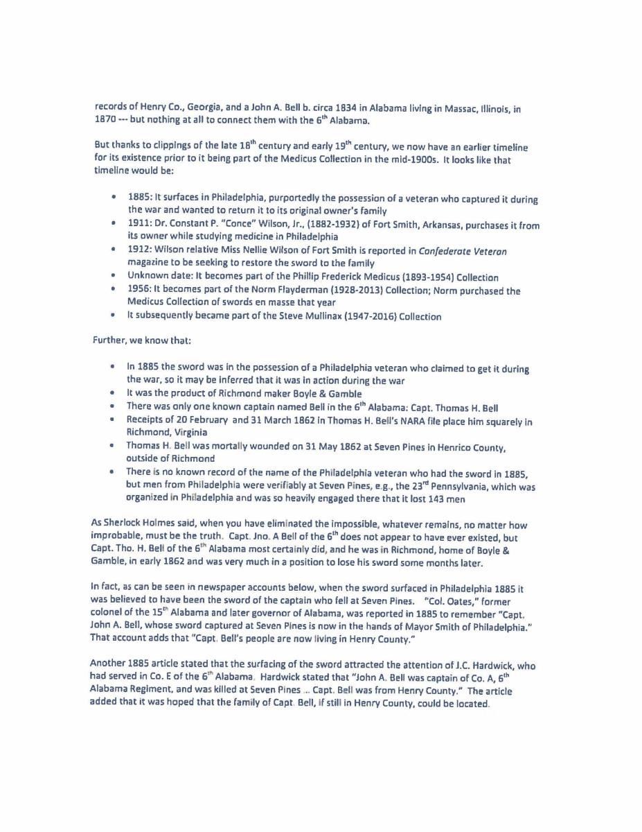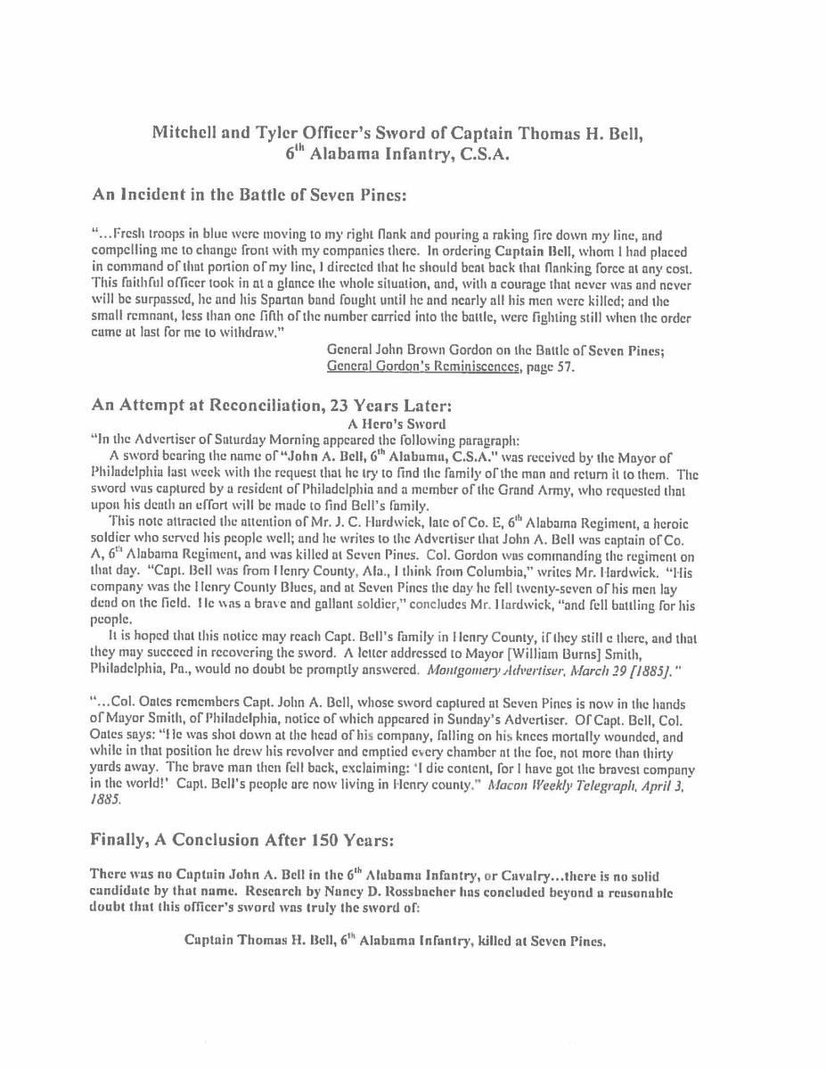 This sword surfaced in 1885 newspaper advertisement by the mayor of Philadelphia, a major during the war who was making wishes of the now deceased capturer of the sword to return it to the family of Captain Bell. Several other ads continued till 1912 and one stated the sword belonged to officer who fell at Seven Pines. Col. Oates, former colonel of the 15th Ala and later governor of Alabama was reported in 1885 to remember "Capt. John A. Bell, whose sword was captured at Seven Pines is now in the hands of Mayor Smith of Philadelphia.". In final analysis, one wonders if handwritten order for "Tho. H. Bell" inscription be misread as "Jno. A. Bell" When comparing wartime receipts signed by Capt. Tho. H. Bell", it would have been easy to have been wrongly interpreted by engraver. There are many typos in Civil War inscriptions, this is another one. There was no Capt. Jno. A. Bell, in conclusion beyond a reasonable doubt this sword belonged to Captain Thomas H. Bell, 6th ALA, Killed at Battle of Seven Pines.