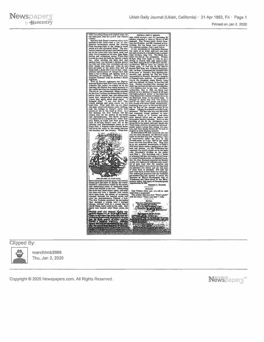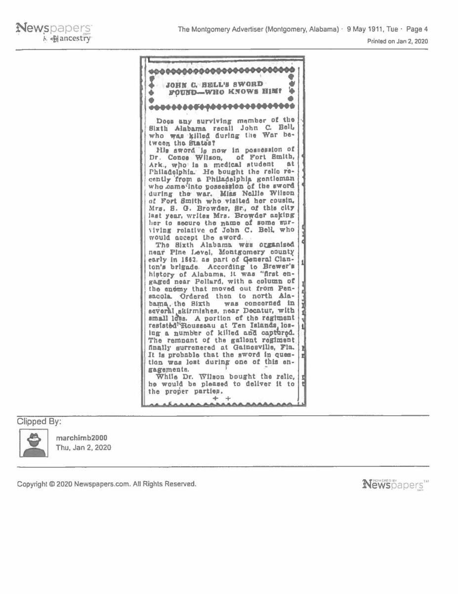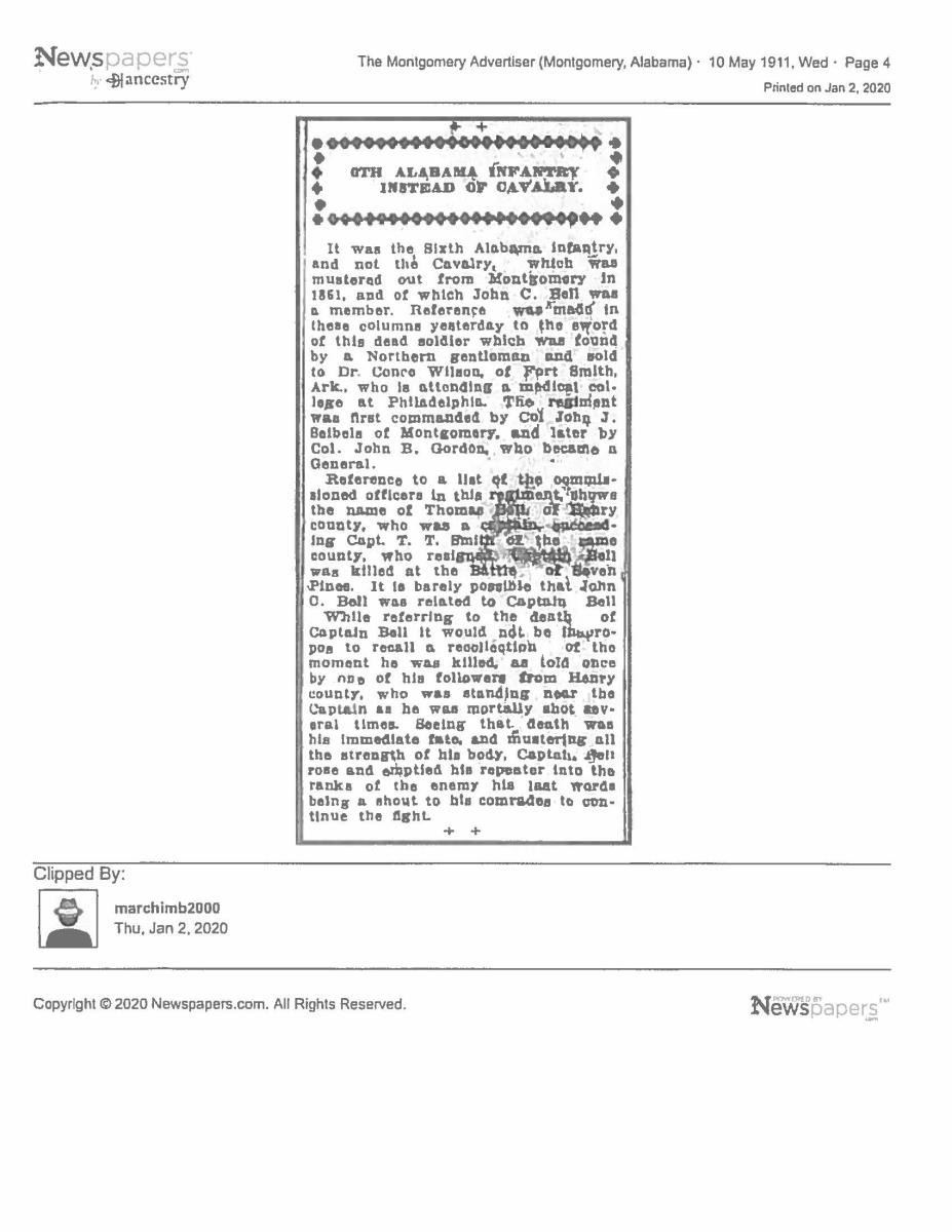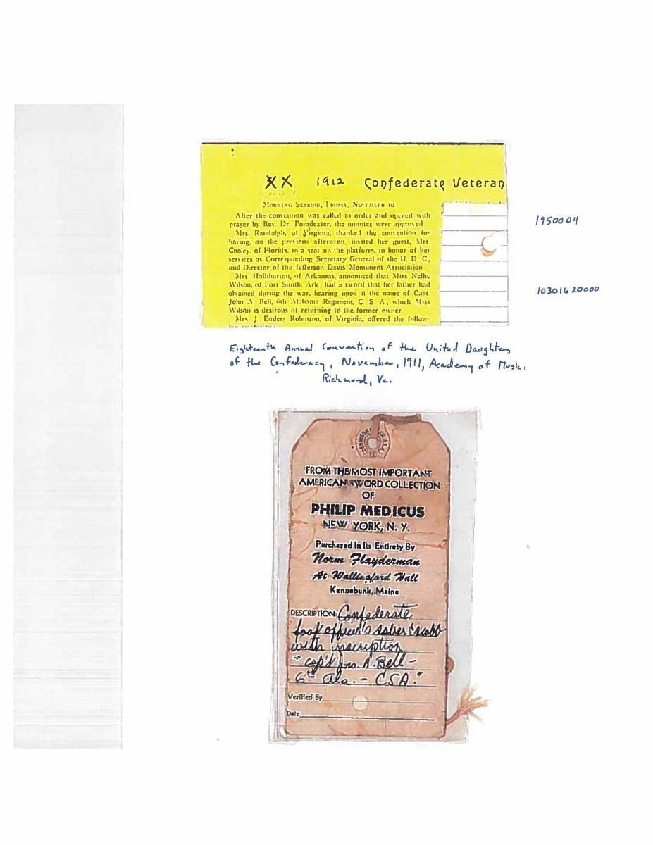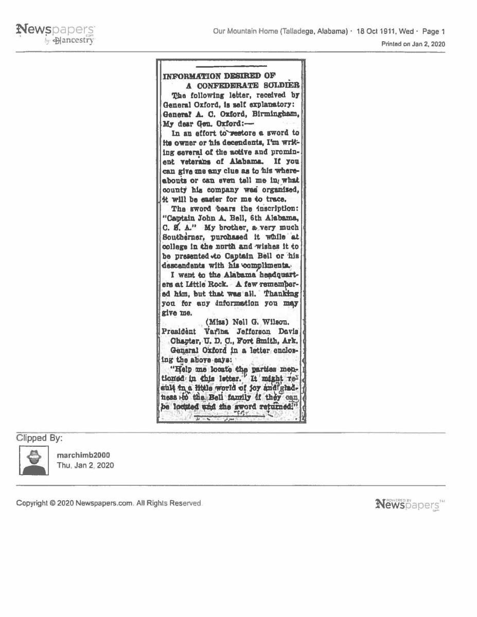 This sword surfaced in 1885 newspaper advertisement by the mayor of Philadelphia, a major during the war who was making wishes of the now deceased capturer of the sword to return it to the family of Captain Bell. Several other ads continued till 1912 and one stated the sword belonged to officer who fell at Seven Pines. Col. Oates, former colonel of the 15th Ala and later governor of Alabama was reported in 1885 to remember "Capt. John A. Bell, whose sword was captured at Seven Pines is now in the hands of Mayor Smith of Philadelphia.". In final analysis, one wonders if handwritten order for "Tho. H. Bell" inscription be misread as "Jno. A. Bell" When comparing wartime receipts signed by Capt. Tho. H. Bell", it would have been easy to have been wrongly interpreted by engraver. There are many typos in Civil War inscriptions, this is another one. There was no Capt. Jno. A. Bell, in conclusion beyond a reasonable doubt this sword belonged to Captain Thomas H. Bell, 6th ALA, Killed at Battle of Seven Pines.