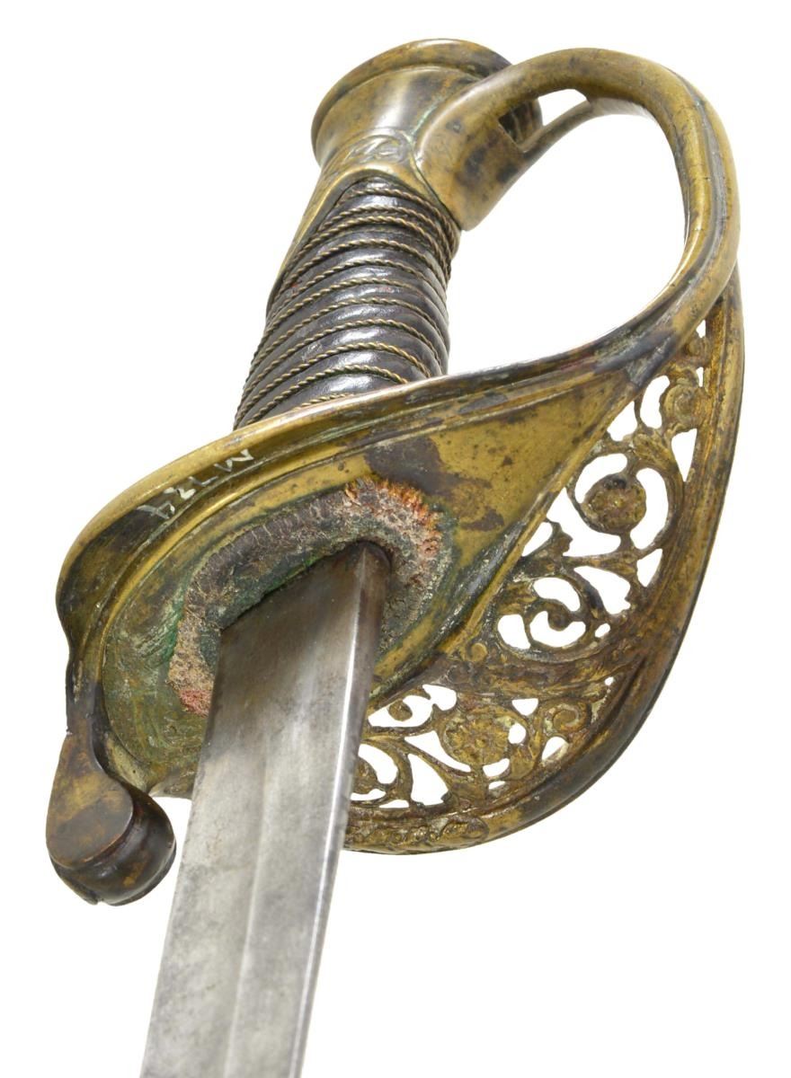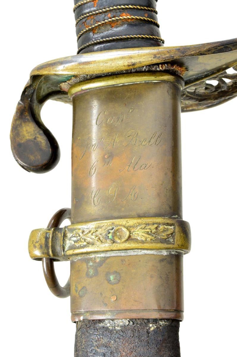 OFFICER SWORD ATTRIBUTED TO CAPT. THOMAS H. BELL 6TH ALABAMA, KILLED AT BATTLE OF SEVEN PINES. Classic Mitchell & Tyler, Richmond, VA retailed Boyle & Gamble manufactured sword with their characteristic fancy floral ring mounts, bulbous grip with fancier twisted wire. Engraved throat of scabbard: "Capt. / Jno A. Bell / 6th Ala / CSA". The only problem with this impeccable contemporary inscription is that there is not a Capt. Jno. A. Bell in the Confederate army much less the 6th Ala. The sword little doubt belonged to “Capt. Tho. H. Bell, 6th ALA”, killed at Battle of Seven Pines. The mystery was solved in forensic report by Nancy Rossbacher accompanying sword and available online