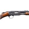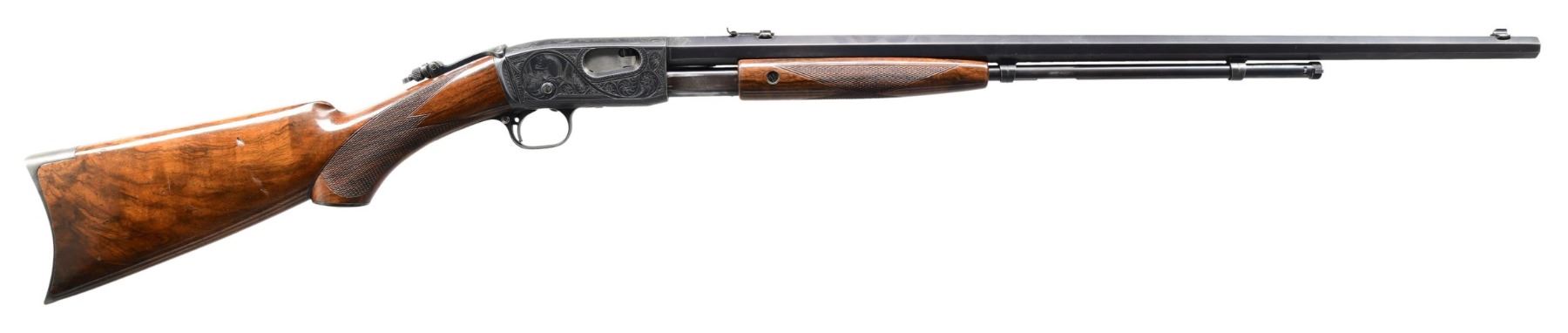 RIFLE. Cal. 22 S,L,LR. S# 62081. Bbl. 24" octagon. Original sporting bbl. sights w/ tang sight. Action has E grade factory engraving featuring a squirrel on right side w/ 2 cottontail rabbits on left sides. Scenes are surrounded by scroll engraving w/ fancy borders that extend to upper & lower receiver areas as well as breech end of bbl. Top of action has engraved inscription "Made For / Herbert W. Hegele MD / Portland / Oregon". Forearm & pistol grip stock of gloss finished fancy Circassian walnut. Features include point pattern hand checkering, crescent steel buttplate & plain hard rubber grip cap. Mfg. 1911. CONDITION: 90% lightly worn blue showing slide wear. Original wood finish shows spots of wear w/ scattered dents, small gouges, scratches & marks. Forearm is chipped at bottom of rear edge. Release button on bottom of mag tube is chipped. Good bright bore. PROVENANCE: The estate collection of Don "Duck" Combs. (24-2419/DS). CURIO. $7,000-9,000.