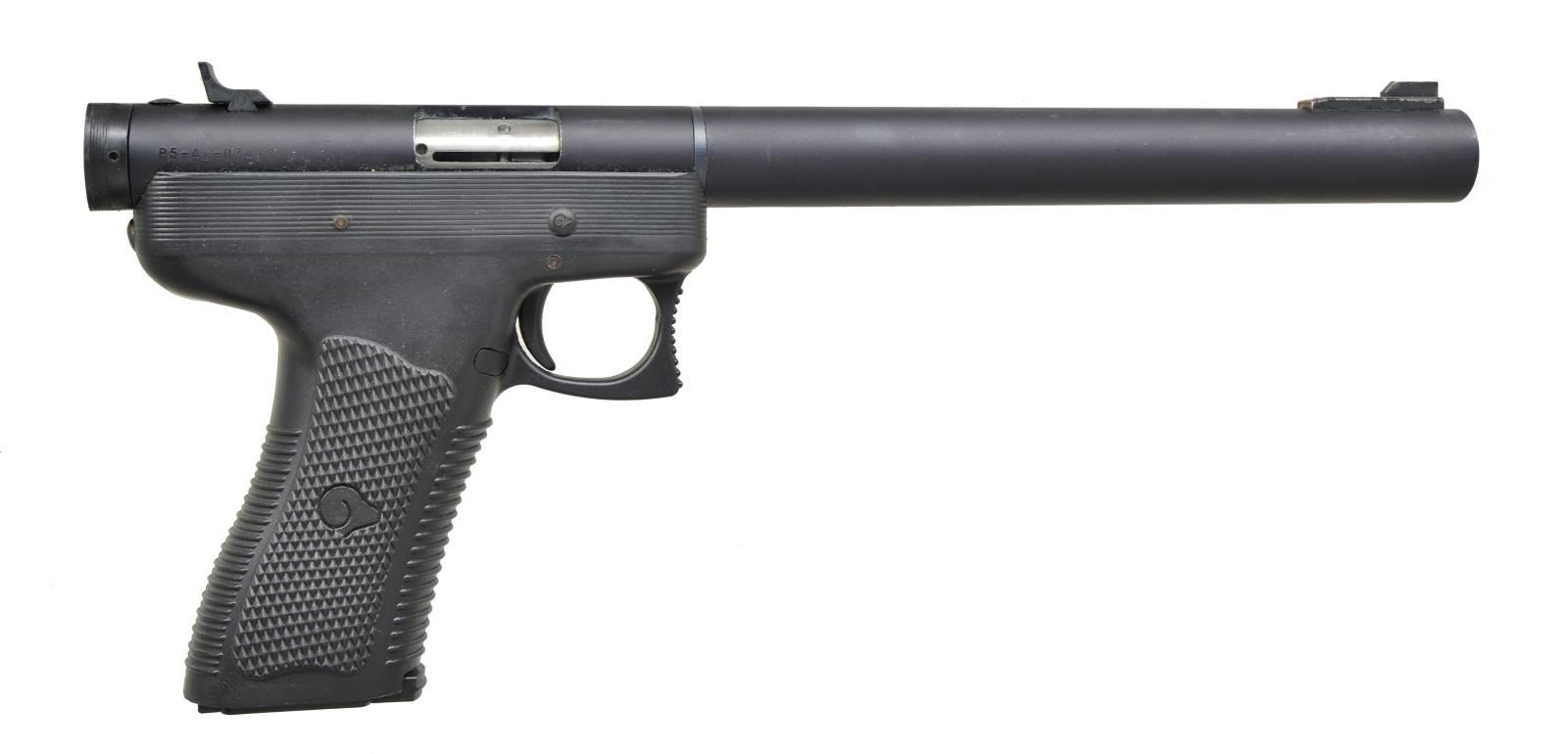 Cal. 22 LR. S# P54107423 (suppressor), P5-41-07423 (pistol). Bbl. 8". A light weight self loading rimfire pistol w/ an integral sound suppressor that weighs only 27oz. The suppressor is an early aluminum design by Precision Arms International built on a Ramline Exactor host. Fixed blade front sight w/ a drift adj. rear. Polymer lower w/ aggressively stippled grip & serrated trigger guard. Matte black finish on exposed metal surfaces. Left side controls. MAGS: 1 factory 15 rd. CONDITION: bore is shiny w/ strong rifling. Fire control mechanism appears to function correctly when cycled by hand. NATIONAL FIREARMS ACT SOUND SUPPRESSOR REQUIRING BATF TRANSFER BEFORE TAKING POSSESSION. FULLY TRANSFERABLE. (03-1552 & 22-1746/JZ). MODERN CLASS III. $300-500.