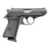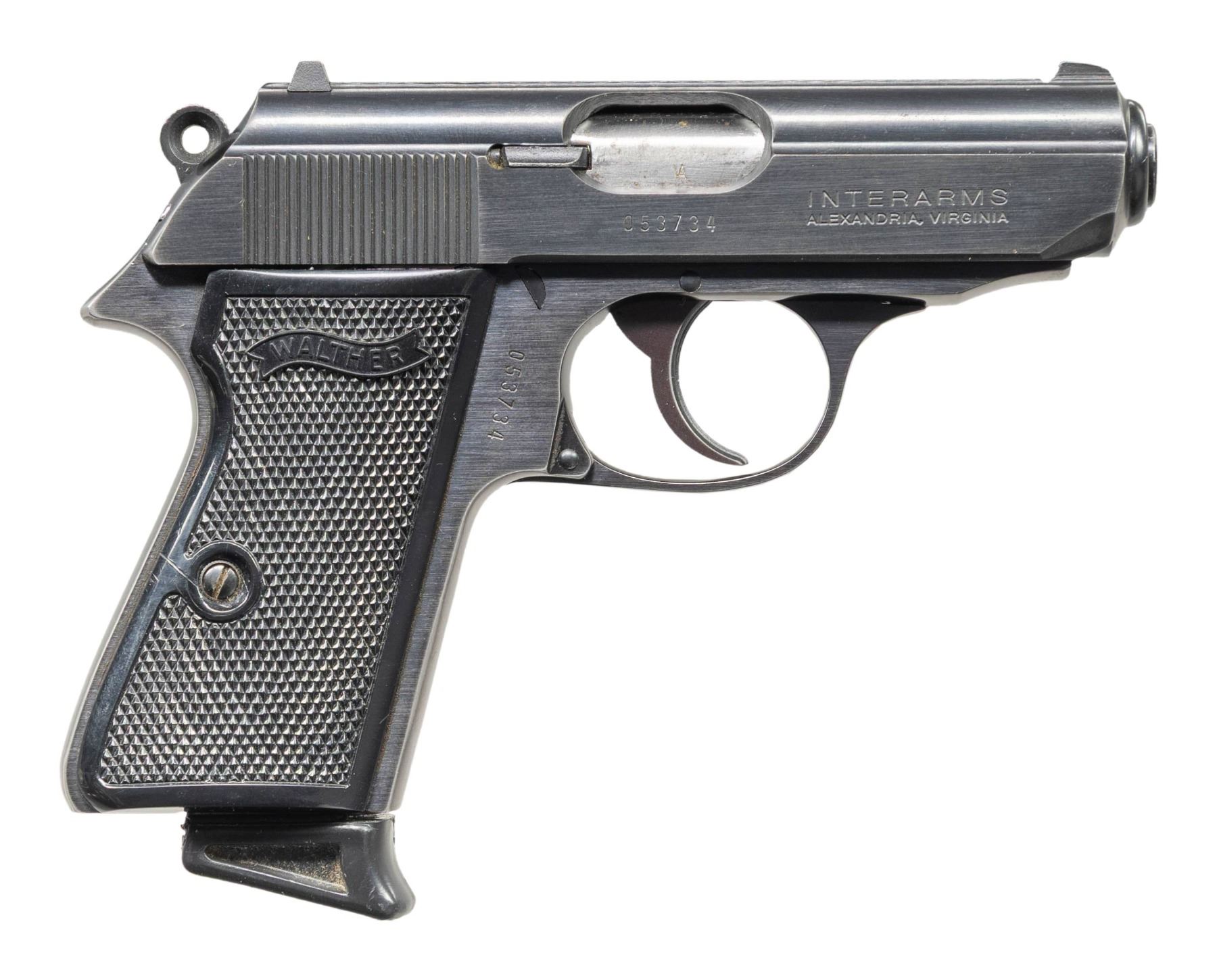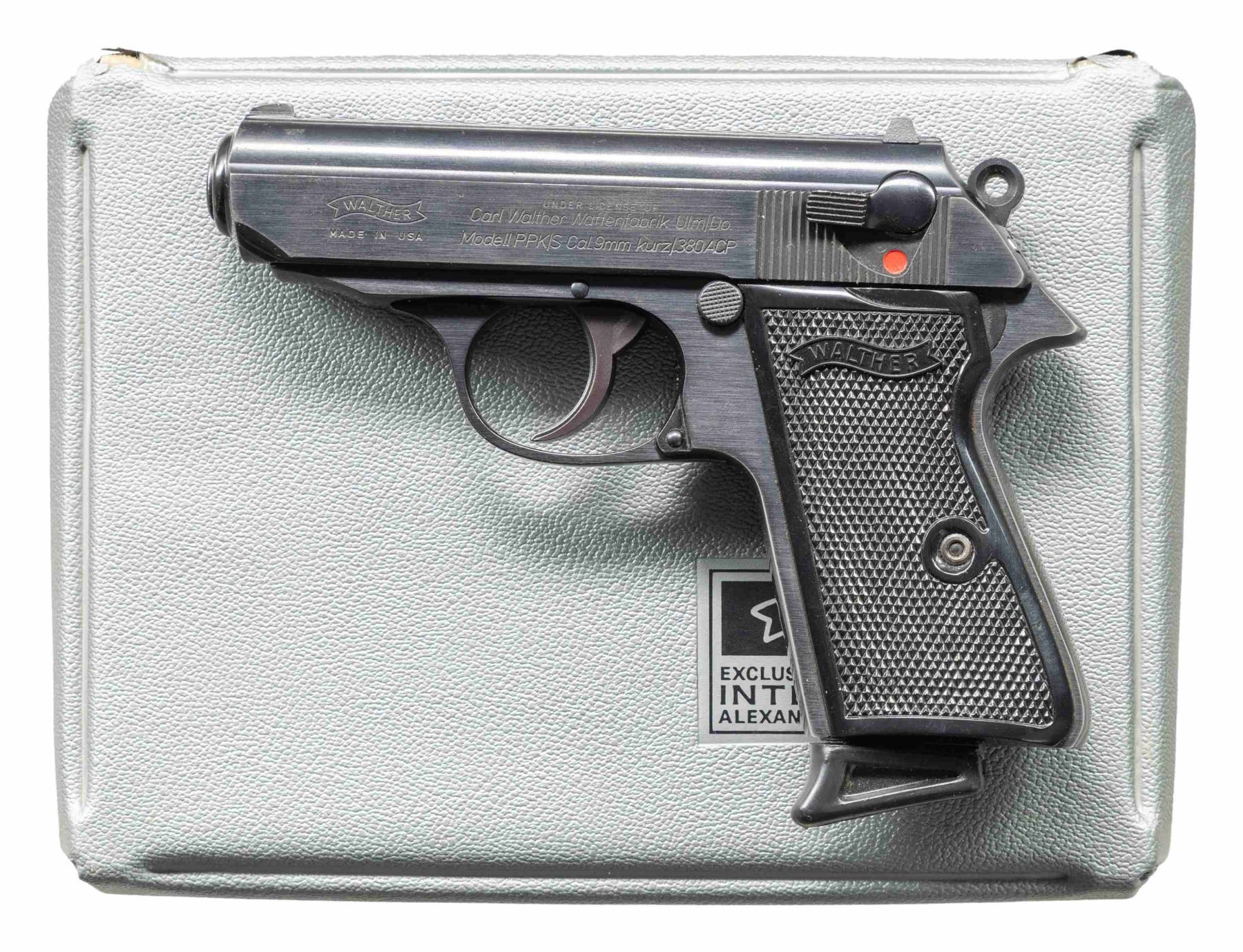 PISTOL WITH CASE. Cal. 380 ACP. S# 053734. Bbl. 3 1/4". Model PPK/S semi-automatic pistol mfg. by Interarms under license from Walther. Left side of the slide is marked with the Walther banner logo above "MADE IN USA", followed by "UNDER LICENSE OF" above Walther's information, as well as the model and cal. designations. Right side of the slide is marked with the S#, followed by "INTERARMS/ ALEXANDRIA, VIRGINIA". Metal components exhibit a blue finish overall, save for on the chamber area of the bbl., which is polished in-the-white. Frame is mounted with 2-piece checkered black synthetic Walther banner logo grips. Slide features a grooved matte rib, with an integral white dot blade front sight and dovetailed square notch rear sight. Matching numbers are present on the frame and slide. MAGS: x2 stainless steel 7-rd. mags., x1 with black synthetic grip extension. UNATTACHED ACCESSORIES: textured gray plastic Interarms case containing manual. CONDITION: metal components retain the majority of their original factory blue finish, exhibiting some light to mild edge wear, as well as some scattered spots of light surface oxidation. Mirror bore, exhibiting streaks of hardened grease, while retaining strong rifling throughout. Proper manual mechanics, to include the safety / decocking lever. Grips show some light wear and minor superficial handling marks. Case is very good overall. PROVENANCE: Paul Birkenstamm Collection. (25-6308/MLW). MODERN. $400-600.