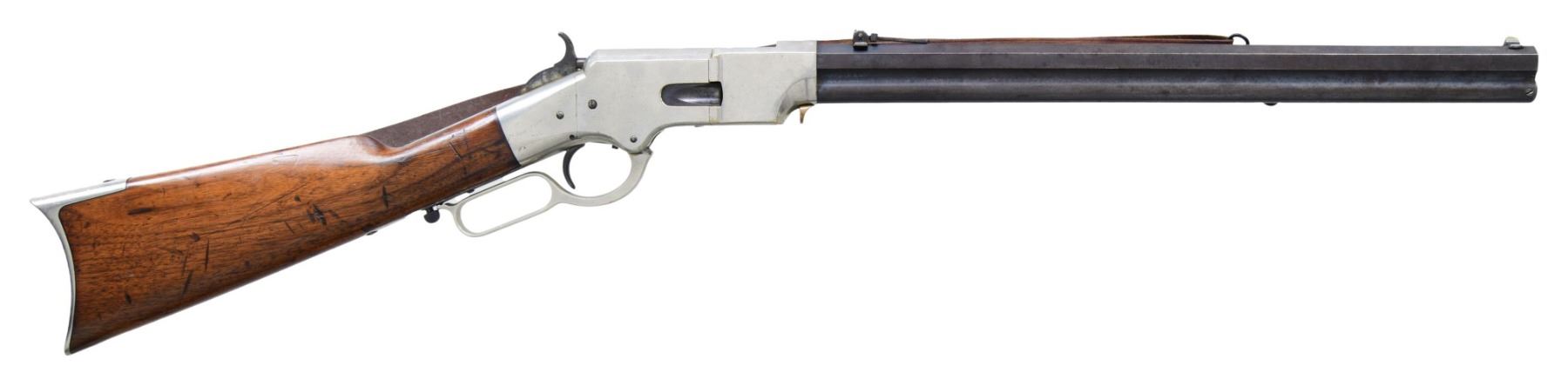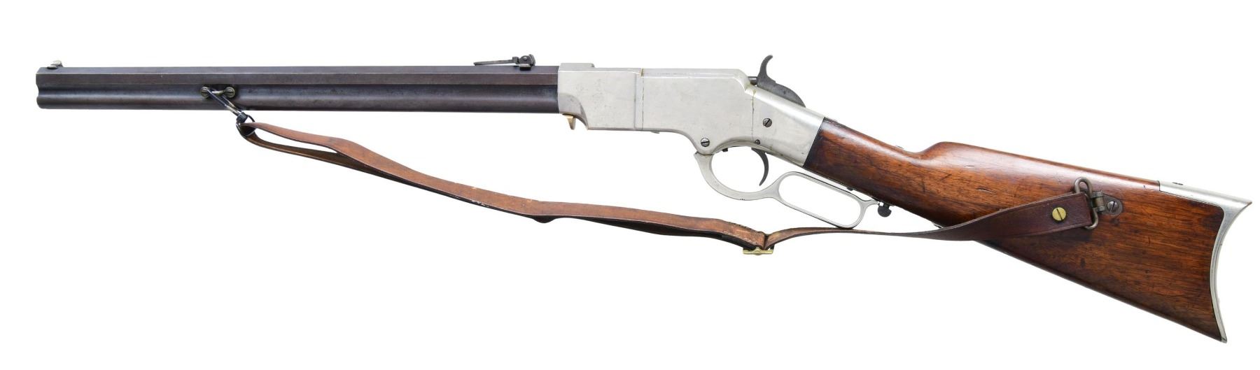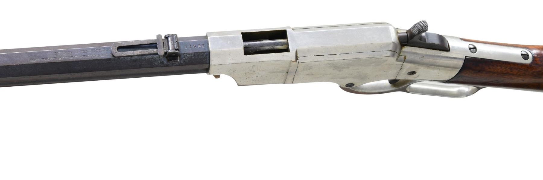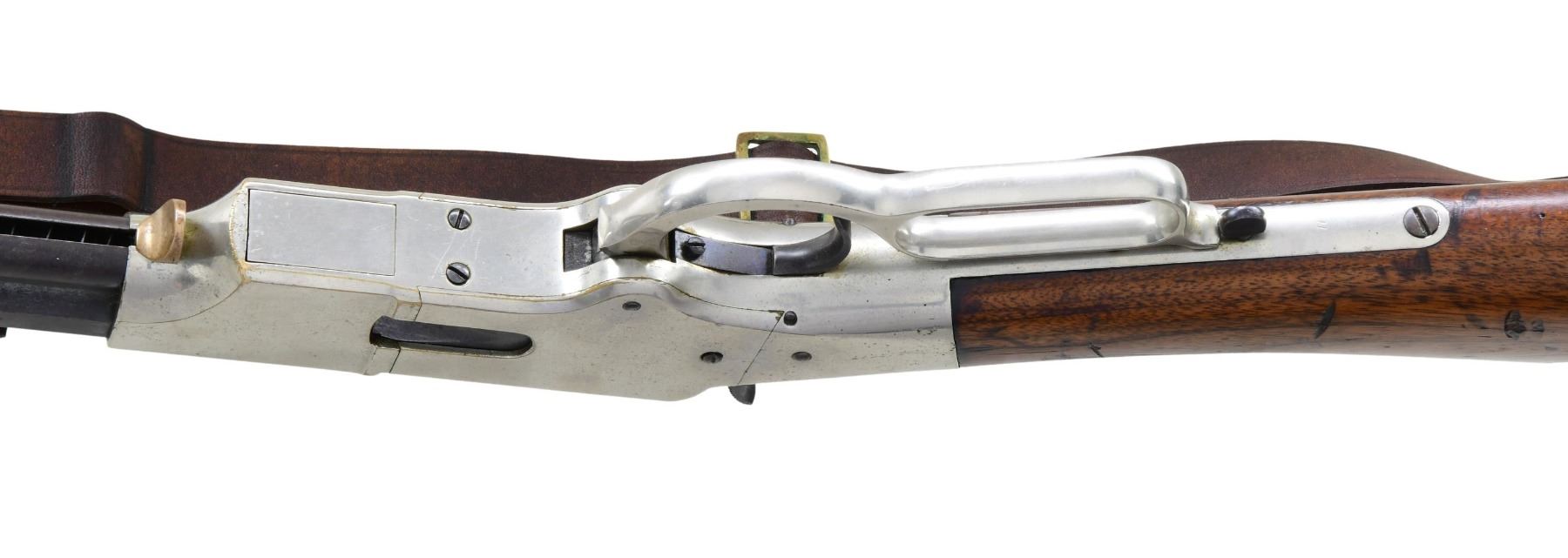 GATE & SHORT BARREL. Cal. 44. S# 11892. This late serial number Henry rifle conforms to other 5th variation rifles, other than shortened uncrowned 19 1/8" octagonal barrel with correct Henry's Patent 2-line address with loading gate added to frame and magazine capped like a 1866 Winchester rifle. Matching serial number 11892 Found on barrel, lower tang under wood, upper tang channel of buttstock, and inside top edge of buttplate. Sling swivels on the left side, front sight is 1866 style German silver blade on blued steel base inset in dovetail, rear sight is 1000 yard Henry. Nickel plated frame and butt plate, varnished straight grain walnut stock. CONDITION: very good to fine overall, all matching and complete as configured, retaining 95% plus of an old nickel plate, barrel retains over 20% original thinning blue. Mechanically fine, good six groove rifling. Attached sling is reproduction. (01-26425/JS). ANTIQUE. $3,000-6,000.