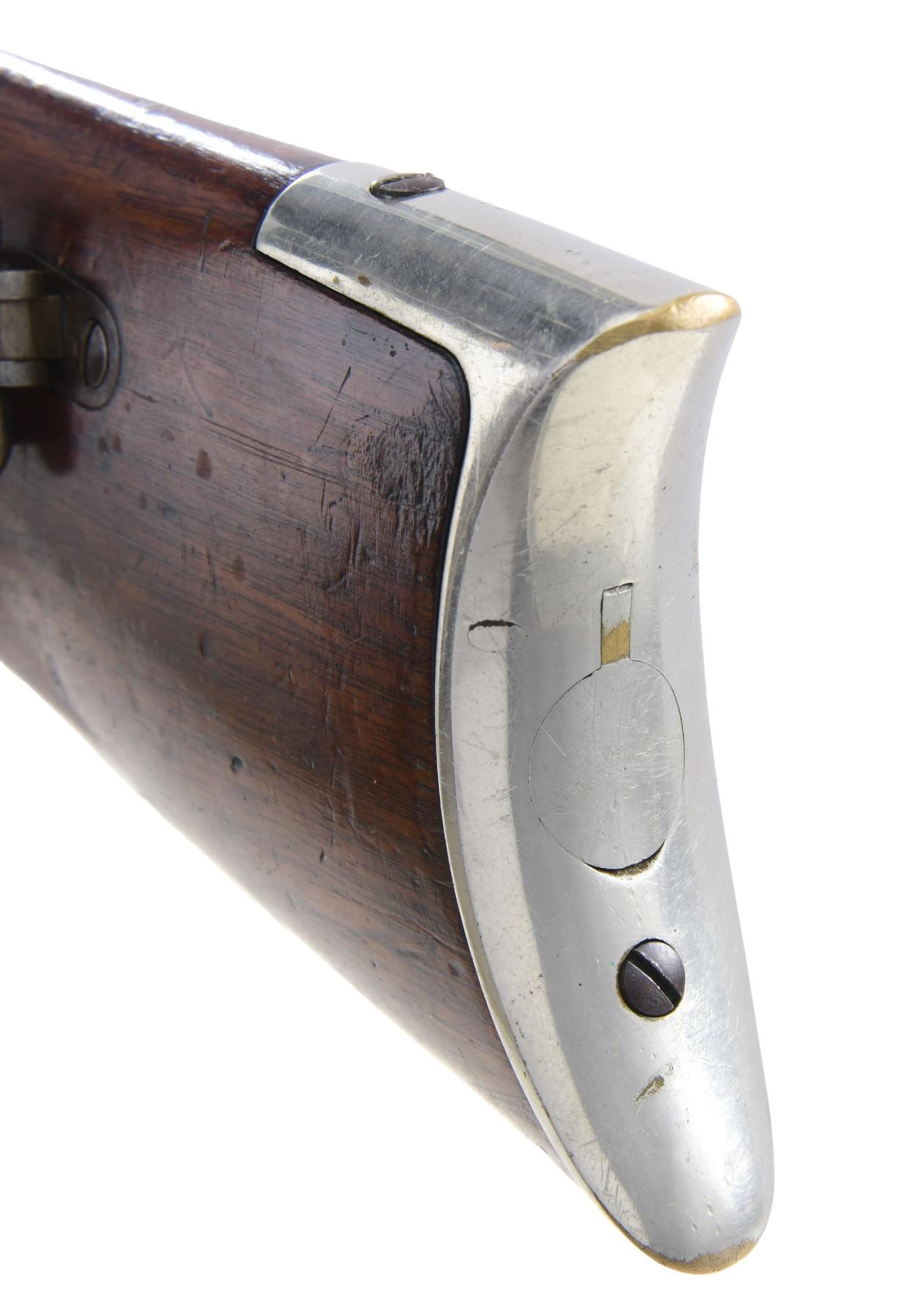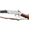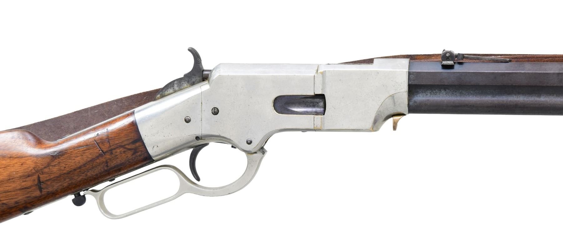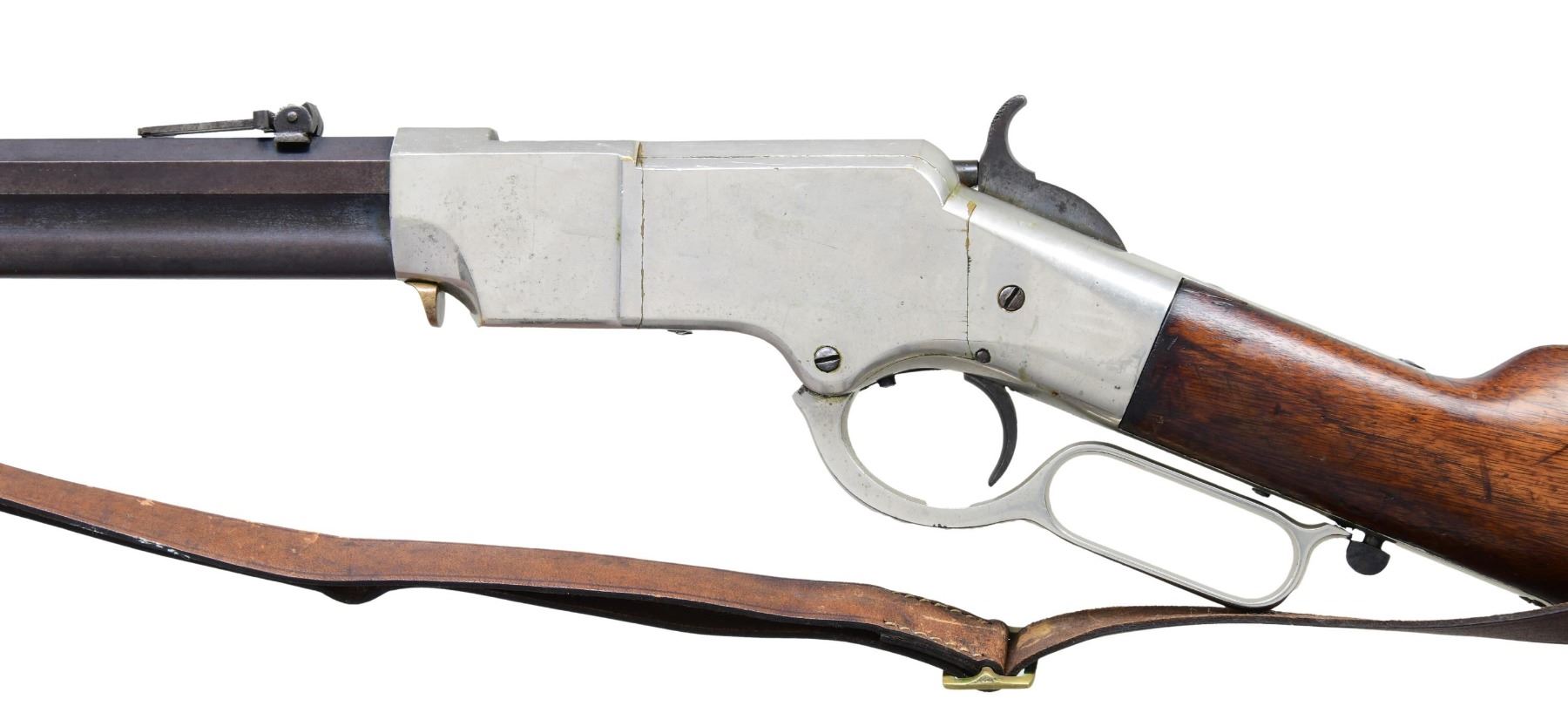 GATE & SHORT BARREL. Cal. 44. S# 11892. This late serial number Henry rifle conforms to other 5th variation rifles, other than shortened uncrowned 19 1/8" octagonal barrel with correct Henry's Patent 2-line address with loading gate added to frame and magazine capped like a 1866 Winchester rifle. Matching serial number 11892 Found on barrel, lower tang under wood, upper tang channel of buttstock, and inside top edge of buttplate. Sling swivels on the left side, front sight is 1866 style German silver blade on blued steel base inset in dovetail, rear sight is 1000 yard Henry. Nickel plated frame and butt plate, varnished straight grain walnut stock. CONDITION: very good to fine overall, all matching and complete as configured, retaining 95% plus of an old nickel plate, barrel retains over 20% original thinning blue. Mechanically fine, good six groove rifling. Attached sling is reproduction. (01-26425/JS). ANTIQUE. $3,000-6,000.