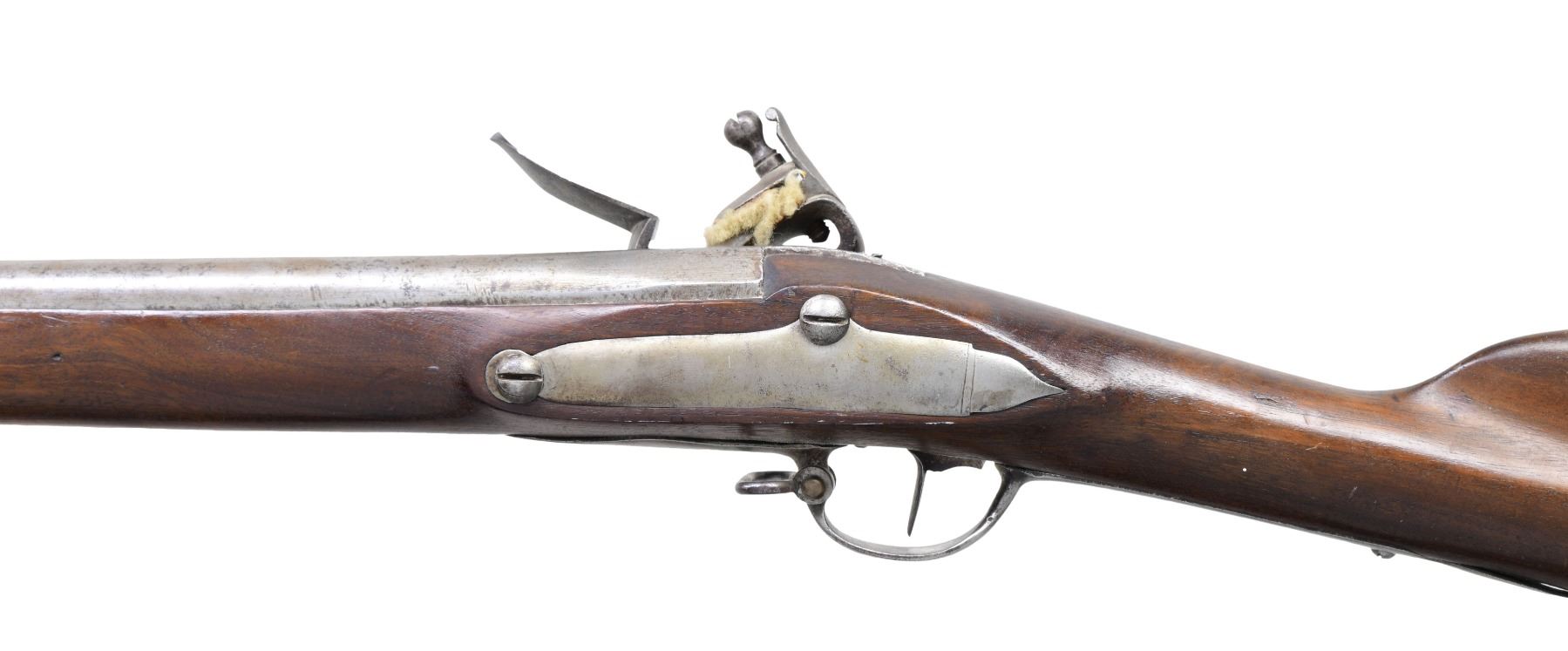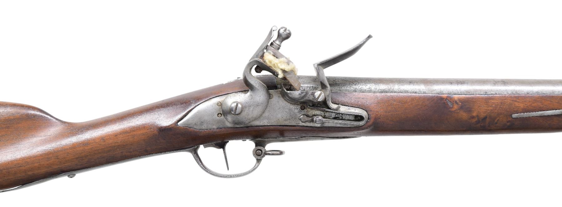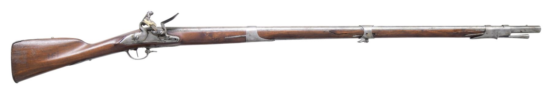 wDUTCH-GERMAN, IRON MOUNTED, FLINTLOCK INFANTRY MUSKET, ca. 1780. Cal .69. NSN. 42" tapered round, sighted, smooth bore barrel has 1-inch octagonal breech section is stamped w/ "K/Shield" (under stock at breech) and marking " I 7 " aft of front sight. Round-faced lock has bridled pan and rounded frizzen, robust swan-neck cock and stamped w/ Henneburg-Suhl "Chicken" / "WK" maker's mark in shield, between frizzen spring arms. 3 spring-retained barrel bands w/ sling swivel), 3 screw unmarked buttplate and original trumpet shaped iron ramrod. Mounted in a full-length walnut stock, nicely fluted wrist and comb, w/ initials "HFI" carved in right side and "S" in left. The butt end under the plate is marked in heavy pencil "B/S". CONDITION: musket shows little evidence of hard battle or field use. Cleaned metal surfaces have aged gray patina with light to moderate scattered pitting. Wood is generally sound and has much of what appears to be an early added finish with no evidence of sanding. Some cracking and losses on left side forestock at middle and front barrel bands. Lock is functional. Bore is very good. (01-26535/WD). ANTIQUE. $2,500-3,500.