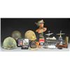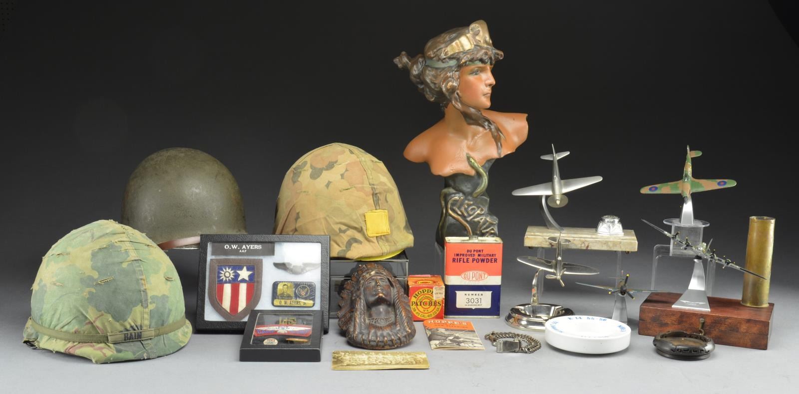 1) 3 US M1 helmets w/ composite liners. The first is front seam, flexible bail w/ green web straps & brown leather chinstrap. Green painted liner. Suspension is present. Headband is not present. The second is front seam, flexible bail w/ web strap. Cloth reversible camouflage helmet cover. Liner has been painted yellow w/ red stripe on top, black trident on top. Suspension is worn but complete w/ period headband & leather chinstrap. The third helmet is rear seam, flexible bail post war helmet w/ reversible camouflage helmet cover. Helmet straps are not present. Green painted liner. Suspension & headband are present. / CBI leather edged theatre shoulder patch w/ leather name tag for O.W. Ayers AAF. Pilots wings & identity badge for O. W. Ayers Jr. w/ photograph. Embroidered USO Camp shows eagle shoulder tag. Intertwined gold colored USO insignia. USO badge. Rectangular eagle motif Camp Shows badge. / White glass ashtray w/ octopus motif & “6167TH / SUPPORT SQ. / K-14 55-56 / KOREA”. / French dagger suspension chain. / Postcard of early baseball team w/ wasp (?) shoulder insignia dated “1914”. / Plaster brown finished Indian head figurine. / Empty 37mm shell casing. / Wooden target shooters cartridge box. Quick Loader by American Can Co. plant duster. / Shipping tag for KNIFE, FIGHTING M3 BOKER MFG, Rock Island Arsenal 1944. / Glass display case measures 8" X 8", 4" deep. / Plaster bust of Cleopatra approx. 16" tall w/ serpent motif. / Silver colored cast ashtray w/ WWII vintage fighter plane motif. Fighter plane has general resemblance to British Spitfire. / Alloy stylized WWII vintage fighter plane mounted on marble base w/ incomplete inkwell, part of desk set. / 3 Modern WWII aircraft models Curtis P-40, Hawker Hurricane & Boeing B17. CONDITION: items appear in generally good condition. Tins may have flaking finish but generally legible markings. Bust of Cleopatra has very light edge wear but retains most of its painted finish. Aircraft items are in good to very good condition except Hawker Hurricane; has detached propeller blades & horizontal stabilizer which are present. (02-15458/RW).