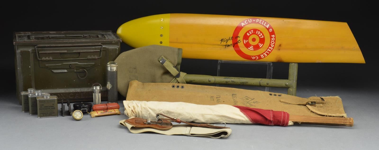 2) VARIOUS US MILITARY & RELATED ITEMS. This lot consists of a 50 cal. ammo can. / 2 Full & 1 empty 2 oz. bottles of lubricant. / 1 Sm. rubber snake bite kit. / 1 Military style compass. / 1 Pin on compass. / 1 Military flashlight by Eveready. / 1 Match safe. / 1 Doughboy prophylactic. / 1 M1 clip. / 1 Sling for carrying a military drum. / 1 WWII issue GI shovel w/ canvas cover. / 1 US Army signal flag kit in canvas holder. / 1 Propeller advertising piece from Acu-pella Propeller Co. established 1927. CONDITION: all items generally show light to moderate wear. Propeller piece shows very light wear. (02-15460/BF).