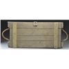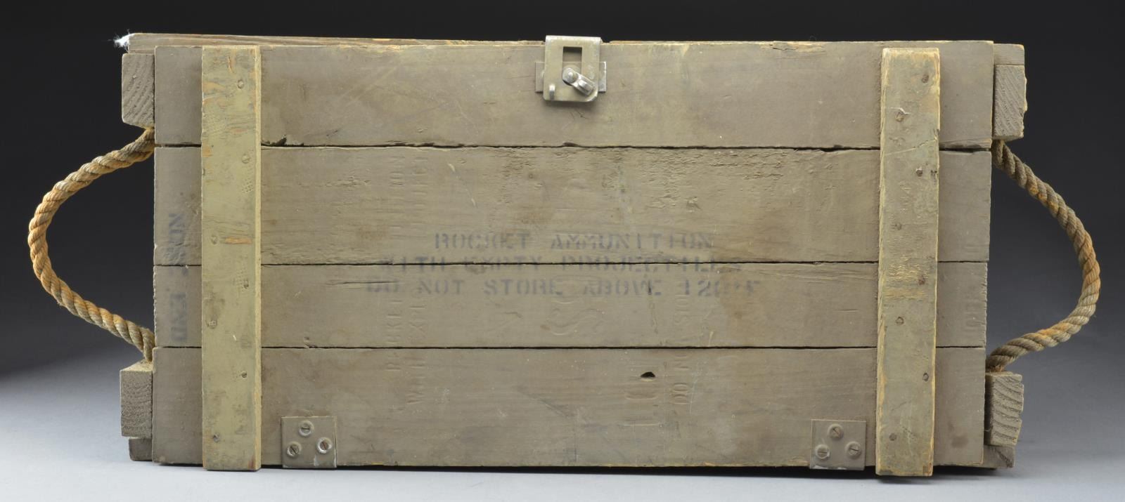 3) US KOREAN WAR VINTAGE WOODEN ROCKET CRATE FOR 3.5" ROCKET LAUNCHER. Wooden crate approx. 29 1/2" X 14" X 7" painted in gray-green color dated 2-54 & was made to contain 3 practice rockets for 3.5" "Super Bazooka". Crate has rope handles & blue paint at corners signifying non-explosive material used for training. CONDITION: crate has wear & loss of finish. Markings are generally legible. PROVENANCE: Collection of Brian C. Pinkerton. (02-15461/RW). $350-700.