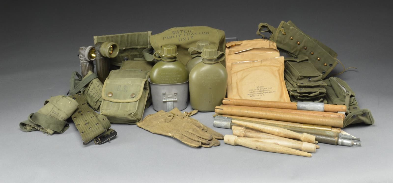 FIELD GEAR, AMMUNITION POUCHES & BANDOLIERS PREDOMINANTLY RANGING FROM WWII THROUGH VIETNAM ERA. US canteen cup dated 1962. / 3 Green plastic 1 quart canteens. / USMC marked water purification canvas carrier w/ 8 filters dated 1954. Water purification unit is not present. / 3 Belt first aid kits dated 1943, 1945 & undated. Kits contain a varied assortment of bandages, antiseptics, iodine, etc. / 2 Green angle neck flashlights. / 5 Turned hardwood tent pegs. / Collapsible poles for shelter halves. / USMC marked 5 gallon water bladder dated 1945 w/ green canvas USMC carrying bag. / Entrenching tool carrier M1943 marked "US". / Float bladder in original package. / Pair of green canvas USMC marked leggings dated 1950. / Green pistol belt w/ center grommets. / 20 Rd. M14 mag. marked "HR-R". / 3 Canvas USMC single mag. pouches for M14. / 3 Canvas US single mag. pouches for M14. / XM3 bipod for M16 rifle w/ carrying case. / Numerous cloth bandoliers for M1 Garand, M14 rifle & M60 MG. CONDITION: mostly good except for items in original packaging. (02-15896/RW). $600-800.