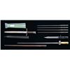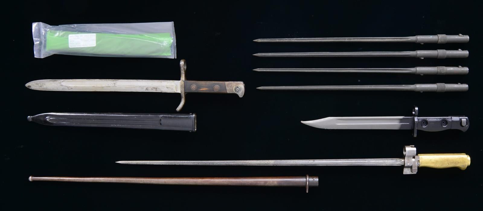 6) British L1A4 w/ 7 7/8" fullered blade. All metal bayonet is marked on grip "L1A4" w/ S#. Gray non reflective blade; balance of parts dull black; also includes original sealed pouch marked "SCABBARD DEC1990 DON B54 RAOC PRIMARY PACK". CONDITION: bayonet in very good condition w/ light high point wear.