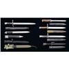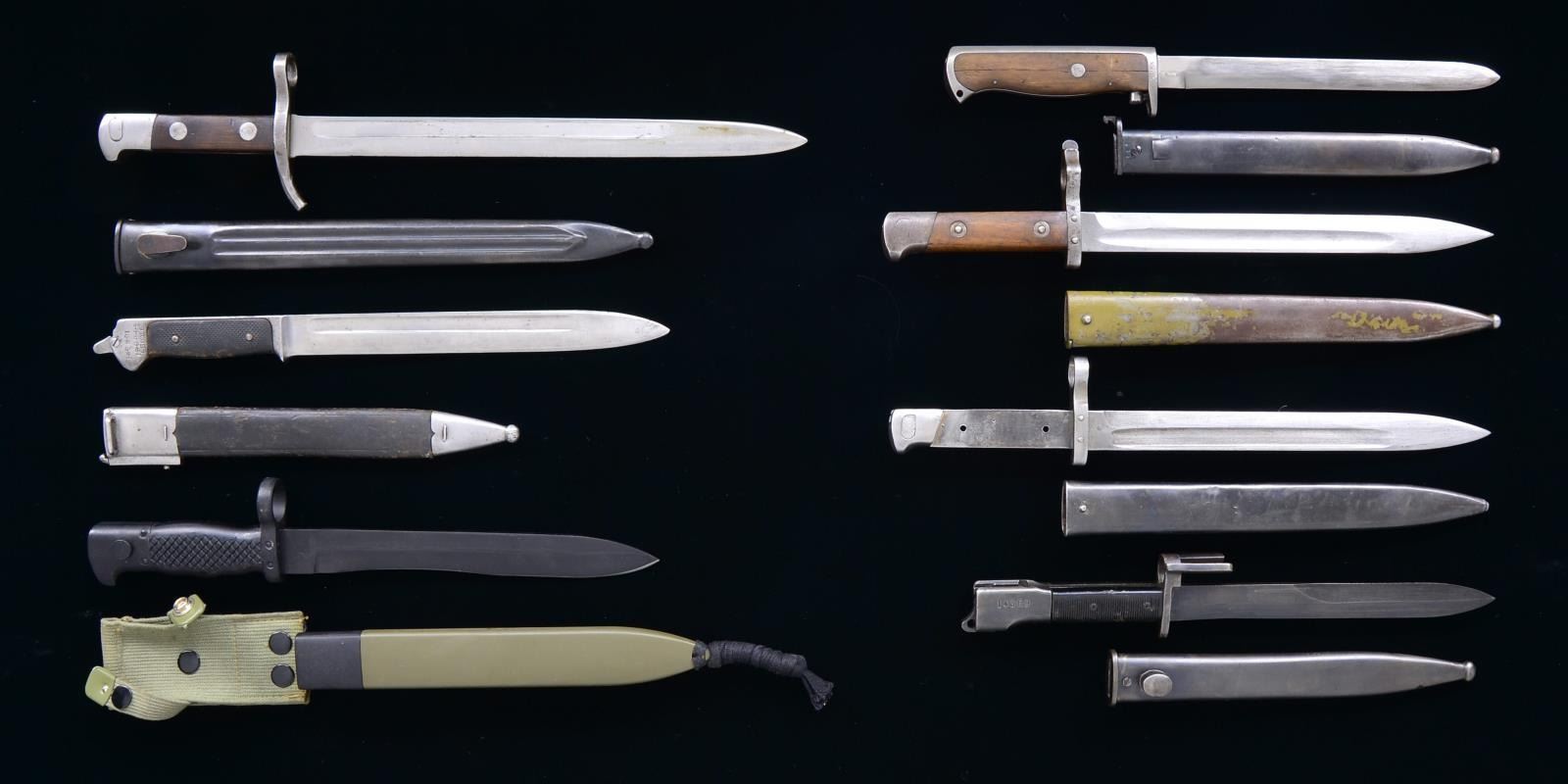 11) Austrian Model 1895 bayonet w/ 9 5/8" fullered single edge blade w/ inverted cutting edge. Blade is marked on right ricasso "F.G.GY." indicating Hungarian mfg. Grips are not present. Steel scabbard. CONDITION: metal has wear, oxidation & scratches. Blade of bayonet is slightly bent. Blue steel scabbard has wear, dents & scratches throughout. (02-16813-10/RW). $700-900.