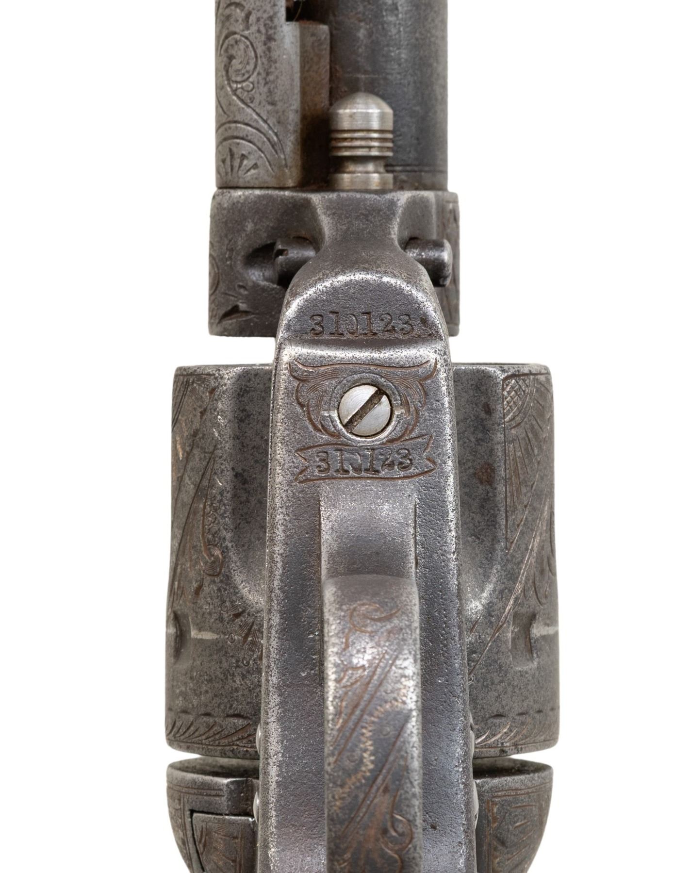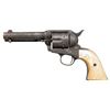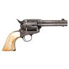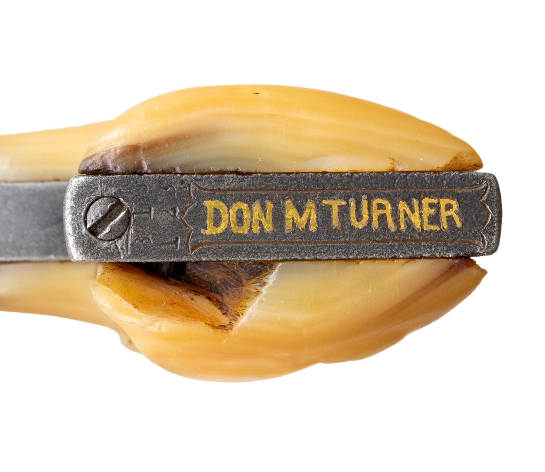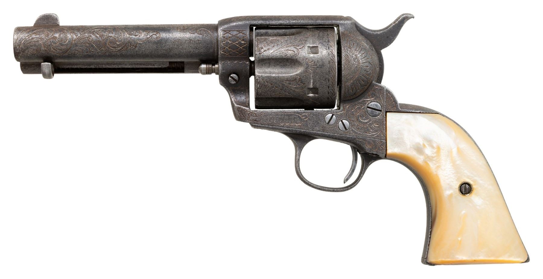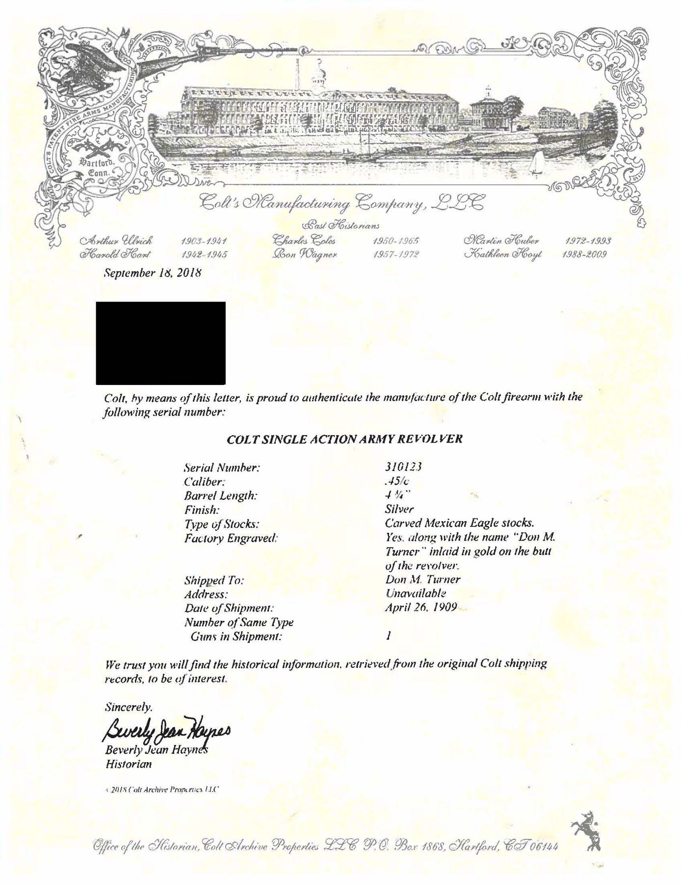 REVOLVER WITH DOCUMENTED GOLD INLAID INSCRIPTION TO FORMER NEW MEXICO DEPUTY SHERIFF, DON M. TURNER. Cal. 45 Colt. S# 310123. Bbl 4 3/4" with blade front sight. Revolver features Helfrict style 75% coverage factory engraving. Bottom of butt has factory gold inlaid "DON M TURNER". Revolver is stocked with factory fitted 1 piece mother of pearl Mexican eagle & snake grip. Don M. Turner was once a Sheriff's Deputy in New Mexico who was hired by Secretary A.B. Fall of the Interior department to protect cattle interests there. Included research of Newspaper article copies and crew/ passenger lists indicates Turner often travelled to other countries such as Nicaragua and Honduras. One article even indicates he was once held by immigration authorities until it could be determined that he was actually a U.S. Citizen. UNATTACHED ACCESSORIES: Colt fatory letter listing the following: Serial Number: 310123 / Caliber: 45/c / Barrel Length: 4 3/4" / Finish: Silver / Type of Stocks: Carved Mexican Eagle stocks / Factory Engraved: Yes, along with name "DON M TURNER inlaid in gold on the butt of the revolver. / Shipped To: Don M Turner / Address: Unavailable / Date of Shipment: April 26, 1909 / Number of Same Type Guns in Shipment: 1". Also included are Copies of newspaper articles pertaining to Turner. Passenger references to return trips from South American Countries. CONDITION: overall consistent with what you would expect to see from guns that spent much time in Central / South America. Original silver plating no longer present. Metal is a gray / brown patina with evenly distributed oxidation & pitting. Sharp corners have rounded from cleaning. In sharp contrast, gold inlay on butt is strong & completely intact. Grip is well worn with numerous small losses. Large chip missing from right side at toe. Dark bore with clearly visible rifling. Mechanically sound. A very interesting revolver worthy of further research. (25-6132/BH). CURIO. $15,000-25,000