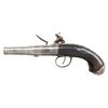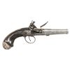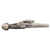 PISTOL BY LOUIS LAMOTTE WITH SILVER MOUNTS. Cal. 60. S# NSN. 10" overall this pistol has 3-3/4" cannon turned screw off barrel that is unmarked. Breech with integral flint lock on right side is engraved "Louis Lamotte" "a' St. Etienne" (probably working 1747-1791) on bottom tang. Area under lock is engraved "Balthazar Granier" "a. Smirne" (a Turkish retailer ?). Lock features round bodied reinforced cock, rounded pan and bridled friction frizzen, with feather spring that mounts at center of lock and curls under pan. Trigger guard slides to act as a safety. Burl figured European walnut knobbed pistol grip stock has some relief carving behind barrel tang and silver grip cap of a lion's face which has London hallmarks for 1754, Sterling and with maker's mark "PL". CONDITION: fair to good. Barrel and action cleaned to silvery gray brown. Stock shows considerable wear and repairs on grip. Silver is good. Bore is rough. Mechanically good. Trigger guard safety loose. PROVENANCE: Estate Collection of Nicholas Apergis. (01-27555/MGM). ANTIQUE. $1,000-1,500.