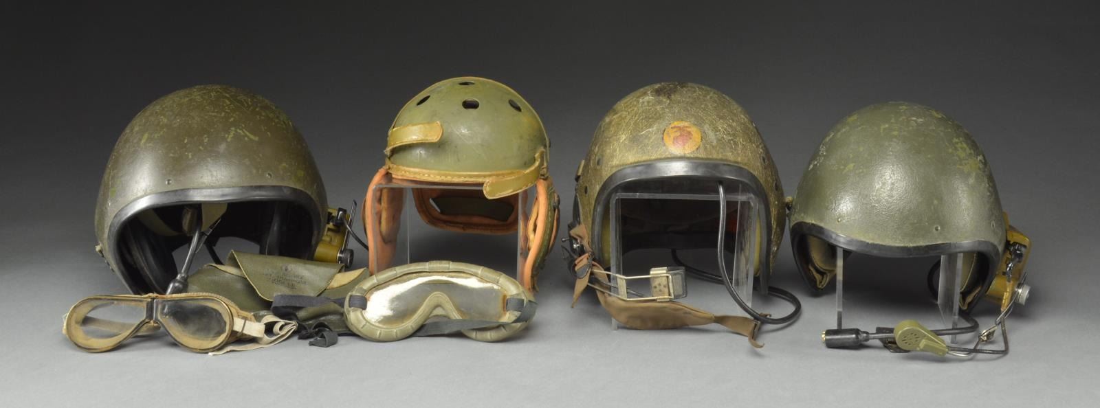 3) US MARINE CORP MC-1. Helmet is marked inside "Gentex" "T-5 MEDIUM". Marked on outside front w/ approx. 1 3/4" circular decal brown "globe & anchor" w/ tan background. Suspension is marked "MC-1 MEDIUM" w/ Gentex logo & contract #. Has externally mounted microphone & attaching cable w/ 2 plugs. Helmet is complete w/ suspension & earpieces & has appearance of "fiberglass" construction. CONDITION: helmet has light wear, staining & handling marks due to careful service use.