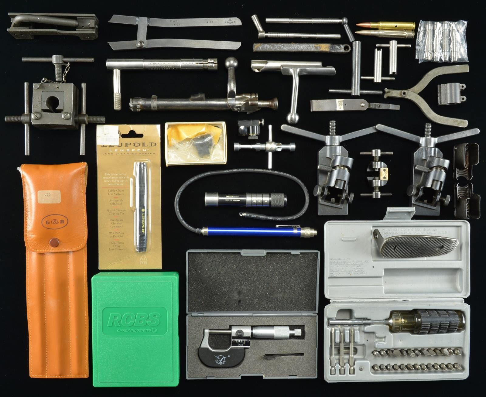 TOOLS AND ACCESSORIES. Items include but not limited to: Parker Hale 12 gauge chamber length measuring tool. / 2 Swiss issue front sight installation and adjusting tools marked K11 and K31. / Israeli "Drau" marked sight adjusting tool. / Finished "SA" marked combination screwdriver. / Lee Enfield front sight adjusting tool. / Bolt disassembly tool for M14 / M1 rifle. / M14 / M1 handguard pliers. / 2 M1 Garand five round clips. / M1 Garand Globe front sight conversion kit. / M1 Carbine gas cylinder wrench. / M1 Garand gas cylinder gauging tool. / 2 M1 Garand breech bore gauges. / 4 issue Cal. .30 head space gauges. / US Model 1903 Springfield bolt assembly without extractor. / US Model 1903 field test bolt. / US Model 1903 checkered milled buttplate. / Mosin Nagant bolt body with turned down handle. / Browning T Bolt aperture rear sight assembly. / RCBS 9.3x62 two die set. / Direct reading aerospace 1" bicrometer with case. / Imported gunsmith type screwdriver set with plastic case. / Shot gun cleaning rod. / brass rod with walnut handle. / G&H marked leather case. / Flexible extended bore light with / case. / Leopold lens pen cleaning system. CONDITON: items range from good to very good with wear and handling marks. (02-16807-10/RW). $400-600.