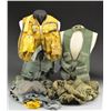 3) Air Force 1535 nylon survival vest w/ open mesh construction. Items w/ vest include tourniquet, fishnet, survival kit individual tropical, signal mirror, survival blanket & first aid dressings. CONDITION: vest has light wear, staining, scattered loose stitching & sm. hole in front; yet vest & contents appear to be in serviceable condition.