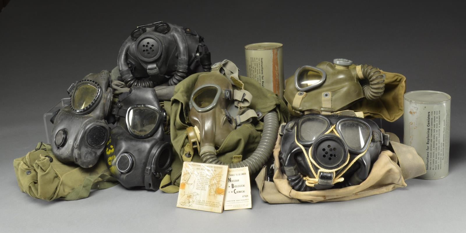 ACCESSORIES: other items include 2 sealed replacement canisters for WWII era Navy masks. Decontaminating kit M13 dated 7-66. Good mask M6 in sealed packet. A green canvas carrier marked "US" & "ARMY OPTICAL MASK", WWII era. Brown canvas carrier for early unknown mask marked on rear "FOR TRAINING PURPOSE ONLY". CONDITION: masks have wear, staining, hardening & cracking of flexible components w/ staining & wear on carriers. (02-15900/RW). $1,000-1,400.
