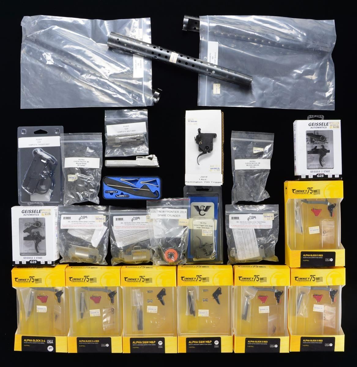 This Group contains parts and accessories for both handguns and long arms. Most are new in original packaging except as noted. 1.) 3 Timney triggers, ALPHA GLOCK 5 RED 3lb. pull. / 2.) 2 Timney triggers, ALPHA GLOCK S&W M&P 3lb. pull. / 3.) 1 Timney triggers, ALPHA GLOCK 3-4 3lb. pull. / 4.) 1 Timney triggers ALPHA GLOCK 3-4 RED 3lb pull. / 5.) 2 Geissele Automatics two stage triggers for AR15 and AR10 rifles. 4.5 lbs pull. / 6.) Wilson Combat TR-TTU AR15-AR10 tactical single stage semi-auto trigger. / 7.) JARD Inc. Remington 700 V complete trigger. / 8.) Unmarked RUGER 10/22 Complete trigger assembly and RUGER marked complete bolt assembly. / 9.) PERAZZI "MIRAGE" / MX-8 Firing pins & Spring kit. / 10.) Used Colt New Frontier .22LR spare cylinder. / 11.) Used Phoenix Arms .22LR Model HP22A complete slide assembly. / 12.) 2 Repro M-1 Carbine Recoil Checks. / 13.) 3 North American Arms Belt buckle Mini-revolver carriers. / 14.) 3 Mossberg Model 500 shotgun barrel heat shields. CONDITION: except as noted items are as new many if not most in factory packaging. Slight minor handling wear may be noted. PROVENANCE: The Collection of Gun Sport Ltd owned by Jon R. Thomas (02-20859/RW). $1500-3000.