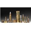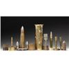 ONE AND TWO AND THE COLD WAR ERA. No.1: WW1 British 18 PDR shell casing with flared top with four added floral rosettes and shallow punched flaming bomb. Casing has been polished, returning to patina. / No.2: WW2 Australian Napkin Holder fashioned from the base of a 40mm shell. The holder appears to be made from two belt buckles and plated with a silver coating. One side has the Australian 1943 penny and the reverse has the crown ("Australian Commonwealth Military Forces"). / No.3: Pair of Brass Candlesticks fabricated from 40mm shell bases and using an inverted 50 cal. machine gun case. / No.4: Ashtray fashioned from 57mm M23A2 shell casing with an inert 50 cal. machine gun cartridge mounted in the center. / No.5: Ashtray fashioned from an approximately 57mm shell. / No.6: Interesting German decorative display fashioned from a 37mm shell, mounted on a salvaged steel range-plate which is marked "RICHTUNG / GESCH". The central shell is flanked by two inert projectiles. / No.7: U.S. 20mm shell and projectile mounted on a base which appears to be marble. / No.8: Inert steel 40mm projectile marked only with "75" on the base. / No.8: Vietnam Era Ashtray fabricated from a 40mm M203 shell. Encircled with a belt of 7.62 NATO blank fired casings. CONDITION: items show light wear with patina and handling marks with appearance of light cleaning. (02-25740/RW). NON-GUN. $100-300.