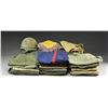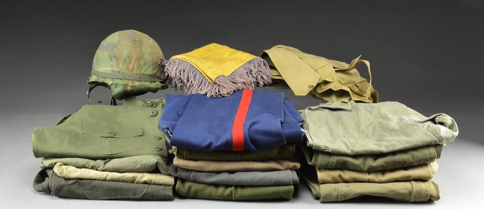 ACCESSORIES. Items include: blue dress trousers w/ red stripe. / 2 Pairs OD green Model 1951 wool field trousers. / Pair of khaki worsted trousers dated 1943. / Pair of unmarked khaki trousers. / Dark green herringbone trousers w/ 5 "U.S. MARINE CORPS" embossed snaps. / WWII era herringbone coveralls w/ snap type fasteners. Coveralls have notably faded appearance, loose stitching, sm. tears & staining. / Herringbone twill OD Special 1-piece coveralls w/ waist belt dated 1947. / Unmarked khaki long sleeve shirt w/ Technical Sergeant shoulder patch. / Dark green wool cold weather shirt. / Cotton sateen OG 107 shirt marked on left pocket w/ globe & anchor & "USMC". / WWII era green twill herringbone shirt w/ faint "USMC" on left pocket. / OD green cotton shirt marked "U.S.N." on left pocket. / OD green steel M1 helmet w/ woodland camouflage cover & camouflage band. / OD green jungle food bag dated September 1943. / 16 Plus assorted khaki & dark green neck ties. / Gold colored w/ purple fringe table covering measures approx. 24" X 34" marked "U.S. Marines" w/ globe & anchor. CONDITION: unless otherwise noted, condition runs from good to very good w/ light wear, fading & staining. (02-15923/RW). $400-600.