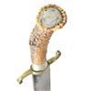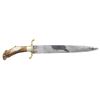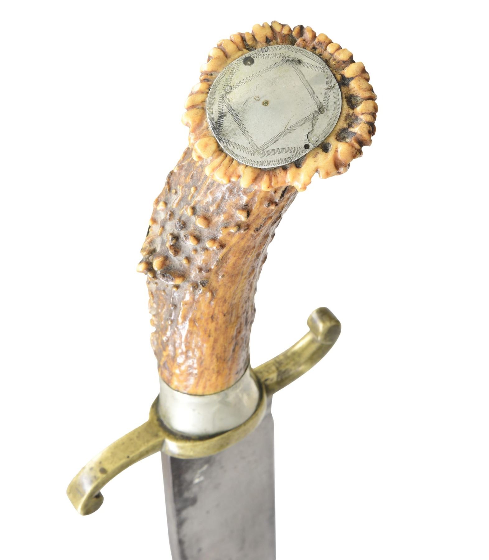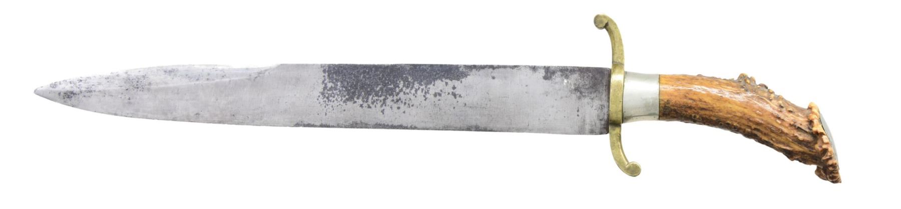KNIFE. 18.5" overall, 13" spear point blade, saber ground, 5.5" top edge sharpened at point, .31" thick. Unusual mix of 4" brass "S" cross guard, 1" tapered German silver ferrule, engraved German silver pommel cap & vacant lozenge shaped escutcheon pinned on carved crown stag handle. This unique knife is pictured on pictured on page 239 of James R. Johnston's "ACCOUTREMENTS IV". CONDITION: very good overall, blade has staining, dark area of light pitting. PROVENANCE: James R. Johnston collection. (02-23246/JS). NON-GUN. $5,000-6,000.